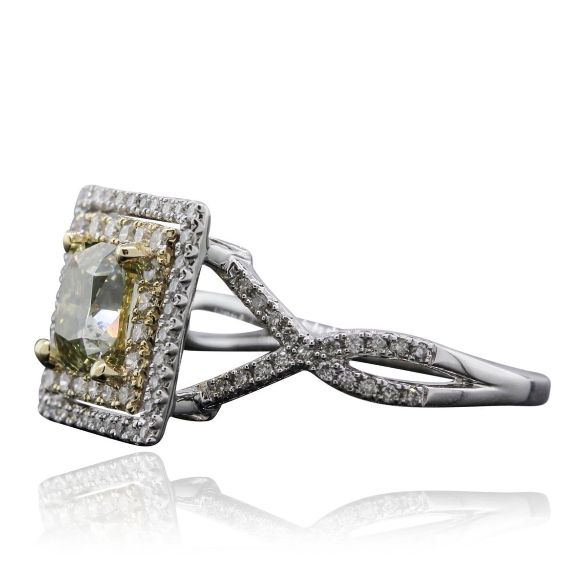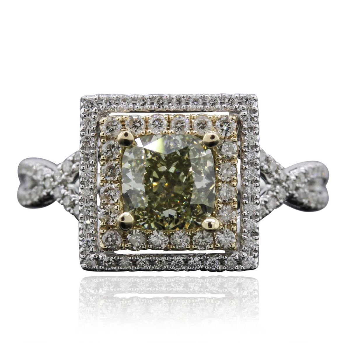 One electronically tested 14KT white gold ladies cast diamond unity ring. Condition is new, good workmanship. The featured diamond is set within two tiered diamond bezels supported by intertwining diamond set shoulders, completed by a one millimeter wide band. Bright polish finish with yellow gold accents. Identified with markings of "14K". Containing: One prong set cushion cut diamond, measuring 5.80 x 5.75 x 3.50mm (depth est.), 3.00% GTCF approximate weight of 1.20ct with a faint fluorescence. Graded in the setting. Clarity VS-1 Depth 60.9%Table 55.7% Ninety-Four prong set round brilliant cut diamonds, measuring 1.40 - 0.90 x 0.69mm (depth est.) approximate total weight of 94 Stones = 0.40ct. Graded in the setting. Clarity SI-1 to I-1 Color G - I Total Weight of Diamonds 1.60ct. Total Weight of Ring 3.33 grams. AIG Appraised at $12,360.00.