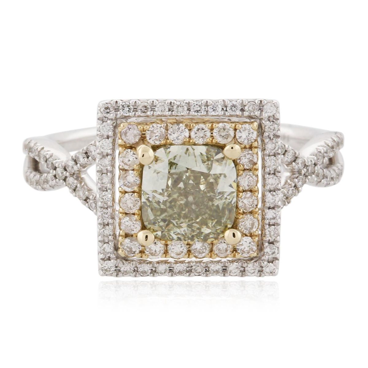 One electronically tested 14KT white gold ladies cast diamond unity ring. Condition is new, good workmanship. The featured diamond is set within two tiered diamond bezels supported by intertwining diamond set shoulders, completed by a one millimeter wide band. Bright polish finish with yellow gold accents. Identified with markings of "14K". Containing: One prong set cushion cut diamond, measuring 5.80 x 5.75 x 3.50mm (depth est.), 3.00% GTCF approximate weight of 1.20ct with a faint fluorescence. Graded in the setting. Clarity VS-1 Depth 60.9%Table 55.7% Ninety-Four prong set round brilliant cut diamonds, measuring 1.40 - 0.90 x 0.69mm (depth est.) approximate total weight of 94 Stones = 0.40ct. Graded in the setting. Clarity SI-1 to I-1 Color G - I Total Weight of Diamonds 1.60ct. Total Weight of Ring 3.33 grams. AIG Appraised at $12,360.00.