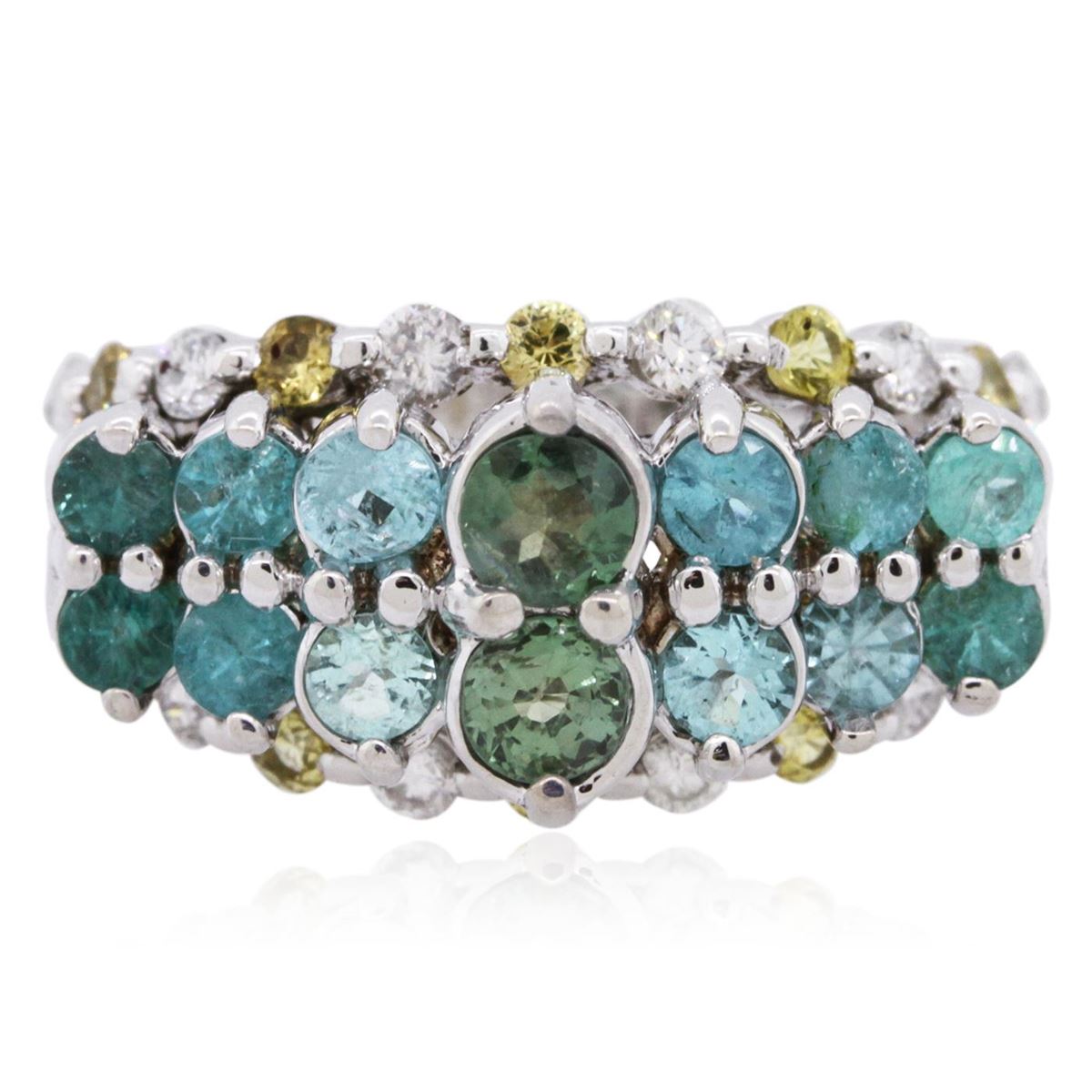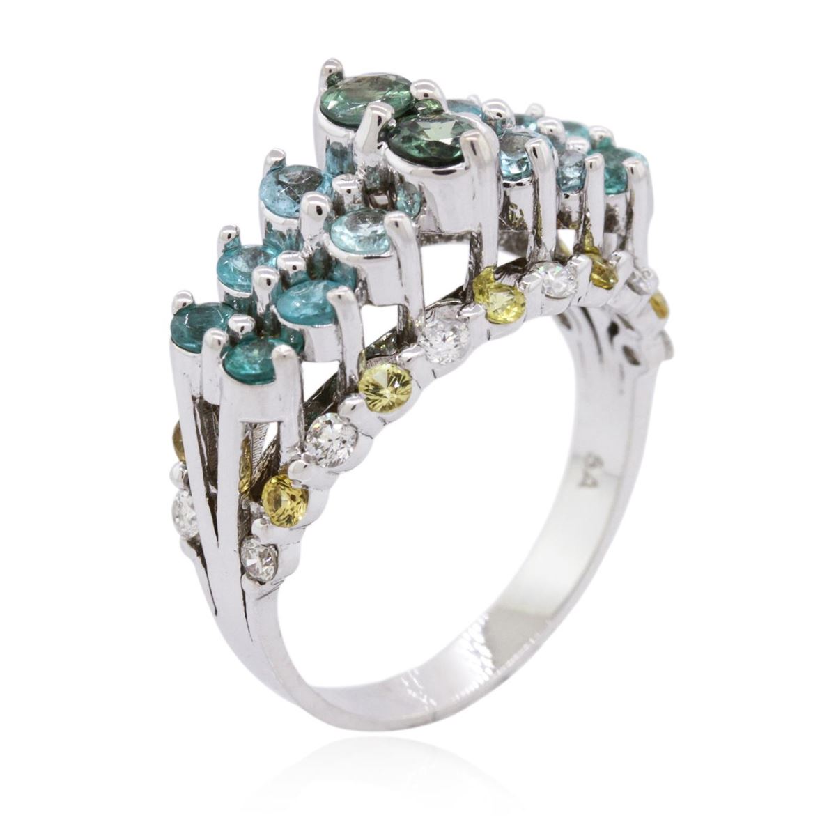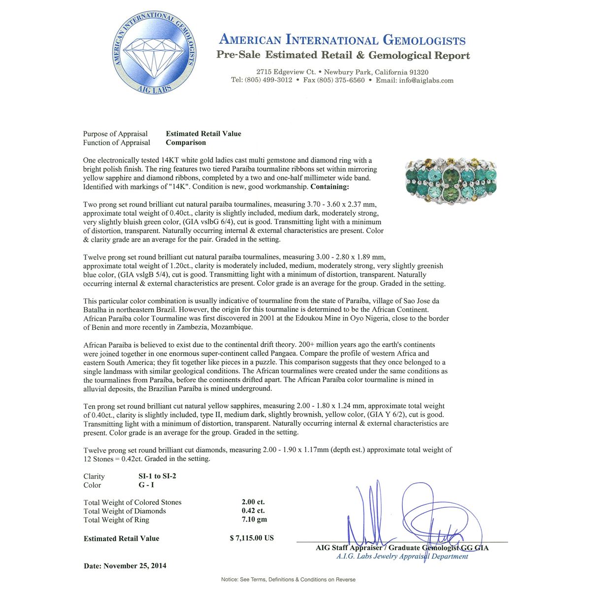 One electronically tested 14KT white gold ladies cast multi gemstone and diamond ring with a bright polish finish. The ring features two tiered Paraiba tourmaline ribbons set within mirroring yellow sapphire and diamond ribbons, completed by a two and one-half millimeter wide band. Identified with markings of "14K". Condition is new, good workmanship. Containing: Two prong set round brilliant cut natural Paraiba tourmalines, measuring 3.70 - 3.60 x 2.37 mm, approximate total weight of 0.40ct., clarity is slightly included, medium dark, moderately strong, very slightly bluish green color, (GIA vslbG 6/4), cut is good. Transmitting light with a minimum of distortion, transparent. Naturally occurring internal & external characteristics are present. Color & clarity grade are an average for the pair. Graded in the setting. Twelve prong set round brilliant cut natural Paraiba tourmalines, measuring 3.00 - 2.80 x 1.89 mm, approximate total weight of 1.20ct., clarity is moderately included, medium, moderately strong, very slightly greenish blue color, (GIA vslgB 5/4), cut is good. Transmitting light with a minimum of distortion, transparent. Naturally occurring internal & external characteristics are present. Color grade is an average for the group. Graded in the setting. This particular color combination is usually indicative of tourmaline from the state of Paraiba, village of Sao Jose da Batalha in northeastern Brazil. However, the origin for this tourmaline is determined to be the African Continent. African Paraiba color Tourmaline was first discovered in 2001 at the Edoukou Mine in Oyo Nigeria, close to the border of Benin and more recently in Zambezia, Mozambique. African Paraiba is believed to exist due to the continental drift theory. 200+ million years ago the earth's continents were joined together in one enormous super-continent called Pangaea. Compare the profile of western Africa and eastern South America; they fit together like pieces in a puzzle. This comparison suggests that they once belonged to a single landmass with similar geological conditions. The African tourmalines were created under the same conditions as the tourmalines from Paraiba, before the continents drifted apart. The African Paraiba color tourmaline is mined in alluvial deposits, the Brazilian Paraiba is mined underground. Ten prong set round brilliant cut natural yellow sapphires, measuring 2.00 - 1.80 x 1.24 mm, approximate total weight of 0.40ct., clarity is slightly included, type II, medium dark, slightly brownish, yellow color, (GIA Y 6/2), cut is good. Transmitting light with a minimum of distortion, transparent. Naturally occurring internal & external characteristics are present. Color grade is an average for the group. Graded in the setting. Twelve prong set round brilliant cut diamonds, measuring 2.00 - 1.90 x 1.17mm (depth est.) approximate total weight of 12 Stones = 0.42ct. Graded in the setting. Clarity: SI-1 to SI-2. Color: G - I. Total Weight of Colored Stones 2.00ct. Total Weight of Diamonds 0.42ct. Total Weight of Ring 7.10 grams. AIG Appraised at $7,115.00.