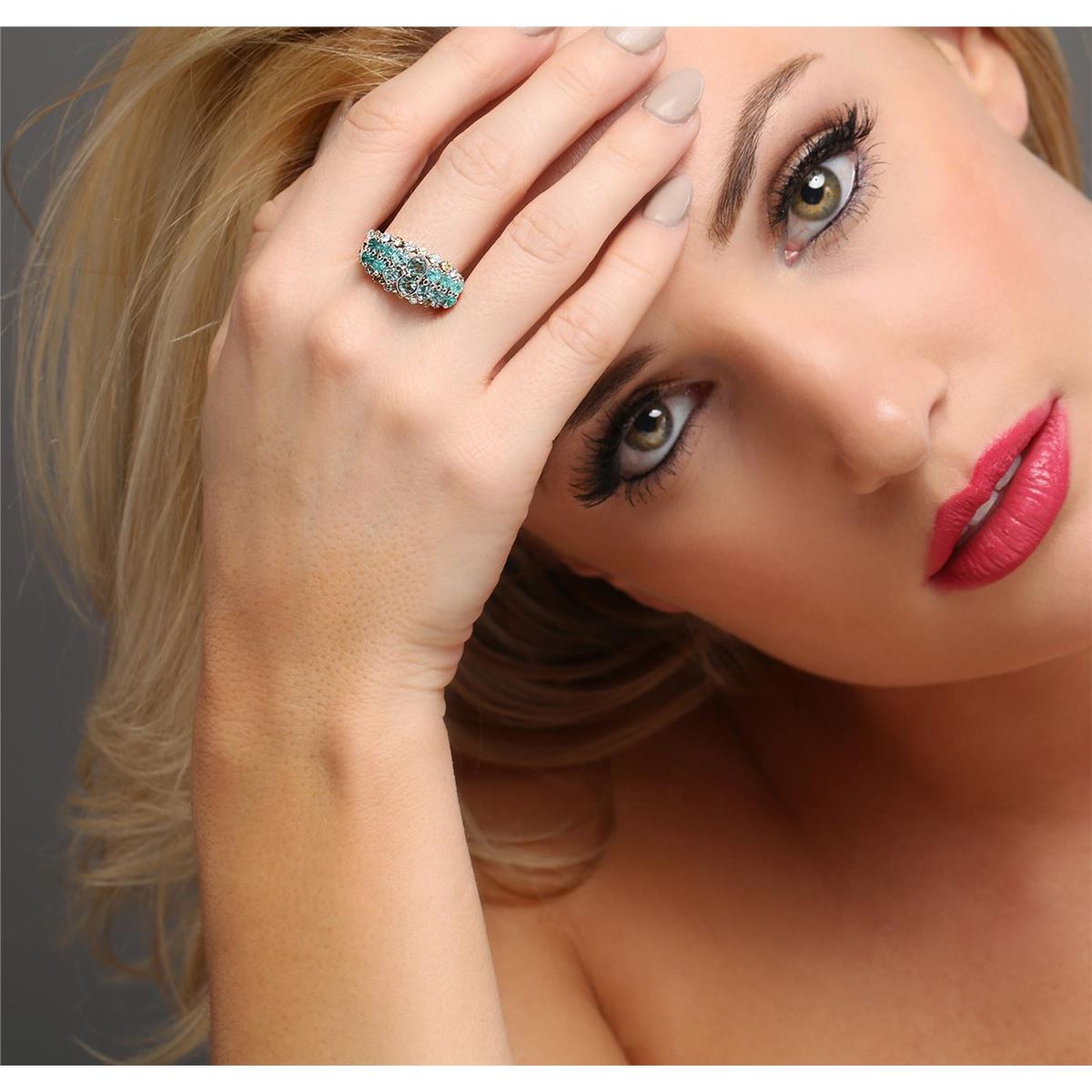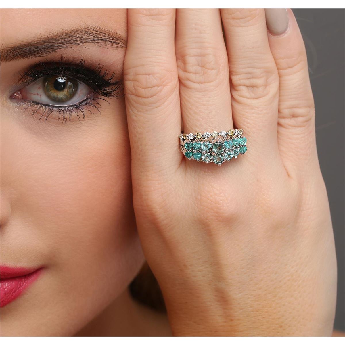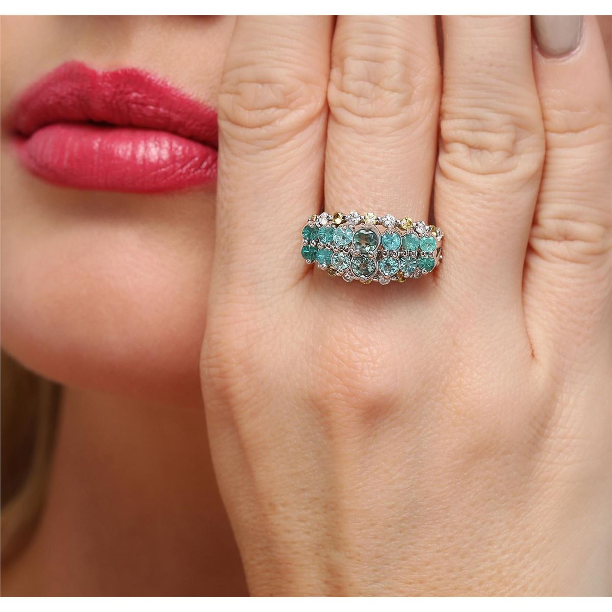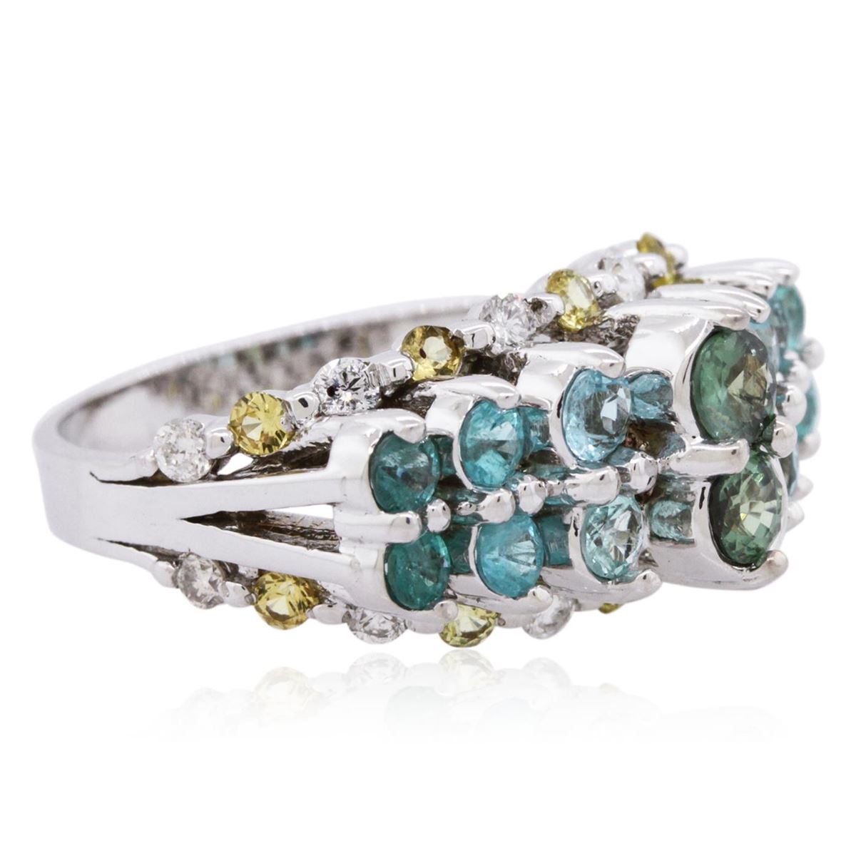 One electronically tested 14KT white gold ladies cast multi gemstone and diamond ring with a bright polish finish. The ring features two tiered Paraiba tourmaline ribbons set within mirroring yellow sapphire and diamond ribbons, completed by a two and one-half millimeter wide band. Identified with markings of "14K". Condition is new, good workmanship. Containing: Two prong set round brilliant cut natural Paraiba tourmalines, measuring 3.70 - 3.60 x 2.37 mm, approximate total weight of 0.40ct., clarity is slightly included, medium dark, moderately strong, very slightly bluish green color, (GIA vslbG 6/4), cut is good. Transmitting light with a minimum of distortion, transparent. Naturally occurring internal & external characteristics are present. Color & clarity grade are an average for the pair. Graded in the setting. Twelve prong set round brilliant cut natural Paraiba tourmalines, measuring 3.00 - 2.80 x 1.89 mm, approximate total weight of 1.20ct., clarity is moderately included, medium, moderately strong, very slightly greenish blue color, (GIA vslgB 5/4), cut is good. Transmitting light with a minimum of distortion, transparent. Naturally occurring internal & external characteristics are present. Color grade is an average for the group. Graded in the setting. This particular color combination is usually indicative of tourmaline from the state of Paraiba, village of Sao Jose da Batalha in northeastern Brazil. However, the origin for this tourmaline is determined to be the African Continent. African Paraiba color Tourmaline was first discovered in 2001 at the Edoukou Mine in Oyo Nigeria, close to the border of Benin and more recently in Zambezia, Mozambique. African Paraiba is believed to exist due to the continental drift theory. 200+ million years ago the earth's continents were joined together in one enormous super-continent called Pangaea. Compare the profile of western Africa and eastern South America; they fit together like pieces in a puzzle. This comparison suggests that they once belonged to a single landmass with similar geological conditions. The African tourmalines were created under the same conditions as the tourmalines from Paraiba, before the continents drifted apart. The African Paraiba color tourmaline is mined in alluvial deposits, the Brazilian Paraiba is mined underground. Ten prong set round brilliant cut natural yellow sapphires, measuring 2.00 - 1.80 x 1.24 mm, approximate total weight of 0.40ct., clarity is slightly included, type II, medium dark, slightly brownish, yellow color, (GIA Y 6/2), cut is good. Transmitting light with a minimum of distortion, transparent. Naturally occurring internal & external characteristics are present. Color grade is an average for the group. Graded in the setting. Twelve prong set round brilliant cut diamonds, measuring 2.00 - 1.90 x 1.17mm (depth est.) approximate total weight of 12 Stones = 0.42ct. Graded in the setting. Clarity: SI-1 to SI-2. Color: G - I. Total Weight of Colored Stones 2.00ct. Total Weight of Diamonds 0.42ct. Total Weight of Ring 7.10 grams. AIG Appraised at $7,115.00.