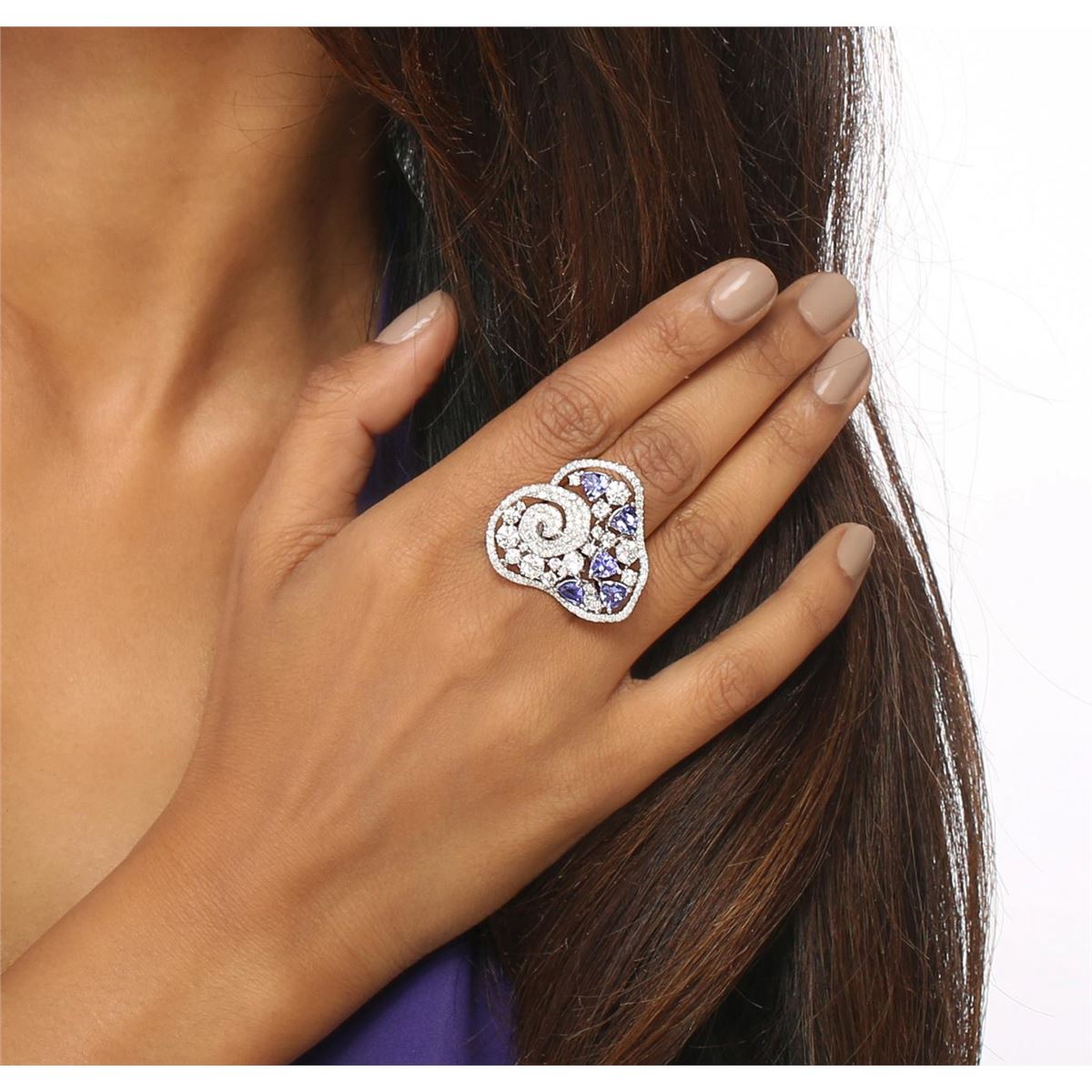 One electronically tested 14KT white gold ladies combination cast & assembled ring with a bright polish finish. Condition is new. Identified with markings of "585". Containing: Five prong set triangle modified brilliant cut natural tanzanites, measuring 4.50 x 4.50 x 2.61mm, approximate. Total Weight of 1.60ct., clarity is eye clean, type I, medium light, very slightly grayish, violet color, (GIA V 4/3), cut is good. One Hundred Thirty-One prong set round brilliant cut diamonds, measuring 1.30 - 1.30 x 0.78mm (depth est.) approximate. Total Weight of 131 Stones = 1.05ct. Clarity: I-1 to I-2. Color: I - J, Cut is Good. Eight prong set round brilliant cut diamonds, measuring 3.00 - 2.00 x 1.50mm (depth est.) approximate. Total Weight of 8 Stones = 0.46ct. Clarity: SI-1 to SI-2. Color: I - J, Cut is Good. Six prong set round brilliant cut diamonds, measuring 4.40 - 4.40 x 2.64mm (depth est.) approximate. Total Weight of 6 Stones = 1.87ct. Clarity: SI-1 to SI-2. Color: J, Cut is Good. Colored gemstones are presumed to have been subjected to commonly used enhancement processes. All diamonds and colored gemstones are graded in the mounting, unless otherwise stated. Total Weight of Colored Stones 1.60ct. Total Weight of Diamonds 3.38ct. Total Weight of Ring 12.70 grams. GGL Appraised at $19,490.00.