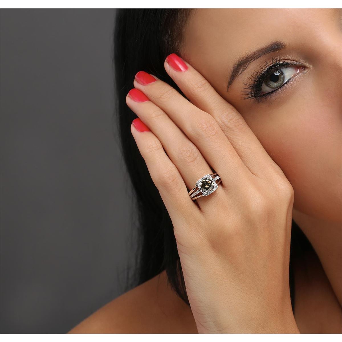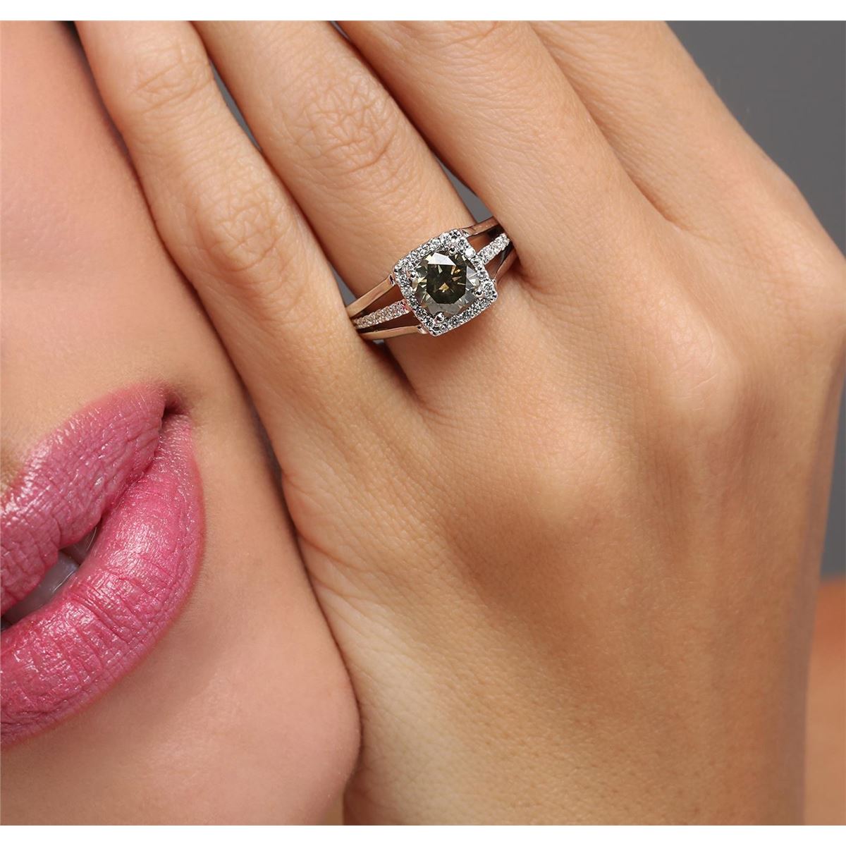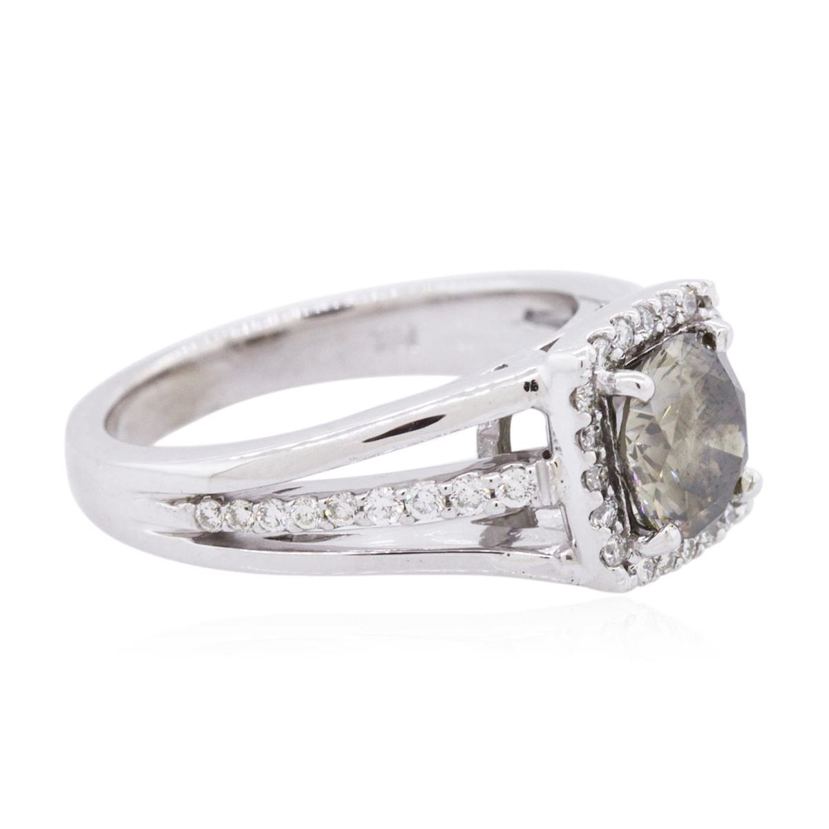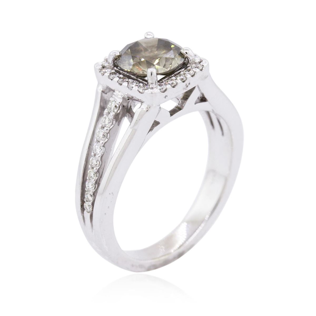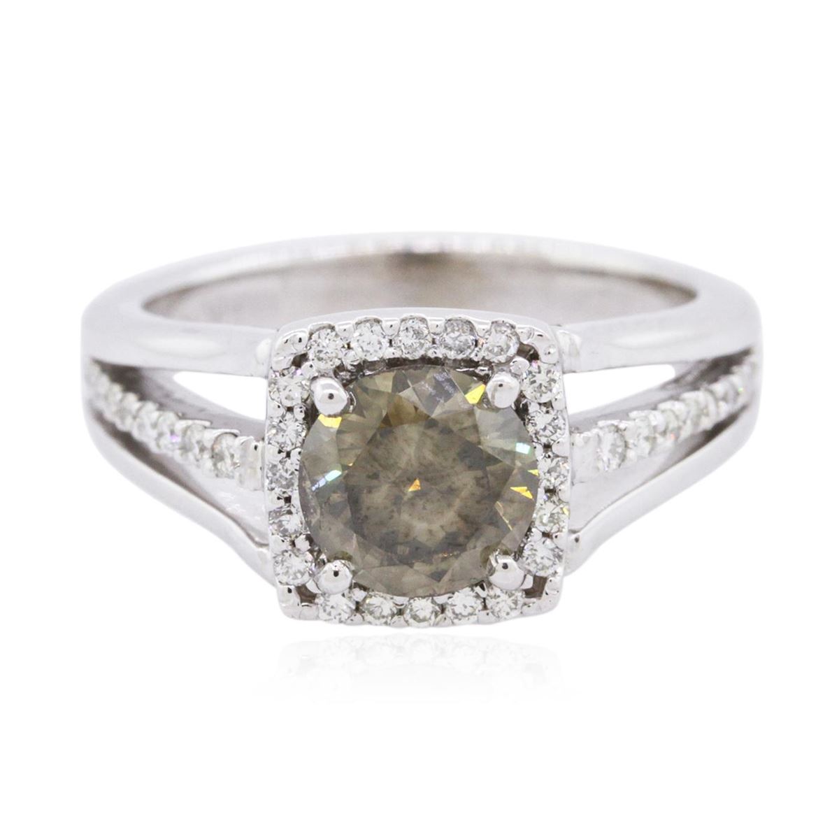 One electronically tested 14KT white gold ladies cast diamond ring with a bright polish finish. The featured diamond is set within a diamond bezel supported by diamond set three-way split shoulders, completed by a two and one-half millimeter wide band. Identified with markings of "14K". Condition is new, good workmanship. Containing: One prong set round brilliant cut diamond, measuring 6.80 - 6.75 x 4.10mm (depth est.) approximate weight of 1.24ct. Graded in the setting. Clarity: I-1. Depth: 60.5%. Table 63.4%. Thirty-Eight prong set round brilliant cut diamonds, measuring 1.30 - 1.20 x 0.75mm (depth est.) approximate total weight of 38 Stones = 0.37ct. Graded in the setting. Clarity: VS-2 to SI-1. Color: H - J. Total Weight of Diamonds 1.61ct. Total Weight of Ring 5.92 grams. AIG Appraised at $8,730.00.