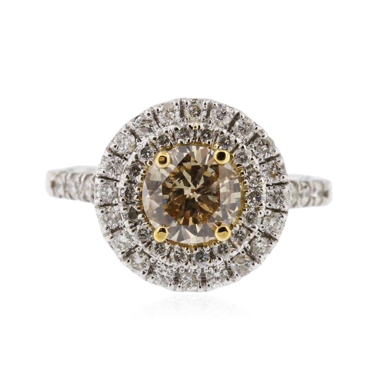 One electronically tested 14KT white gold ladies cast & assembled diamond ring with a bright polish finish. Condition is good. The featured diamond is set within a yellow gold basket and placed within tiered diamond bezels. The ring is supported by split diamond set shoulders, completed by a one and one-half millimeter wide band. Identified with markings of "14K". Containing: One prong set round brilliant cut diamond, measuring 6.30 - 6.30 x 3.80mm (depth est.) approximate weight of 0.94ct. Faint brown secondary color throughout. Graded in the setting. Clarity I-1. Color Light Yellow. Depth 60.3%. Table 65.1%. Fifty-six prong set round brilliant cut diamonds, measuring 1.60 - 1.30 x 0.87mm (depth est.) approximate total weight of 56 Stones = 0.67ct. Graded in the setting. Clarity I-1 to 1-2. Color G - I. Total Weight of Diamonds 1.61ct. Total Weight of Ring 4.11gm. AIG Appraised at $8,455.00.