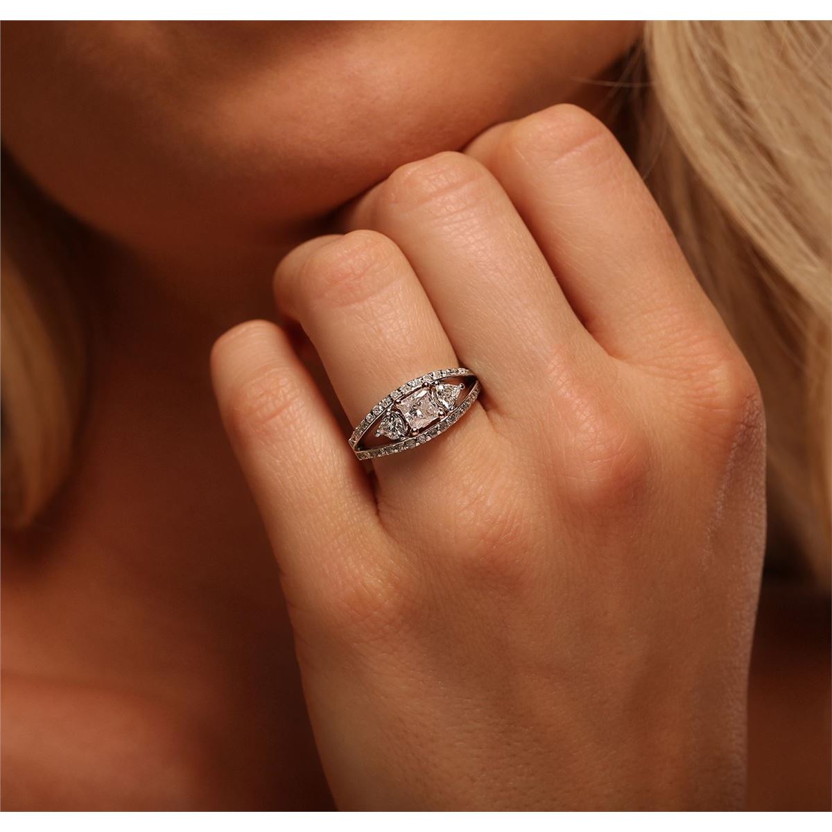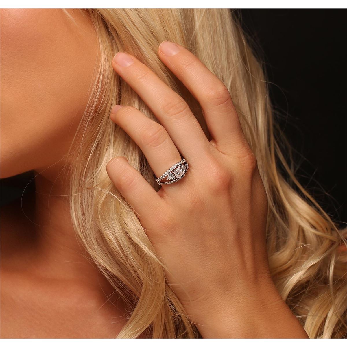 One electronically tested 14KT white gold ladies cast & assembled diamond unity ring with a bright polish finish. Condition is new, good workmanship. The featured diamond is set within a rose gold basket accented by a single diamond on either side and supported by mirroring diamond ribbons. The ring is completed by a two millimeter wide band. Identified with markings of "K14". Containing: One prong set princess cut diamond, measuring 4.70 x 4.65 x 3.50mm (depth est.) approximate weight of 0.72ct. Naturally occurring internal & external characteristics are present, including natural iridescence. Graded in the setting. Clarity: I-2. Color: 75.3%. Table 76.3%. Two prong set triangle brilliant cut diamonds, measuring 3.80 x 3.70 x 2.30mm (depth est.) approximate. Total Weight of 2 Stones = 0.40ct. Graded in the setting. Clarity: VS-1 to VS-2. Color: H - I Thirty-Four prong set round brilliant cut diamonds, measuring 1.50 - 1.40 x 0.87mm (depth est.) approximate. Total Weight of 34 Stones = 0.49ct. Graded in the setting. Clarity: I-1 to I-2. Color: H - J. Total Weight of Diamonds 1.61ct. Total Weight of Ring 5.05 grams. AIG Appraised at $7,955.00.