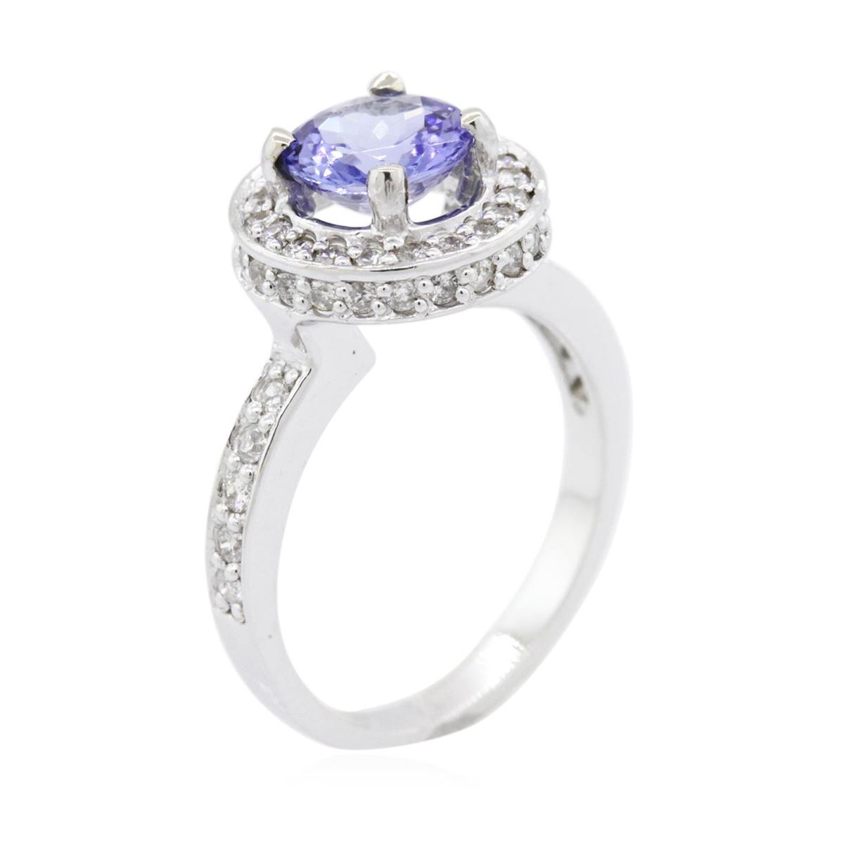 One electronically tested 14KT white gold ladies combination cast & assembled tanzanite and diamond ring with a flat shank with a bright polish finish. Identified with markings of "14K". Condition is new. Containing: One prong set round modified brilliant cut natural tanzanite, measuring 7.06 - 7.06 x 4.81 mm, approximate weight of 1.61ct., clarity is eye clean, type I, medium light, very slightly grayish, violet color, (GIA V 4/3), cut is very good. Fifty-Six prong set round brilliant cut diamonds, measuring 1.10 - 1.00 x 0.63mm (depth est.) approximate total weight of 56 Stones = 0.24ct. Clarity: I-1 to I-2. Color: H - I, Cut is Good. Colored gemstones are presumed to have been subjected to commonly used enhancement processes. All diamonds and colored gemstones are graded in the mounting, unless otherwise stated. Total Weight of Colored Stones 1.61ct. Total Weight of Diamonds 0.24ct. Total Weight of Ring 4.10 grams. GGL Appraised at $4,730.00.