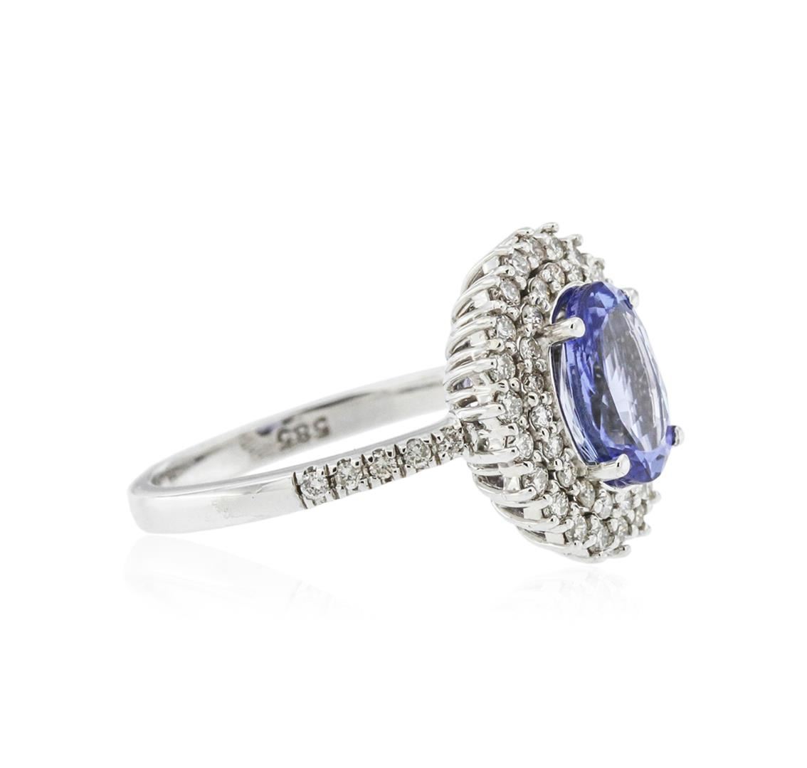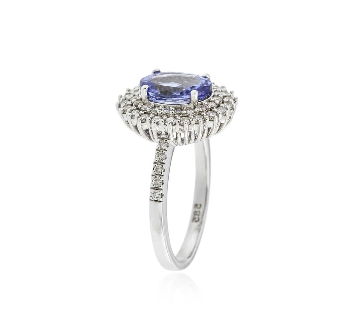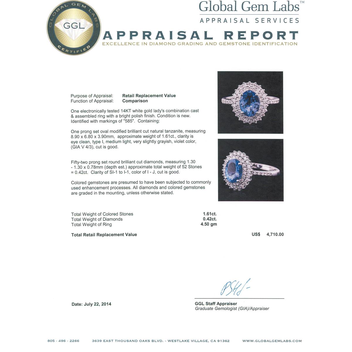 One electronically tested 14KT white gold ladies combination cast & assembled ring with a bright polish finish. Condition is new. Identified with markings of "585". Containing: One prong set oval modified brilliant cut natural tanzanite, measuring 8.90 x 6.80 x 3.90mm, approximate weight of 1.61ct., clarity is eye clean, type I, medium light, very slightly grayish, violet color, (GIA V 4/3), cut is good. Fifty-Two prong set round brilliant cut diamonds, measuring 1.30 - 1.30 x 0.78mm (depth est.) approximate total weight of 52 Stones = 0.42ct. Clarity: SI-1 to I-1. Color: I - J, Cut is Good. Colored gemstones are presumed to have been subjected to commonly used enhancement processes. All diamonds and colored gemstones are graded in the mounting, unless otherwise stated. Total Weight of Colored Stones 1.61ct. Total Weight of Diamonds 0.42ct. Total Weight of Ring 4.50 grams. GGL Appraised at $4,710.00.