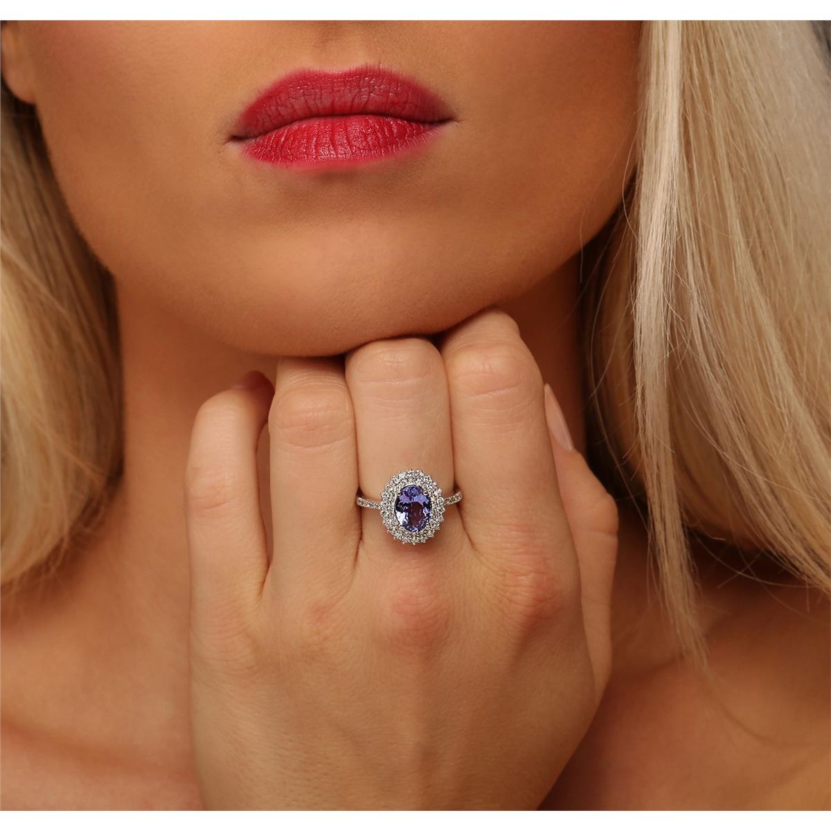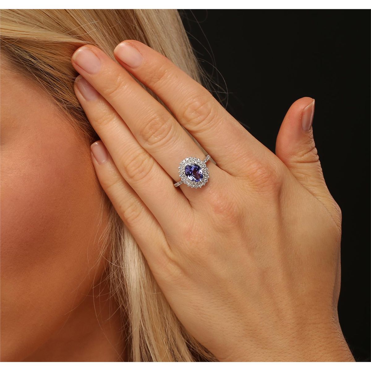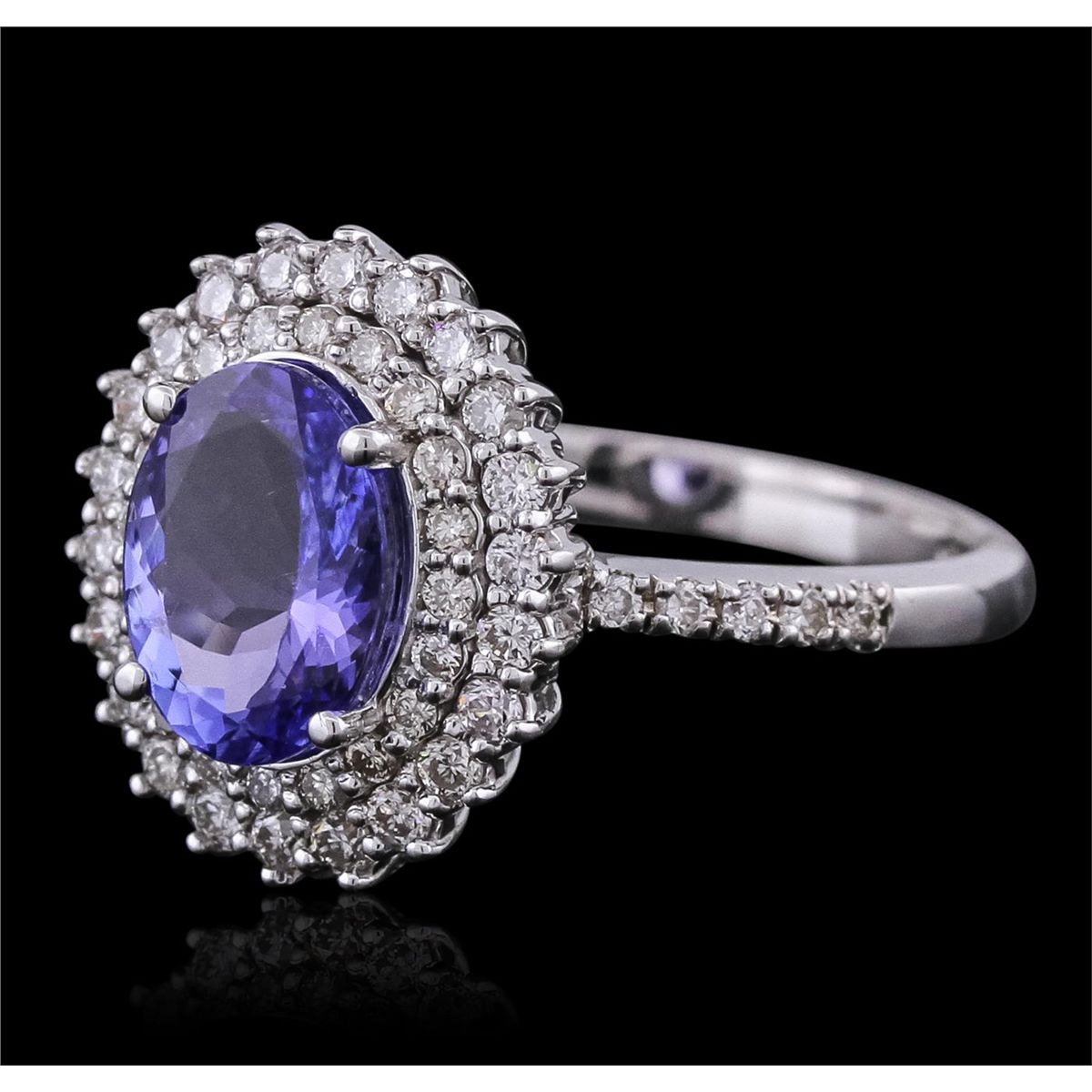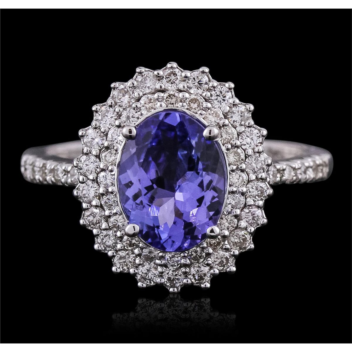 One electronically tested 14KT white gold ladies combination cast & assembled ring with a bright polish finish. Condition is new. Identified with markings of "585". Containing: One prong set oval modified brilliant cut natural tanzanite, measuring 8.90 x 6.80 x 3.90mm, approximate weight of 1.61ct., clarity is eye clean, type I, medium light, very slightly grayish, violet color, (GIA V 4/3), cut is good. Fifty-Two prong set round brilliant cut diamonds, measuring 1.30 - 1.30 x 0.78mm (depth est.) approximate total weight of 52 Stones = 0.42ct. Clarity: SI-1 to I-1. Color: I - J, Cut is Good. Colored gemstones are presumed to have been subjected to commonly used enhancement processes. All diamonds and colored gemstones are graded in the mounting, unless otherwise stated. Total Weight of Colored Stones 1.61ct. Total Weight of Diamonds 0.42ct. Total Weight of Ring 4.50 grams. GGL Appraised at $4,710.00.