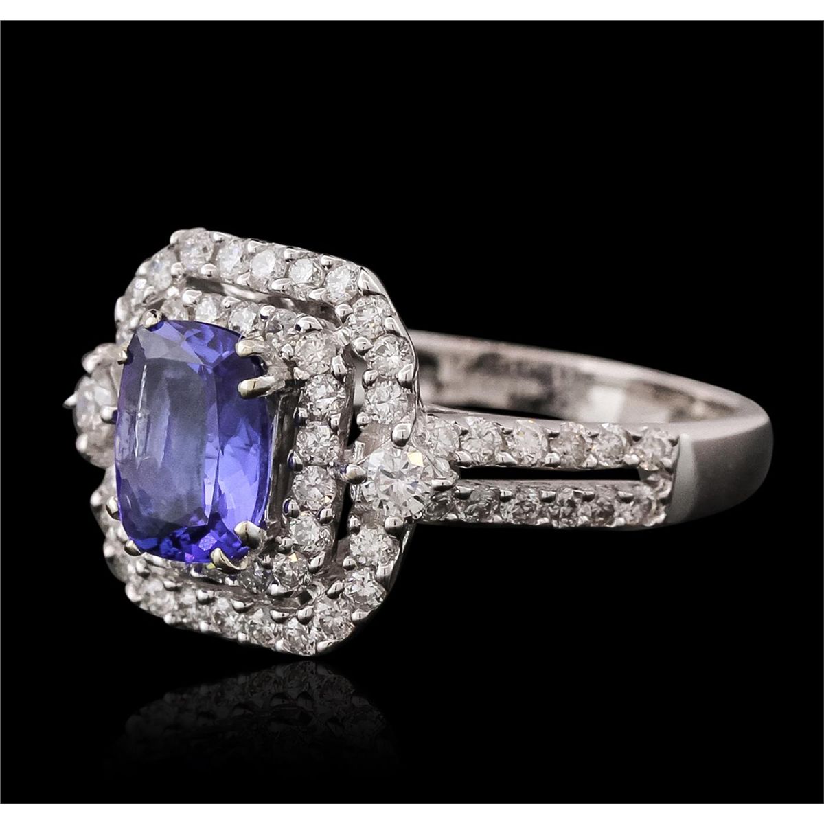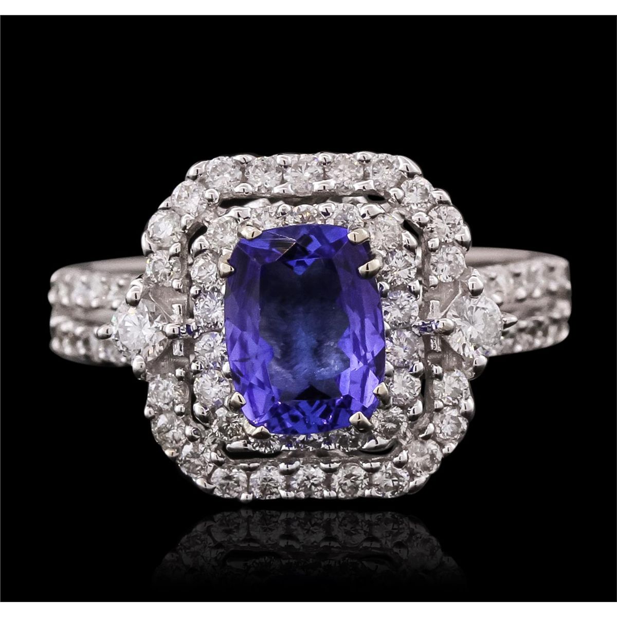One electronically tested 14KT white gold ladies combination cast & assembled tanzanite and diamond ring with a split shank with a bright polish finish. Identified with markings of "14K". Condition is new. Containing: One prong set rectangular cushion modified brilliant cut natural tanzanite, measuring 7.98 x 6.04 x 4.24mm, approximate weight of 1.61ct., clarity is eye clean, type I, medium, moderately strong, violet color, (GIA V 5/4), cut is good. Sixty prong set round brilliant cut diamonds, measuring 2.10 - 1.50 x 1.08mm (depth est.) approximate total weight of 60 Stones = 0.75ct. Clarity: I-1 to I-2. Color: I - J, Cut is Good. Colored gemstones are presumed to have been subjected to commonly used enhancement processes. All diamonds and colored gemstones are graded in the mounting, unless otherwise stated. Total Weight of Colored Stones 1.61ct. Total Weight of Diamonds 0.75ct. Total Weight of Ring 4.30 grams. GGL Appraised at $5,365.00.
