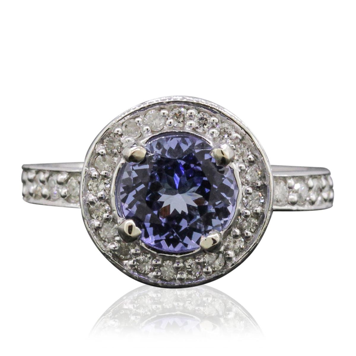 One electronically tested 14KT white gold ladies combination cast & assembled tanzanite and diamond ring with a flat shank with a bright polish finish. Identified with markings of "14K". Condition is new. Containing: One prong set round modified brilliant cut natural tanzanite, measuring 7.06 - 7.06 x 4.81 mm, approximate weight of 1.61ct., clarity is eye clean, type I, medium light, very slightly grayish, violet color, (GIA V 4/3), cut is very good. Fifty-Six prong set round brilliant cut diamonds, measuring 1.10 - 1.00 x 0.63mm (depth est.) approximate total weight of 56 Stones = 0.24ct. Clarity: I-1 to I-2. Color: H - I, Cut is Good. Colored gemstones are presumed to have been subjected to commonly used enhancement processes. All diamonds and colored gemstones are graded in the mounting, unless otherwise stated. Total Weight of Colored Stones 1.61ct. Total Weight of Diamonds 0.24ct. Total Weight of Ring 4.10 grams. GGL Appraised at $4,730.00. AIG Appraised at $6,880.00.