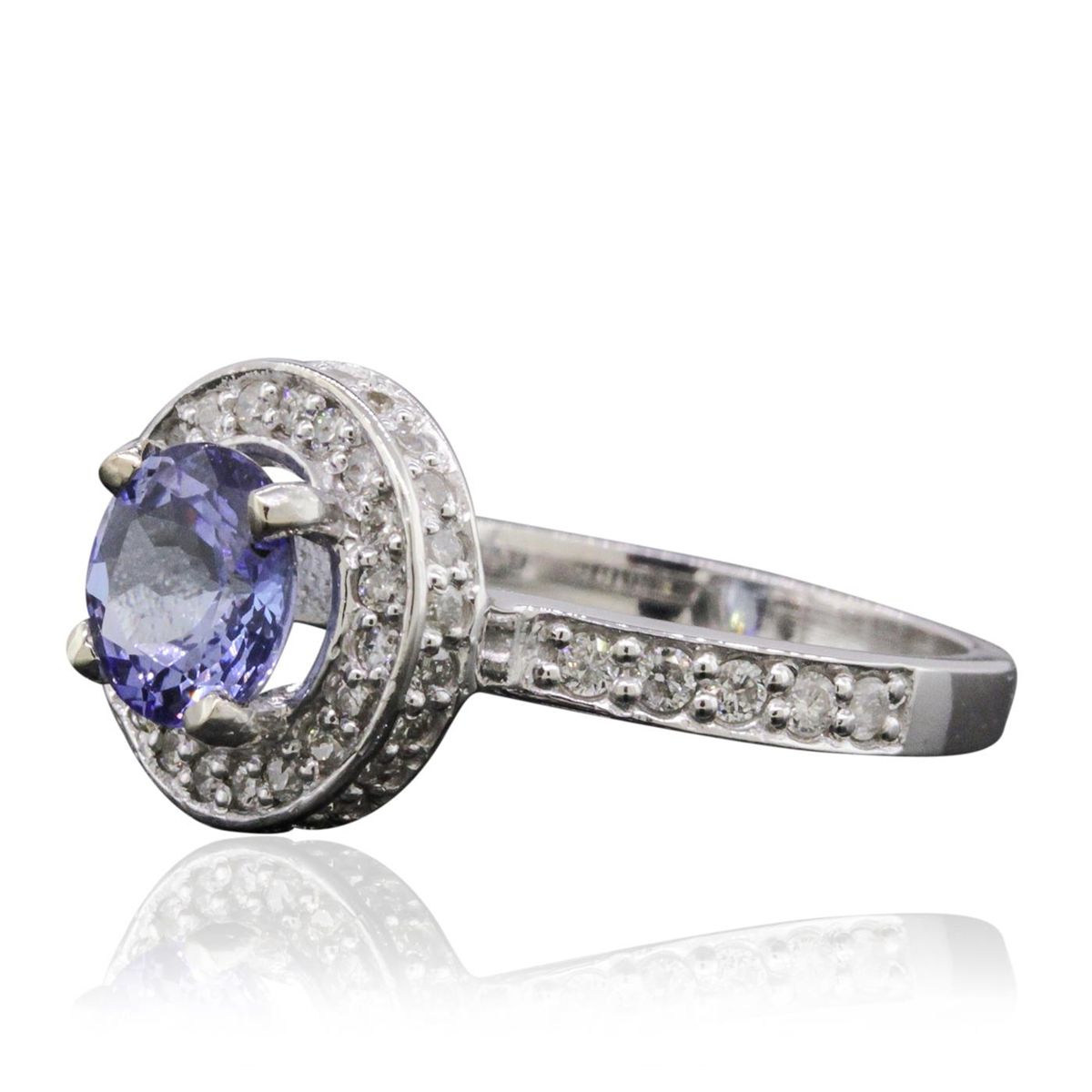 One electronically tested 14KT white gold ladies combination cast & assembled tanzanite and diamond ring with a flat shank with a bright polish finish. Identified with markings of "14K". Condition is new. Containing: One prong set round modified brilliant cut natural tanzanite, measuring 7.06 - 7.06 x 4.81 mm, approximate weight of 1.61ct., clarity is eye clean, type I, medium light, very slightly grayish, violet color, (GIA V 4/3), cut is very good. Fifty-Six prong set round brilliant cut diamonds, measuring 1.10 - 1.00 x 0.63mm (depth est.) approximate total weight of 56 Stones = 0.24ct. Clarity: I-1 to I-2. Color: H - I, Cut is Good. Colored gemstones are presumed to have been subjected to commonly used enhancement processes. All diamonds and colored gemstones are graded in the mounting, unless otherwise stated. Total Weight of Colored Stones 1.61ct. Total Weight of Diamonds 0.24ct. Total Weight of Ring 4.10 grams. GGL Appraised at $4,730.00. AIG Appraised at $6,880.00.