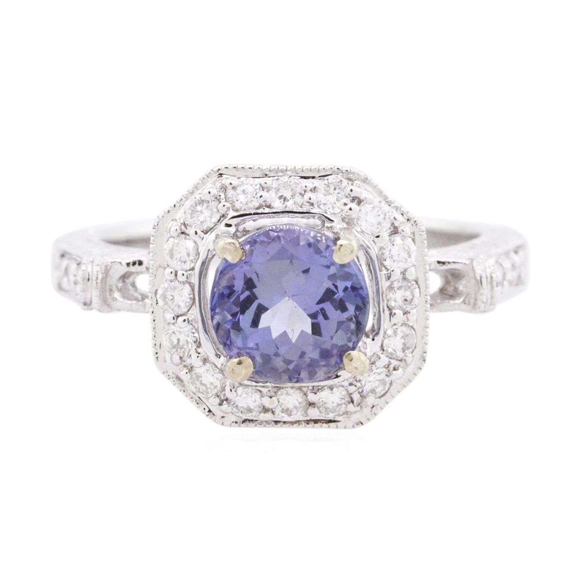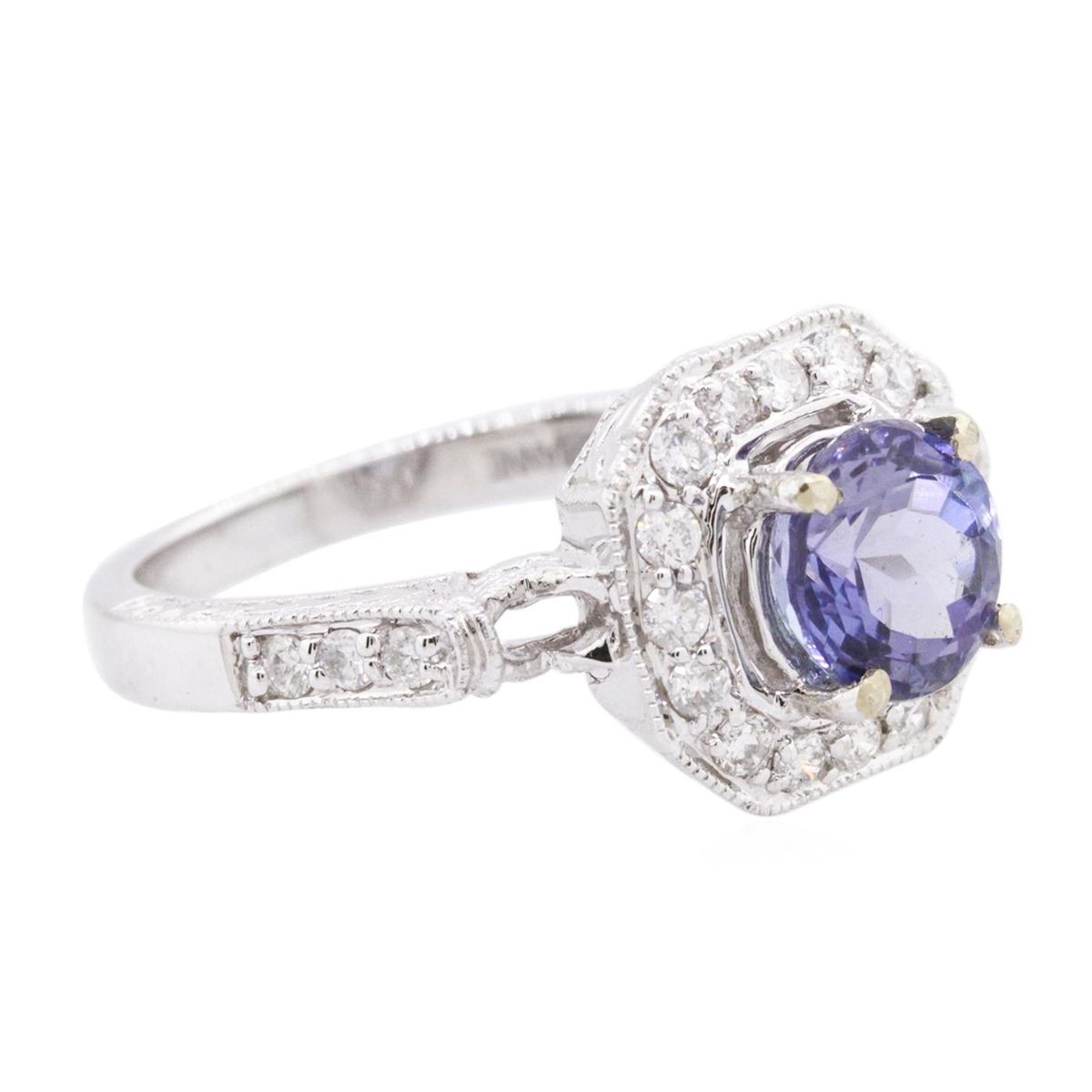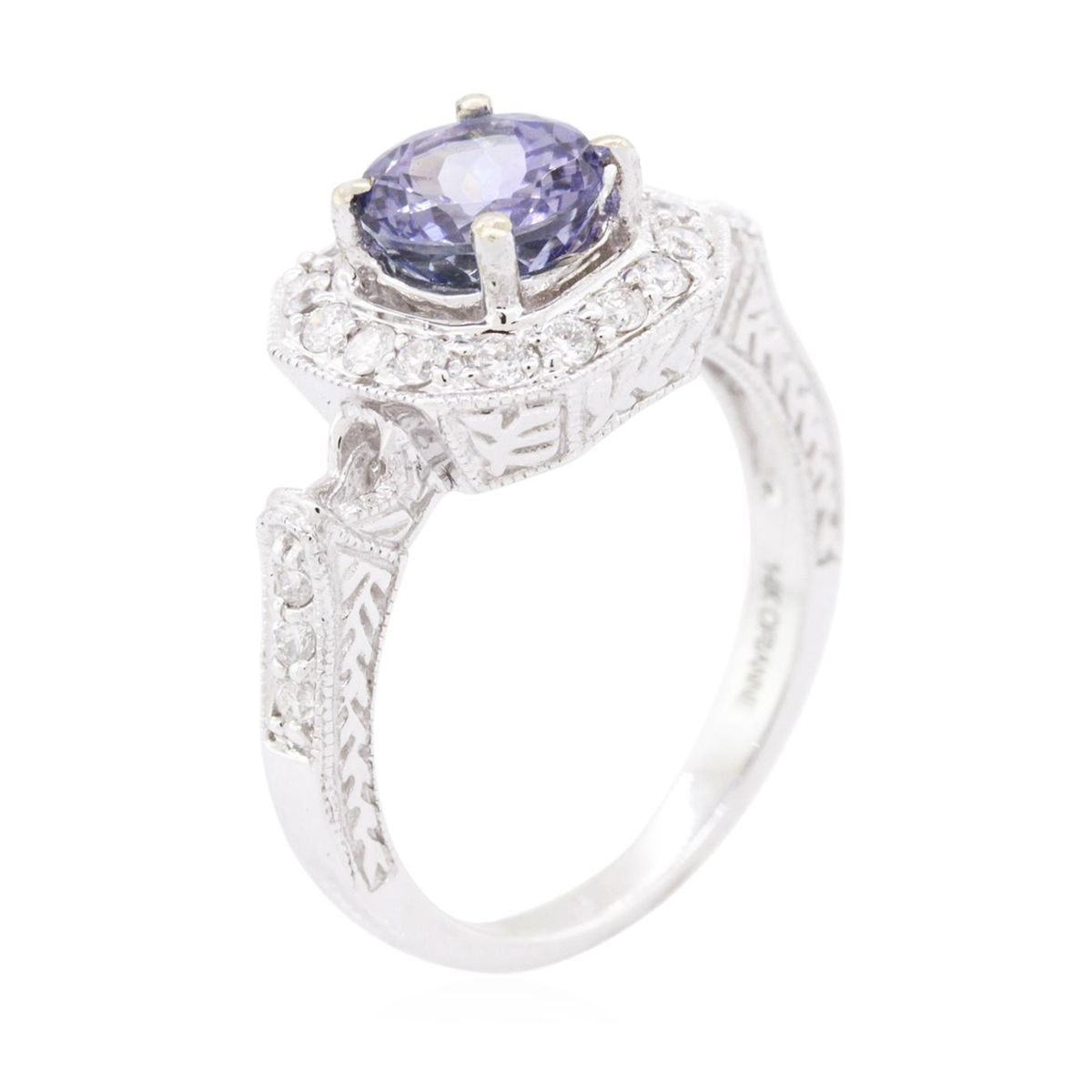One electronically tested 14KT white gold ladies cast tanzanite & diamond ring with a bright finish. The featured tanzanite is set within a diamond bezel, supported by diamond set shoulders, completed by a two millimeter wide band. Trademark is Orianne. Identified with markings of "14K". Condition is good. Containing: One prong set round mixed cut natural tanzanite, measuring 7.00 - 6.80 x 4.90 mm, approximate weight of 1.61ct., clarity is eye clean, type I, medium dark, slightly grayish, bluish violet color, (GIA bV 6/2), cut is good. Transmitting light with no distortion, transparent. Graded in the setting. Tanzanite is a very rare gemstone that is only found in the country of Tanzania. Originally discovered in 1967. Tiffany & Company, named the stone Tanzanite. It is found in the Usumburu Mountains that border the Umba Valley of northern Tanzania. Tanzanite occurs in gray, brown, violet, blue, reddish-purple, & green. The gem is interesting because of its exceptional pleochroism. Rotated in different directions a tanzanite will exhibit multiple changes of color. Tanzanite has a low tolerance to ultrasonic cleaning, and should not be cleaned using this method. Twenty-Two prong set round brilliant cut diamonds, measuring 1.60 - 1.50 x 0.93mm (depth est.) approximate total weight of 22 Stones = 0.30ct. Graded in the setting. Clarity: I-1 to I-2. Color: H - J. Total Weight of Colored Stones 1.61ct. Total Weight of Diamonds 0.30ct. Total Weight of Ring 5.15 grams. AIG Appraised at $3,930.00.