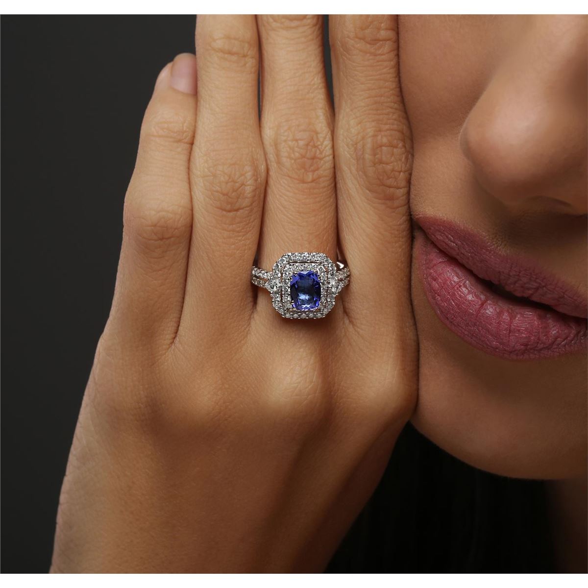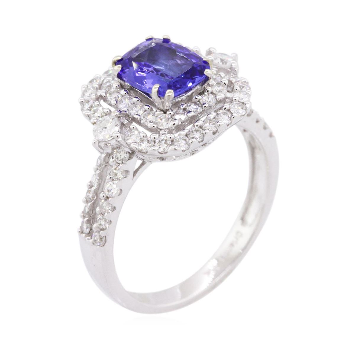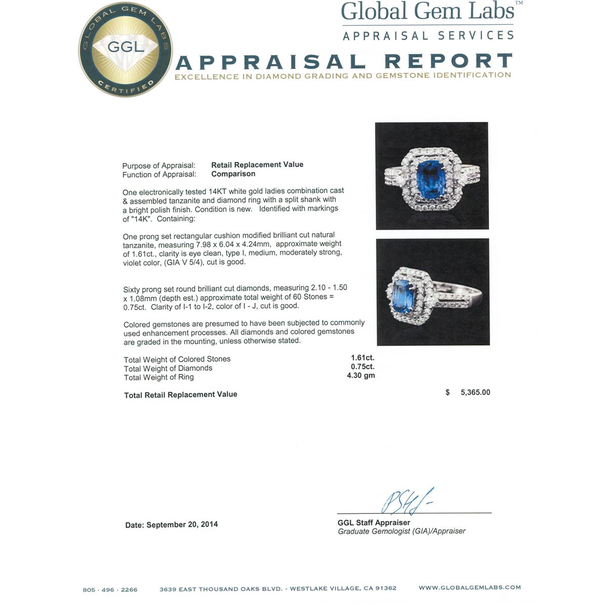 One electronically tested 14KT white gold ladies combination cast & assembled tanzanite and diamond ring with a split shank with a bright polish finish. Identified with markings of "14K". Condition is new. Containing: One prong set rectangular cushion modified brilliant cut natural tanzanite, measuring 7.98 x 6.04 x 4.24mm, approximate weight of 1.61ct., clarity is eye clean, type I, medium, moderately strong, violet color, (GIA V 5/4), cut is good. Sixty prong set round brilliant cut diamonds, measuring 2.10 - 1.50 x 1.08mm (depth est.) approximate total weight of 60 Stones = 0.75ct. Clarity: I-1 to I-2. Color: I - J, Cut is Good. Colored gemstones are presumed to have been subjected to commonly used enhancement processes. All diamonds and colored gemstones are graded in the mounting, unless otherwise stated. Total Weight of Colored Stones 1.61ct. Total Weight of Diamonds 0.75ct. Total Weight of Ring 4.30 grams. GGL Appraised at $5,365.00.