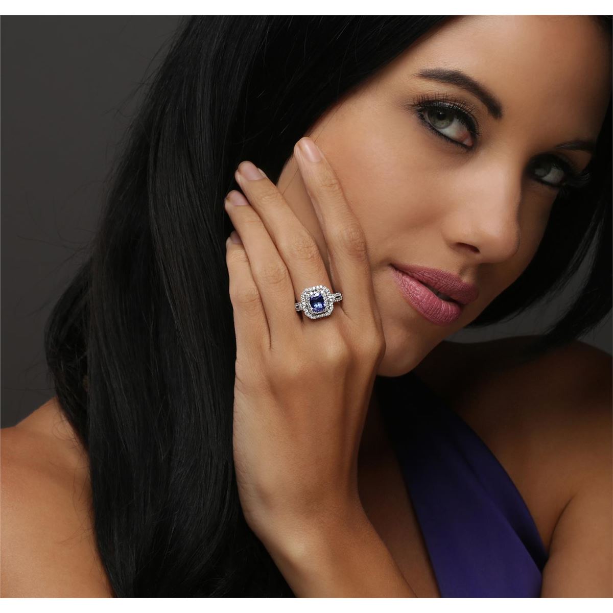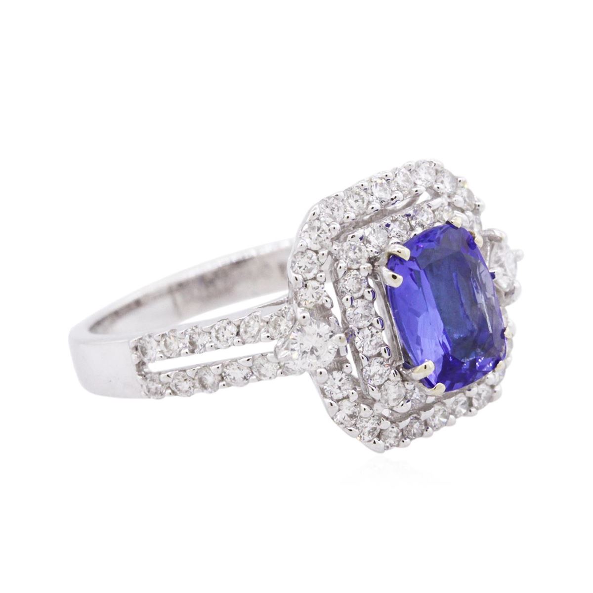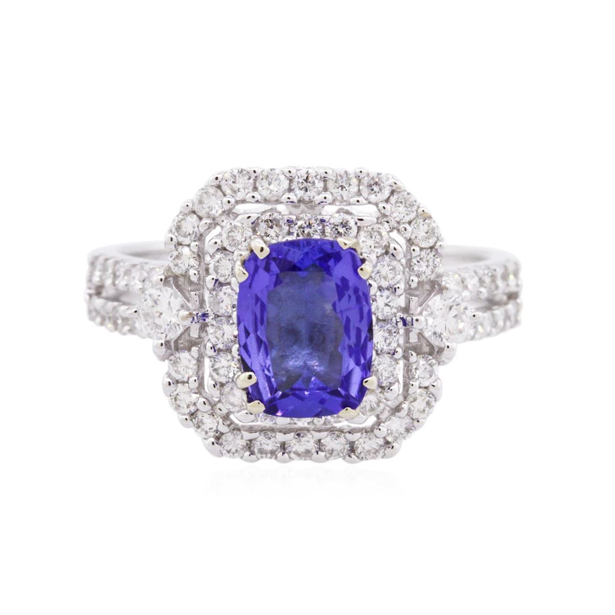 One electronically tested 14KT white gold ladies combination cast & assembled tanzanite and diamond ring with a split shank with a bright polish finish. Identified with markings of "14K". Condition is new. Containing: One prong set rectangular cushion modified brilliant cut natural tanzanite, measuring 7.98 x 6.04 x 4.24mm, approximate weight of 1.61ct., clarity is eye clean, type I, medium, moderately strong, violet color, (GIA V 5/4), cut is good. Sixty prong set round brilliant cut diamonds, measuring 2.10 - 1.50 x 1.08mm (depth est.) approximate total weight of 60 Stones = 0.75ct. Clarity: I-1 to I-2. Color: I - J, Cut is Good. Colored gemstones are presumed to have been subjected to commonly used enhancement processes. All diamonds and colored gemstones are graded in the mounting, unless otherwise stated. Total Weight of Colored Stones 1.61ct. Total Weight of Diamonds 0.75ct. Total Weight of Ring 4.30 grams. GGL Appraised at $5,365.00.