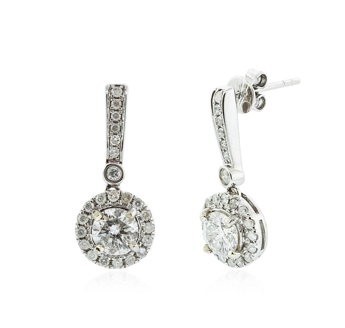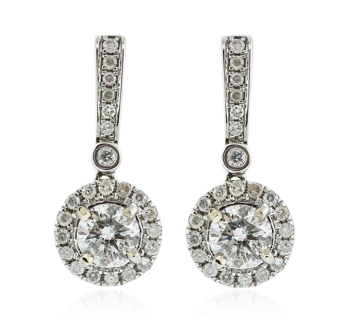 One pair electronically tested 14KT white gold ladies cast & assembled diamond dangle earrings with standard backs. Bright polish finish. Trademark is Orianne. Identified with markings of "14K". Condition is new, good workmanship. Containing: Two prong set round brilliant cut diamonds, measuring 5.40 - 5.30 x 2.90mm (depth est.) approximate total weight of 2 Stones = 1.11ct. Graded in the setting. Clarity: I-1. Color: I Forty-Six prong set round brilliant cut diamonds, measuring 1.40 - 1.30 x 0.81mm (depth est.) approximate total weight of 46 Stones = 0.51ct. Graded in the setting. Clarity: I-2 to I-3. Color: H - J. Total Weight of Diamonds 1.62ct. Total Weight of Earrings 3.83gm. AIG Appraised at $8,585.00.