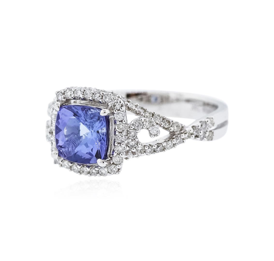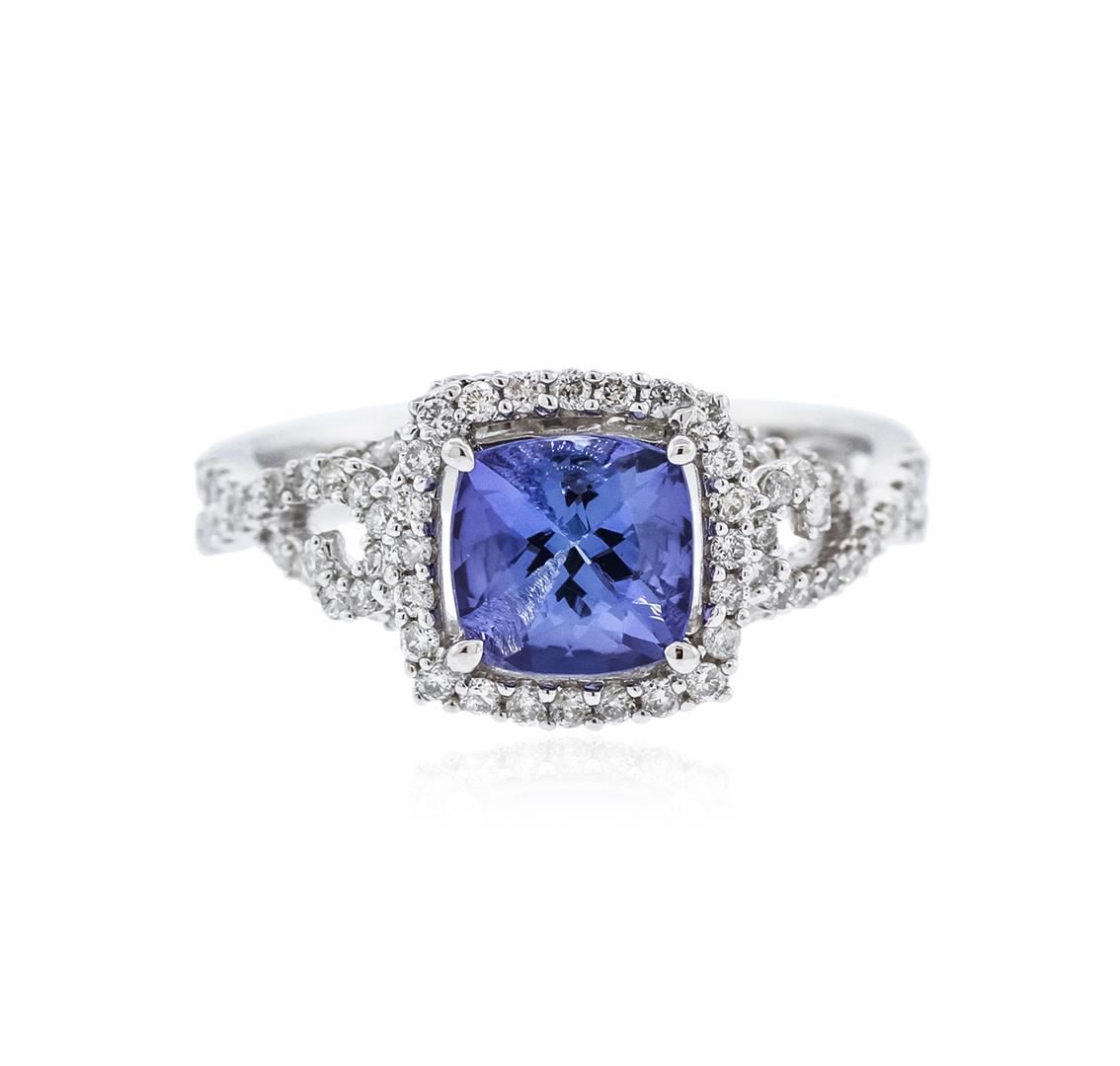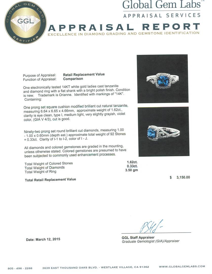 One electronically tested 14KT white gold ladies cast tanzanite and diamond ring with a flat shank with a bright polish finish. Trademark is Orianne. Identified with markings of "14K". Condition is new. Containing: One prong set square cushion modified brilliant cut natural tanzanite, measuring 6.64 x 6.65 x 4.66mm, approximate weight of 1.62ct., clarity is eye clean, type I, medium light, very slightly grayish, violet color, (GIA V 4/3), cut is good. Ninety-Two prong set round brilliant cut diamonds, measuring 1.00 - 1.00 x 0.60mm (depth est.) approximate total weight of 92 Stones = 0.33ct. Clarity: I-1 to I-2. Color: I - J. All diamonds and colored gemstones are graded in the mounting, unless otherwise stated. Colored gemstones are presumed to have been subjected to commonly used enhancement processes.. Total Weight of Colored Stones 1.62ct. Total Weight of Diamonds 0.33ct. Total Weight of Ring 3.50 grams. GGL Appraised at $3,150.00.
