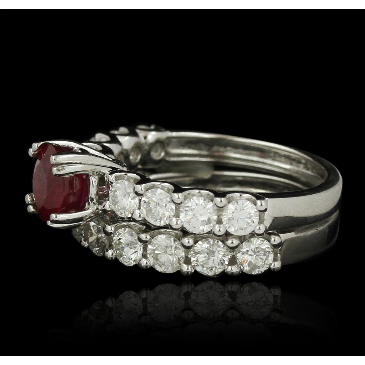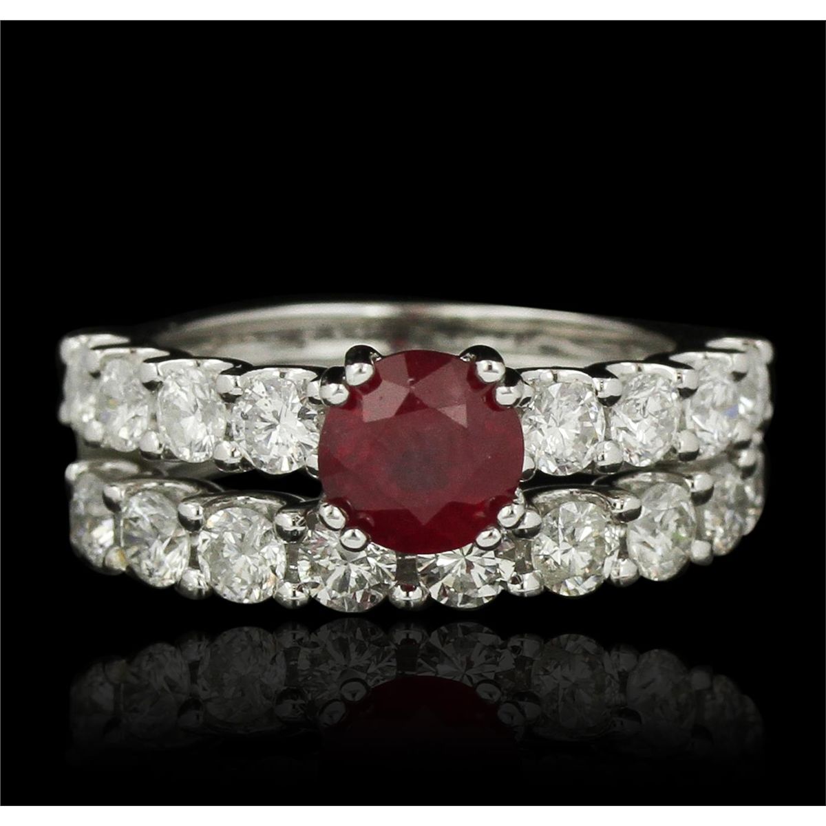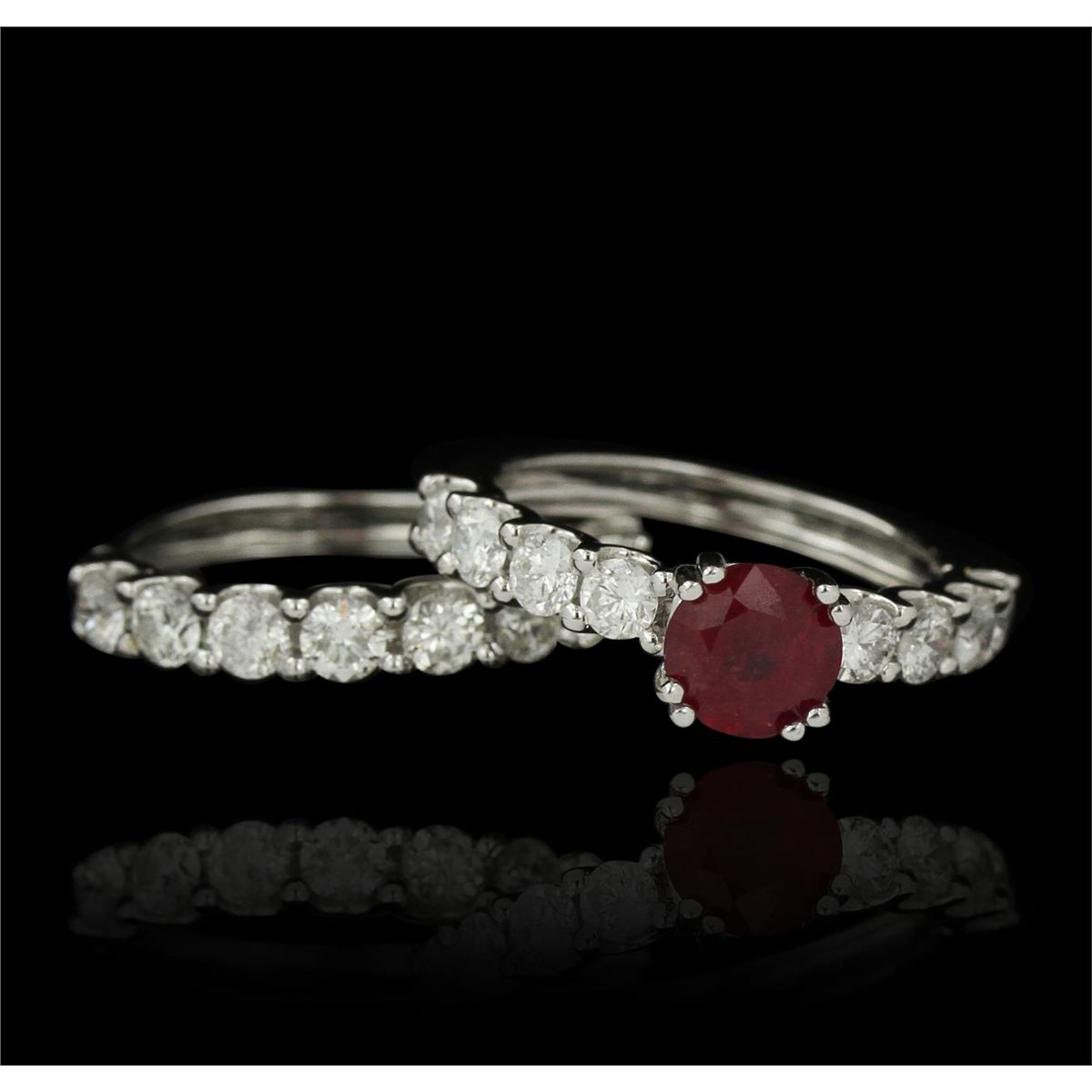 One electronically tested 14KT white gold Ladies combination cast & assembled wedding ring & wedding band with a bright polish finish. Condition is new. Identified with markings of "14K". Containing: Seventeen prong set round brilliant cut diamonds, measuring 3.00 - 3.00 x 1.80mm (depth est.) approximate. Total Weight of 17 Stones = 2.21ct. Clarity: I-1 to I-2. Color: I - J, Cut is Good. One prong set round modified brilliant cut natural ruby, measuring 6.60 - 6.40 x 4.50 mm, exact weight 1.62ct., clarity is heavily included, type II, medium dark, moderately strong, strongly purplish red color, (GIA stpR 6/4), cut is good. Colored gemstones are presumed to have been subjected to commonly used color/clarity enhancement processes. Total Weight of Colored Stones 1.62ct. Total Weight of Diamonds 2.21ct. Total Weight of Ring & Wedding Band 6.90 grams. GGL Appraised at $6,225.00.