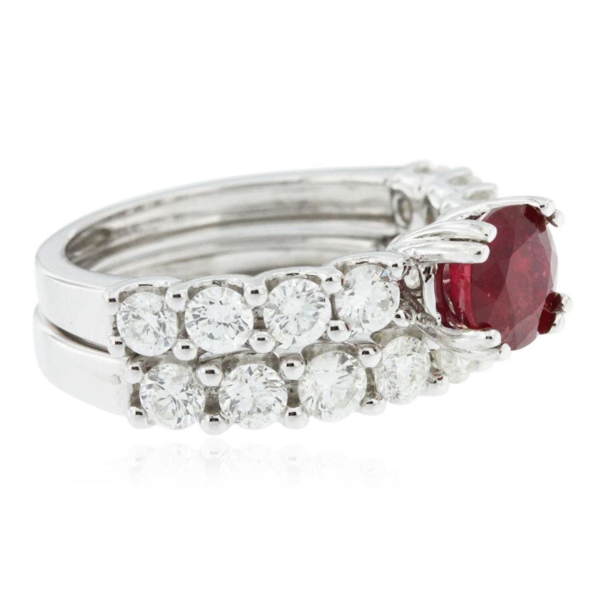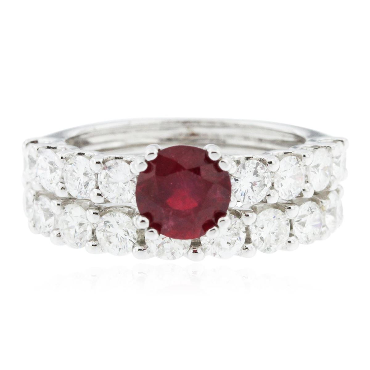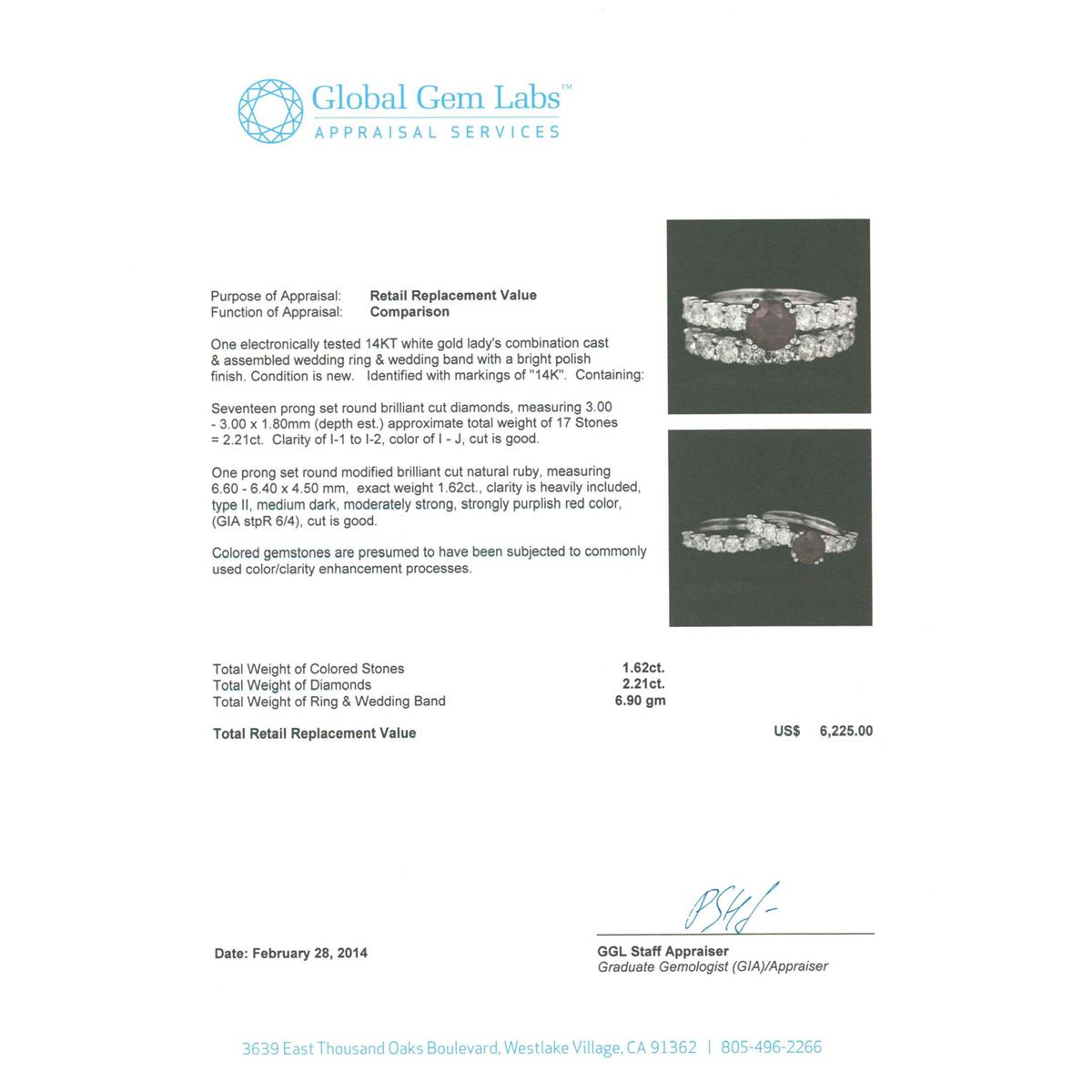 One electronically tested 14KT white gold Ladies combination cast & assembled wedding ring & wedding band with a bright polish finish. Condition is new. Identified with markings of "14K". Containing: Seventeen prong set round brilliant cut diamonds, measuring 3.00 - 3.00 x 1.80mm (depth est.) approximate. Total Weight of 17 Stones = 2.21ct. Clarity: I-1 to I-2. Color: I - J, Cut is Good. One prong set round modified brilliant cut natural ruby, measuring 6.60 - 6.40 x 4.50 mm, exact weight 1.62ct., clarity is heavily included, type II, medium dark, moderately strong, strongly purplish red color, (GIA stpR 6/4), cut is good. Colored gemstones are presumed to have been subjected to commonly used color/clarity enhancement processes. Total Weight of Colored Stones 1.62ct. Total Weight of Diamonds 2.21ct. Total Weight of Ring & Wedding Band 6.90 grams. GGL Appraised at $6,225.00.