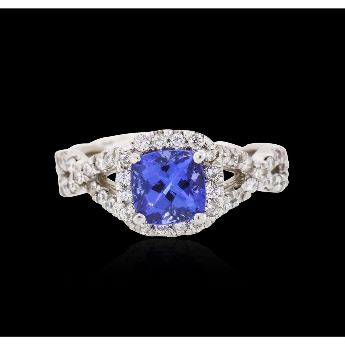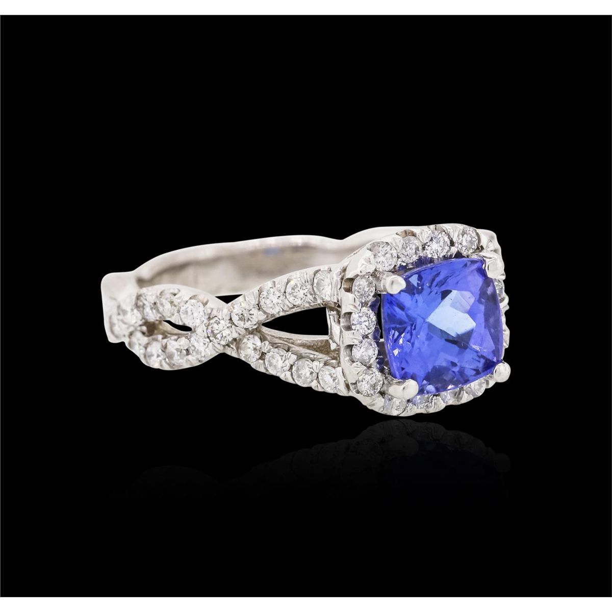One electronically tested 14KT white gold ladies combination cast & assembled tanzanite and diamond ring with a split shank with a bright polish finish. Identified with markings of "14K". Condition is new. Containing: One prong set square cushion modified brilliant cut natural tanzanite, measuring 6.55 x 6.55 x 4.79mm, approximate weight of 1.62ct., clarity is eye clean, type I, medium, moderately strong, violet color, (GIA V 5/4), cut is good. Fifty-Two prong set round brilliant cut diamonds, measuring 1.30 - 1.30 x 0.78mm (depth est.) stated. Total Weight of 52 Stones = 0.42ct. Clarity: I-1 to I-2. Color: I - J, Cut is Good. All diamonds and colored gemstones are graded in the mounting, unless otherwise stated. Colored gemstones are presumed to have been subjected to commonly used enhancement processes. Total Weight of Colored Stones 1.62ct. Total Weight of Diamonds 0.42ct. Total Weight of Ring 5.30 grams. GGL Appraised at $4,635.00.