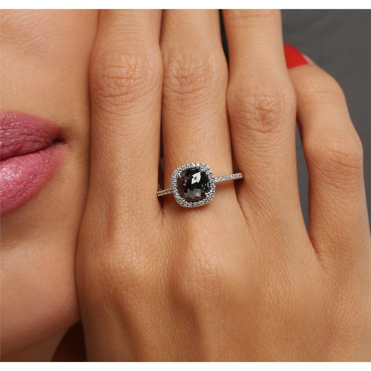 One 14KT white gold ring containing one natural round rose cut fancy black diamond, enhanced for color, with a total weight of 1.48ct. The ring also contains side stones graded I-J color, SI1-SI3 clarity with a total weight of 0.14ct. Total weight of the ring is 2.70 grams. EGL Appraised at $2,470.00.