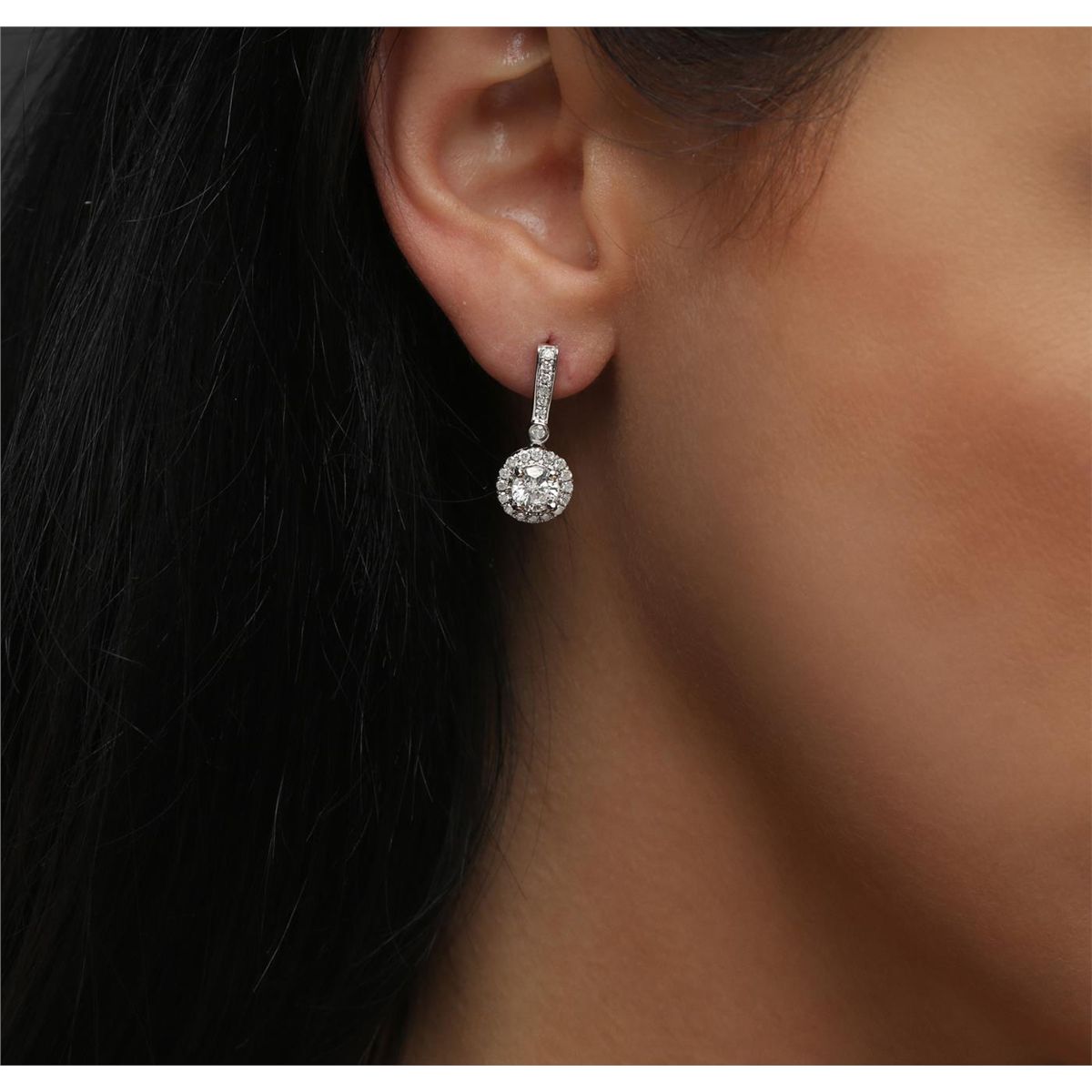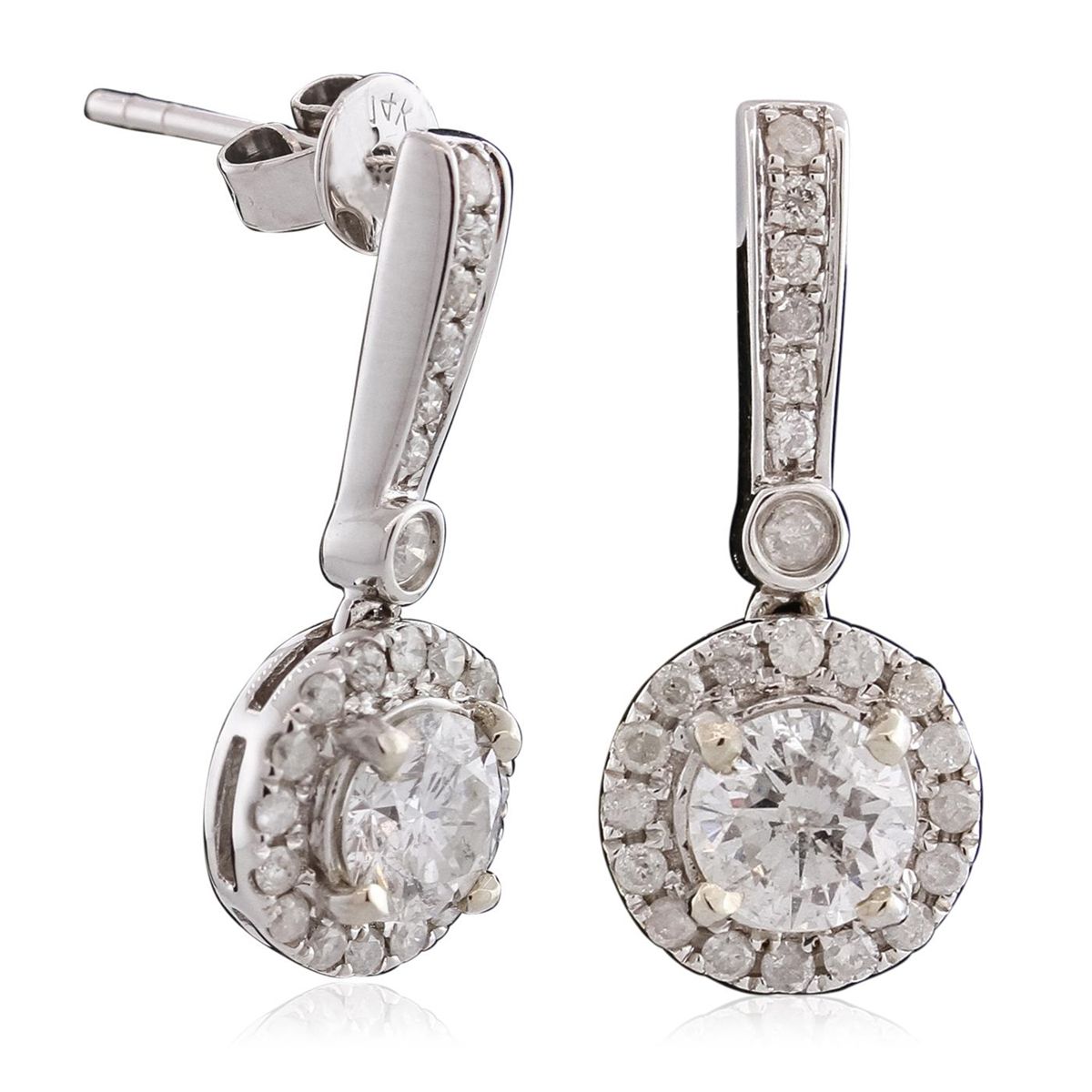 One pair electronically tested 14KT white gold ladies cast & assembled diamond dangle earrings with standard backs. Bright polish finish. Trademark is Orianne. Identified with markings of "14K". Condition is new, good workmanship. Containing: Two prong set round brilliant cut diamonds, measuring 5.40 - 5.30 x 2.90mm (depth est.) approximate total weight of 2 Stones = 1.11ct. Graded in the setting. Clarity: I-1. Color: I Forty-Six prong set round brilliant cut diamonds, measuring 1.40 - 1.30 x 0.81mm (depth est.) approximate total weight of 46 Stones = 0.51ct. Graded in the setting. Clarity: I-2 to I-3. Color: H - J. Total Weight of Diamonds 1.62ct. Total Weight of Earrings 3.83gm. AIG Appraised at $8,585.00. AIG Appraised at $2,535.00.