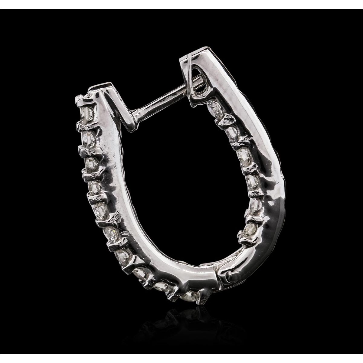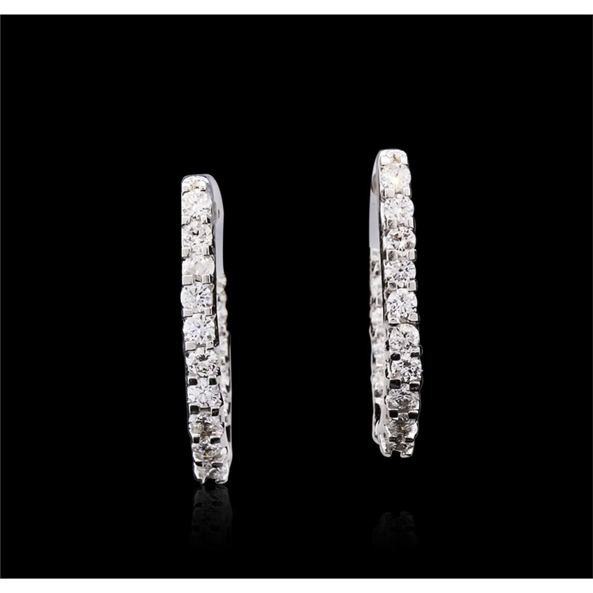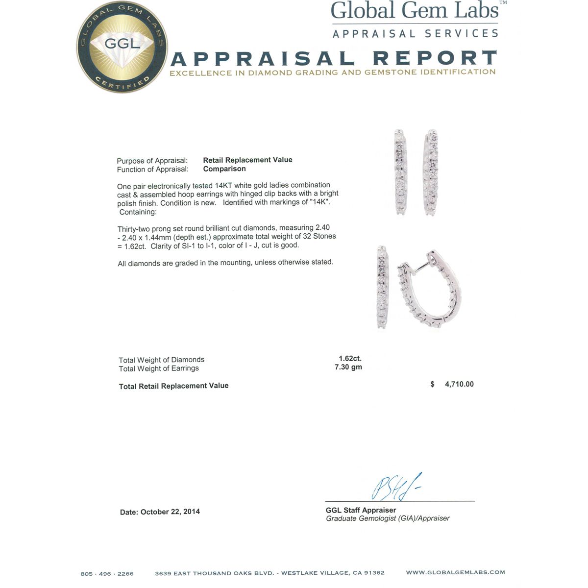 One pair electronically tested 14KT white gold ladies combination cast & assembled hoop earrings with hinged clip backs with a bright polish finish. Identified with markings of "14K". Condition is new. Containing: Thirty-Two prong set round brilliant cut diamonds, measuring 2.40 - 2.40 x 1.44mm (depth est.) approximate total  weight of 32 Stones = 1.62ct. Clarity: SI-1 to I-1. Color: I - J, Cut is Good. All diamonds are graded in the mounting, unless otherwise stated. Total Weight of Diamonds 1.62ct. Total Weight of Earrings 7.30 grams. GGL Appraised at $4,710.00.
