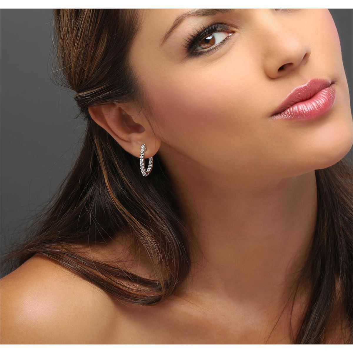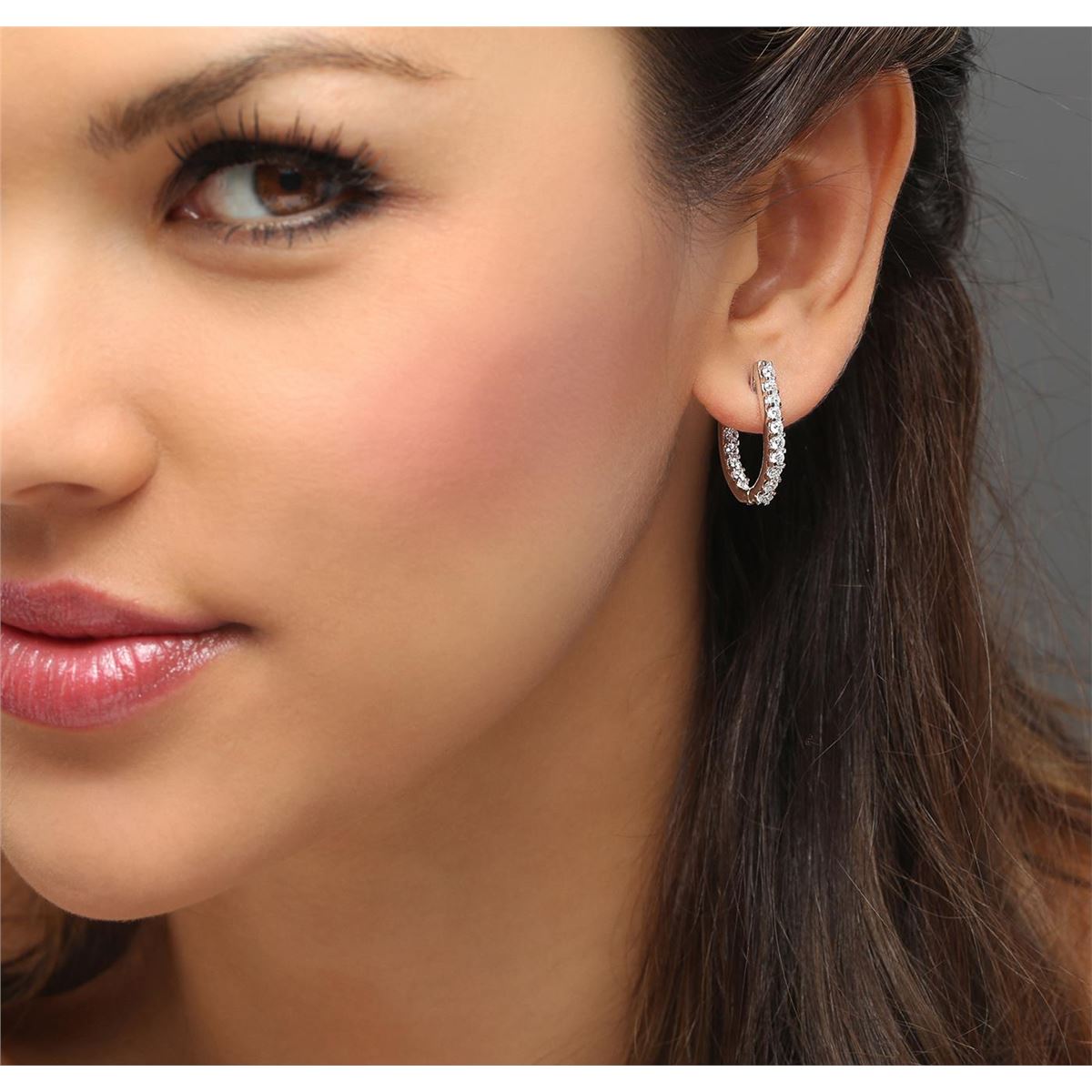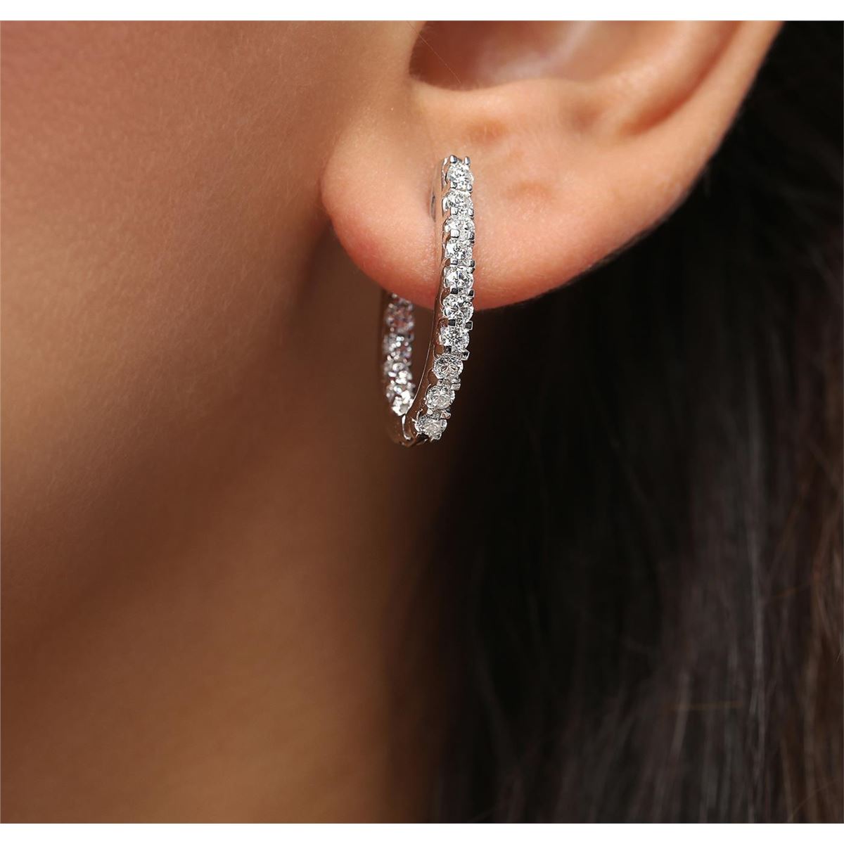 One pair electronically tested 14KT white gold ladies combination cast & assembled hoop earrings with hinged clip backs with a bright polish finish. Identified with markings of "14K". Condition is new. Containing: Thirty-Two prong set round brilliant cut diamonds, measuring 2.40 - 2.40 x 1.44mm (depth est.) approximate total weight of 32 Stones = 1.62ct. Clarity: SI-1 to I-1. Color: I - J, Cut is Good. All diamonds are graded in the mounting, unless otherwise stated. Total Weight of Diamonds 1.62ct. Total Weight of Earrings 7.30 grams. GGL Appraised at $4,710.00.