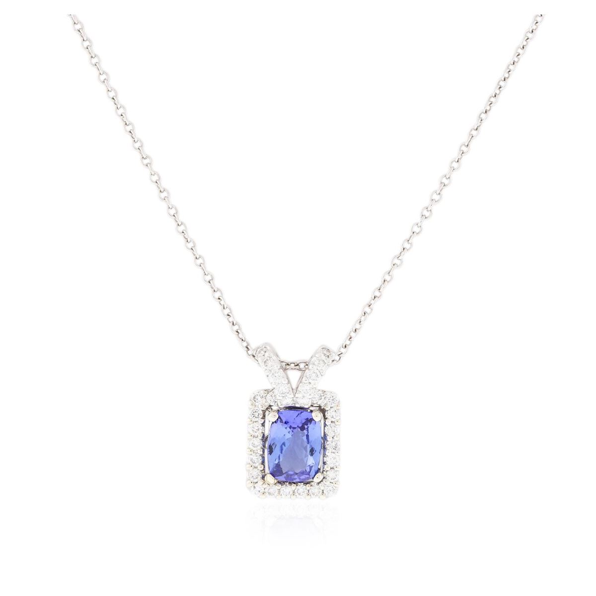 One electronically tested 14KT white gold ladies cast & assembled tanzanite and diamond pendant with chain. Condition is new, good workmanship. The pendant features a tanzanite set within a diamond bezel, completed by diamond set split bail. The pendant is supported by an eighteen inch length 14KT white gold designer style chain, terminating in a lobster claw clasp. Bright polish finish. Identified with markings of "14K". Containing: a One prong set rectangular cushion mixed cut natural tanzanite, measuring 8.50 x 6.50 x 3.65mm, approximate weight of 1.63ct., clarity is eye clean, type I, medium dark, very slightly grayish, bluish violet color, (GIA bV 6/3), cut is good. Transmitting light with no distortion, transparent. Graded in the setting. Tanzanite is a very rare gemstone that is only found in the country of Tanzania. Originally discovered in 1967. Tiffany & Company, named the stone Tanzanite. It is found in the Usumburu Mountains that border the Umba Valley of northern Tanzania. Tanzanite occurs in gray, brown, violet, blue, reddish-purple, & green. The gem is interesting because of its exceptional pleochroism. Rotated in different directions a tanzanite will exhibit multiple changes of color. Tanzanite has a low tolerance to ultrasonic cleaning, and should not be cleaned using this method. Thirty prong set round brilliant cut diamonds, measuring 1.80 - 1.70 x 1.05mm (depth est.) approximate total weight of 30 Stones = 0.58ct. Graded in the setting. Clarity SI-1 to I-1. Color G - I. Total Weight of Colored Stones 1.63ct. Total Weight of Diamonds 0.58ct. Total Weight of Pendant With Chain 5.89gm. AIG Appraised at $6,005.00.