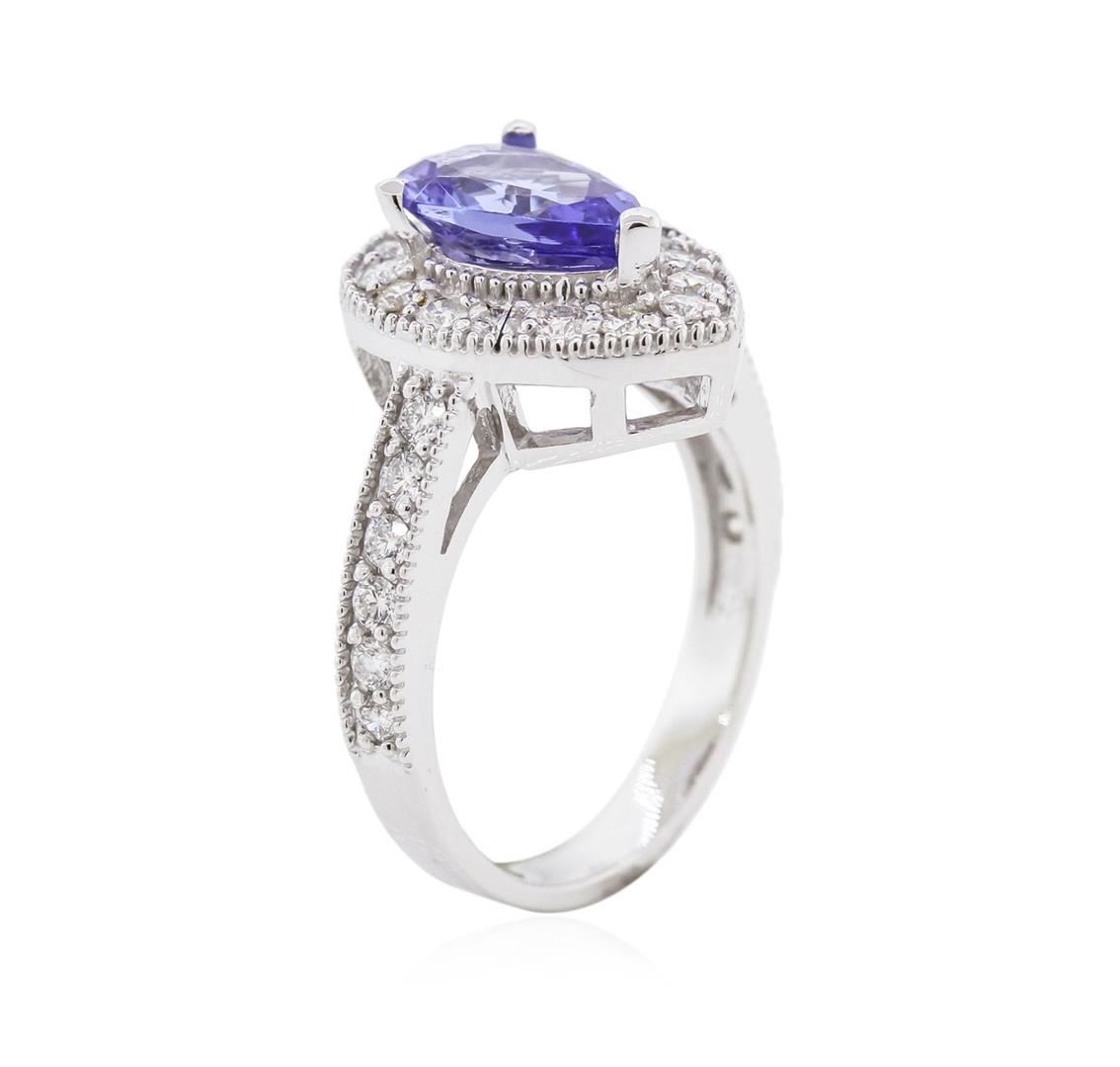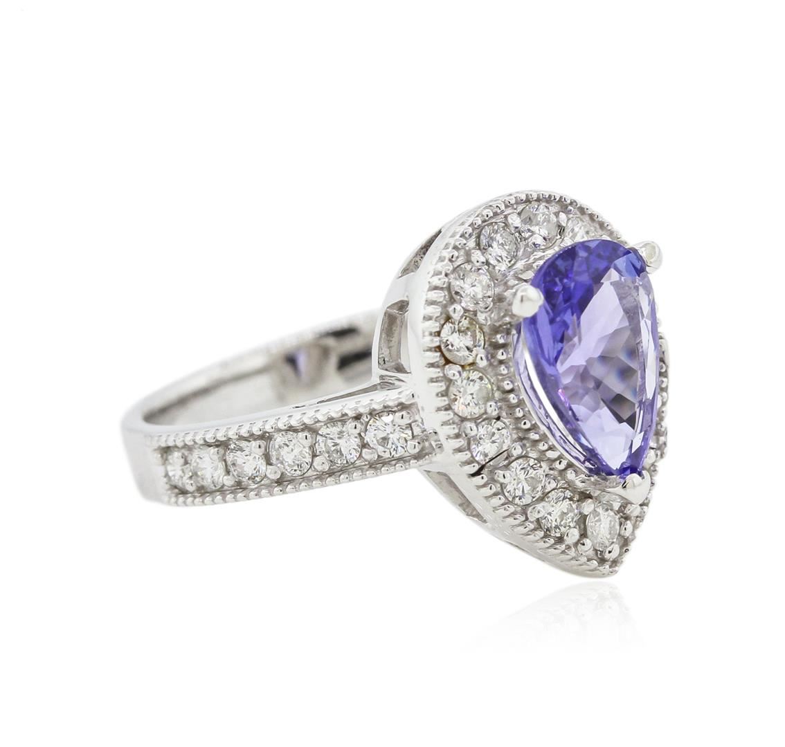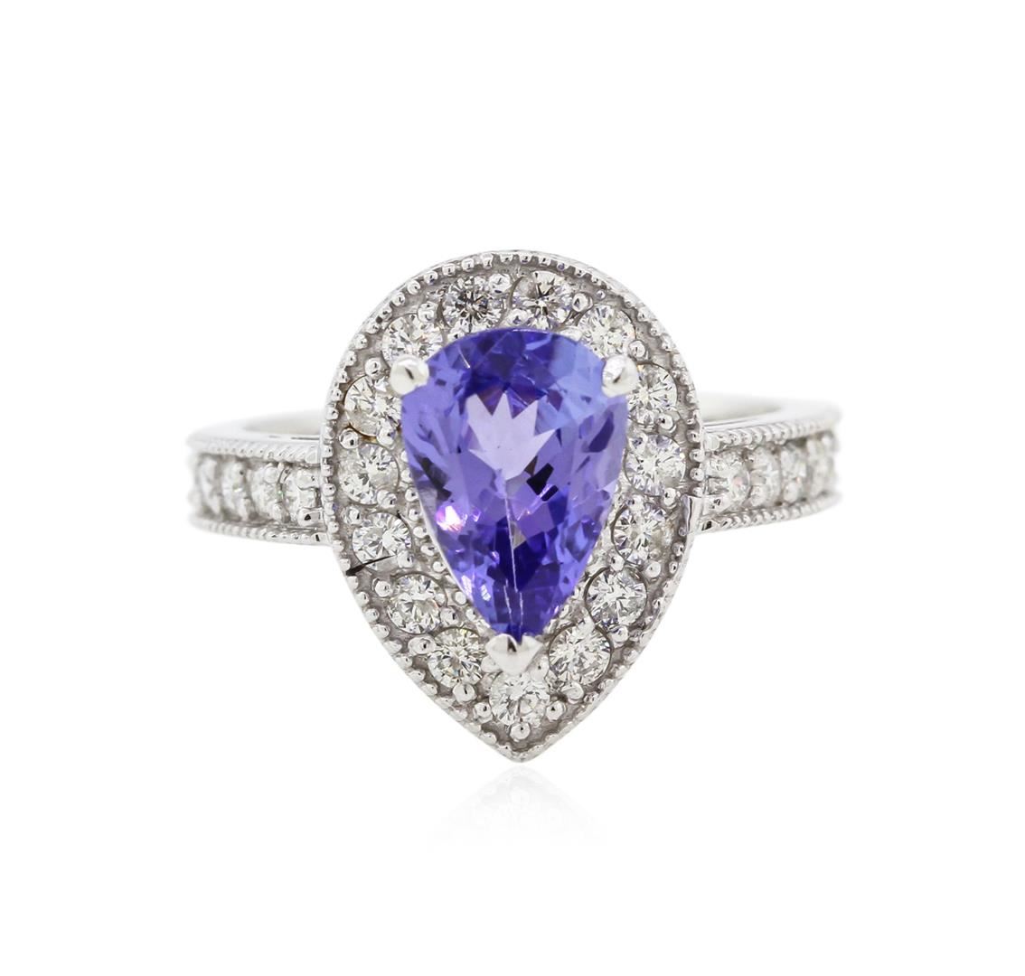 One electronically tested 14KT white gold ladies cast tanzanite and diamond ring with a bright polish finish. Identified with markings of "14K". Condition is new. Containing: One prong set pear modified brilliant cut natural tanzanite, measuring 9.00 x 6.83 x 3.95mm, approximate weight of 1.63ct., clarity is eye clean, type I, medium, very slightly grayish, violet color, (GIA V 5/3), cut is good. Twenty-Seven prong set round brilliant cut diamonds, measuring 1.50 - 1.50 x 0.90mm (depth est.) approximate total weight of 27 Stones = 0.33ct. Clarity: SI-2 to I-1. Color: I - J, Cut is Good. All diamonds and colored gemstones are graded in the mounting, unless otherwise stated. Colored gemstones are presumed to have been subjected to commonly used enhancement processes. Total Weight of Colored Stones 1.63ct. Total Weight of Diamonds 0.33ct. Total Weight of Ring 5.30 grams. GGL Appraised at $2,635.00.