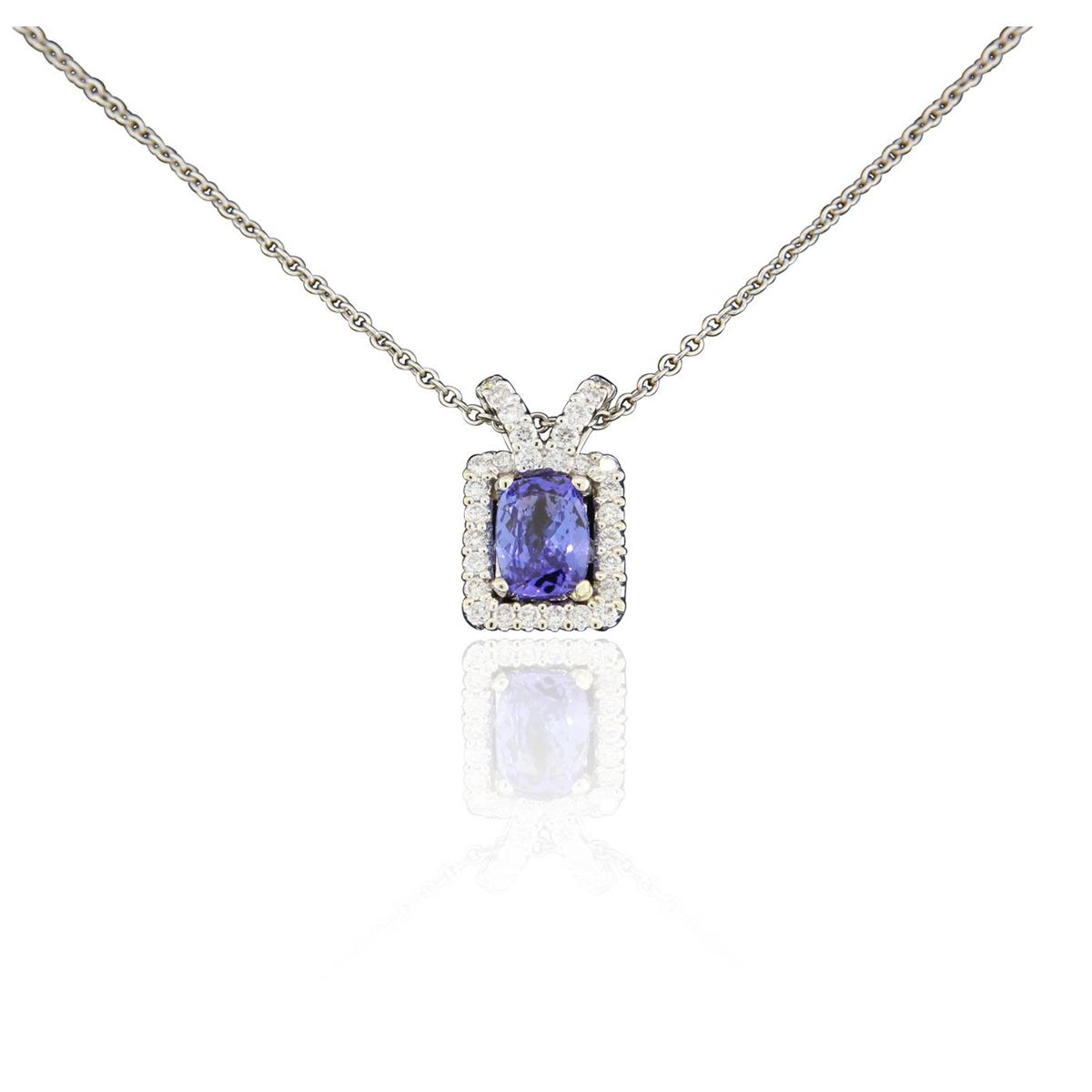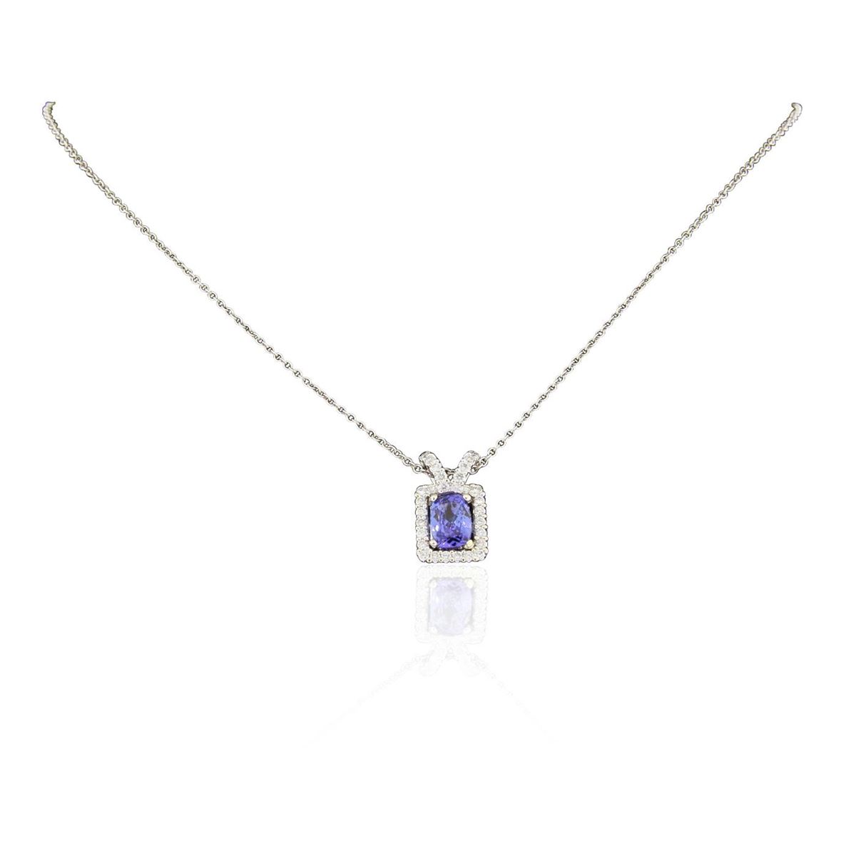One electronically tested 14KT white gold ladies cast & assembled tanzanite and diamond pendant with chain. Condition is new, good workmanship. The pendant features a tanzanite set within a diamond bezel, completed by diamond set split bail. The pendant is supported by an eighteen inch length 14KT white gold designer style chain, terminating in a lobster claw clasp. Bright polish finish. Identified with markings of "14K". Containing: a One prong set rectangular cushion mixed cut natural tanzanite, measuring 8.50 x 6.50 x 3.65mm, approximate weight of 1.63ct., clarity is eye clean, type I, medium dark, very slightly grayish, bluish violet color, (GIA bV 6/3), cut is good. Transmitting light with no distortion, transparent. Graded in the setting. Tanzanite is a very rare gemstone that is only found in the country of Tanzania. Originally discovered in 1967. Tiffany & Company, named the stone Tanzanite. It is found in the Usumburu Mountains that border the Umba Valley of northern Tanzania. Tanzanite occurs in gray, brown, violet, blue, reddish-purple, & green. The gem is interesting because of its exceptional pleochroism. Rotated in different directions a tanzanite will exhibit multiple changes of color. Tanzanite has a low tolerance to ultrasonic cleaning, and should not be cleaned using this method. Thirty prong set round brilliant cut diamonds, measuring 1.80 - 1.70 x 1.05mm (depth est.) approximate total weight of 30 Stones = 0.58ct. Graded in the setting. Clarity SI-1 to I-1. Color G - I. Total Weight of Colored Stones 1.63ct. Total Weight of Diamonds 0.58ct. Total Weight of Pendant With Chain 5.89gm. AIG Appraised at $6,005.00.