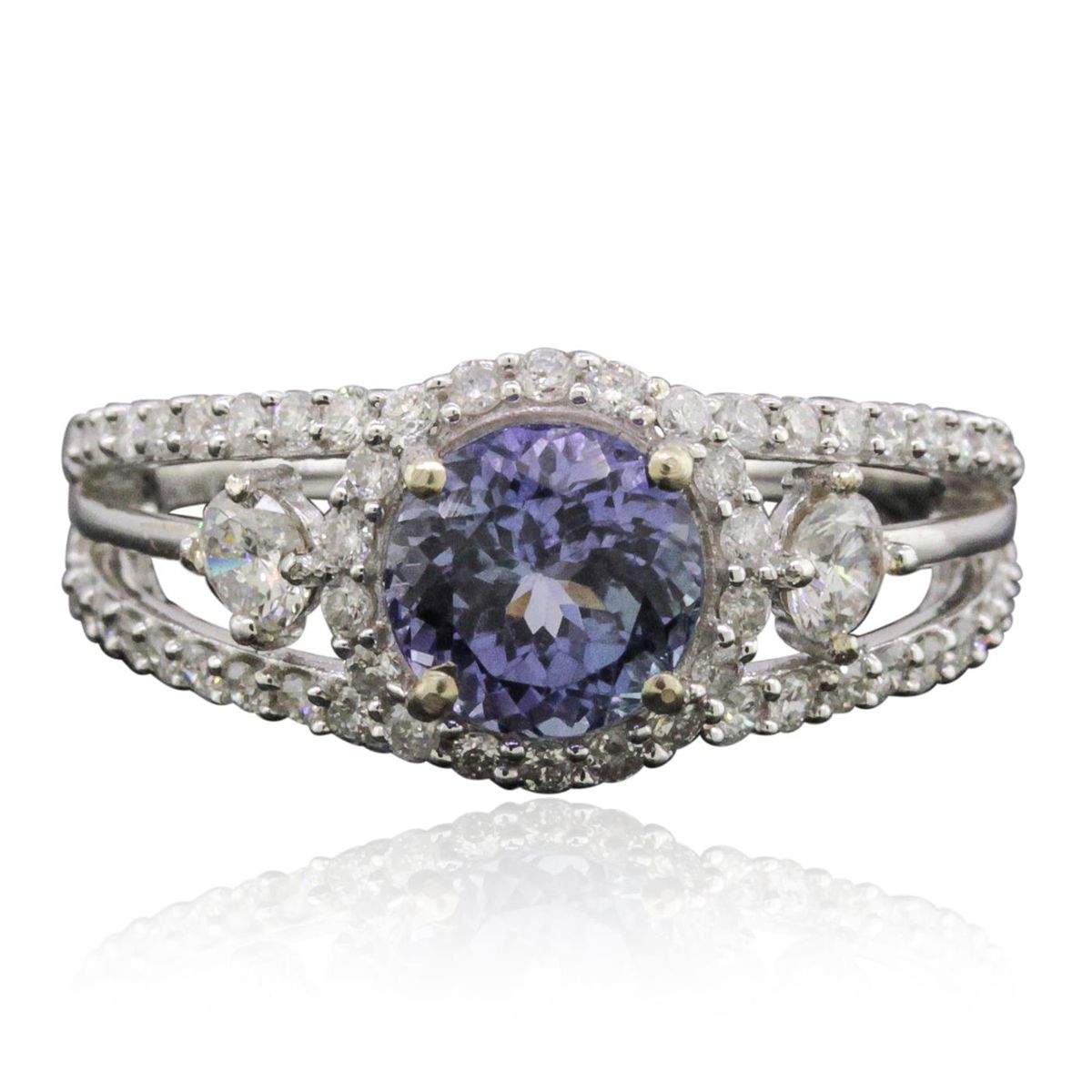 One electronically tested 14KT white gold ladies combination cast & assembled tanzanite and diamond ring with a split shank with a bright polish finish. Identified with markings of "14K". Condition is new. Containing: One prong set round modified brilliant cut natural tanzanite, measuring 6.90 - 6.90 x 5.11 mm, approximate weight of 1.63ct., clarity is eye clean, type I, medium light, very slightly grayish, violet color, (GIA V 4/3), cut is very good. Two prong set round brilliant cut diamonds, measuring 3.10 - 3.10 x 1.86mm (depth est.) approximate total weight of 2 Stones = 0.22ct. Clarity: I-1. Color: H, Cut is Good. Fifty-Four prong set round brilliant cut diamonds, measuring 1.20 - 1.20 x 0.72mm (depth est.) approximate total weight of 54 Stones = 0.34ct. Clarity: I-1 to I-2. Color: H - I, Cut is Good. Colored gemstones are presumed to have been subjected to commonly used enhancement processes. All diamonds and colored gemstones are graded in the mounting, unless otherwise stated. Total Weight of Colored Stones 1.63ct. Total Weight of Diamonds 0.56ct. Total Weight of Ring 4.10 grams. GGL Appraised at $5,930.00.
