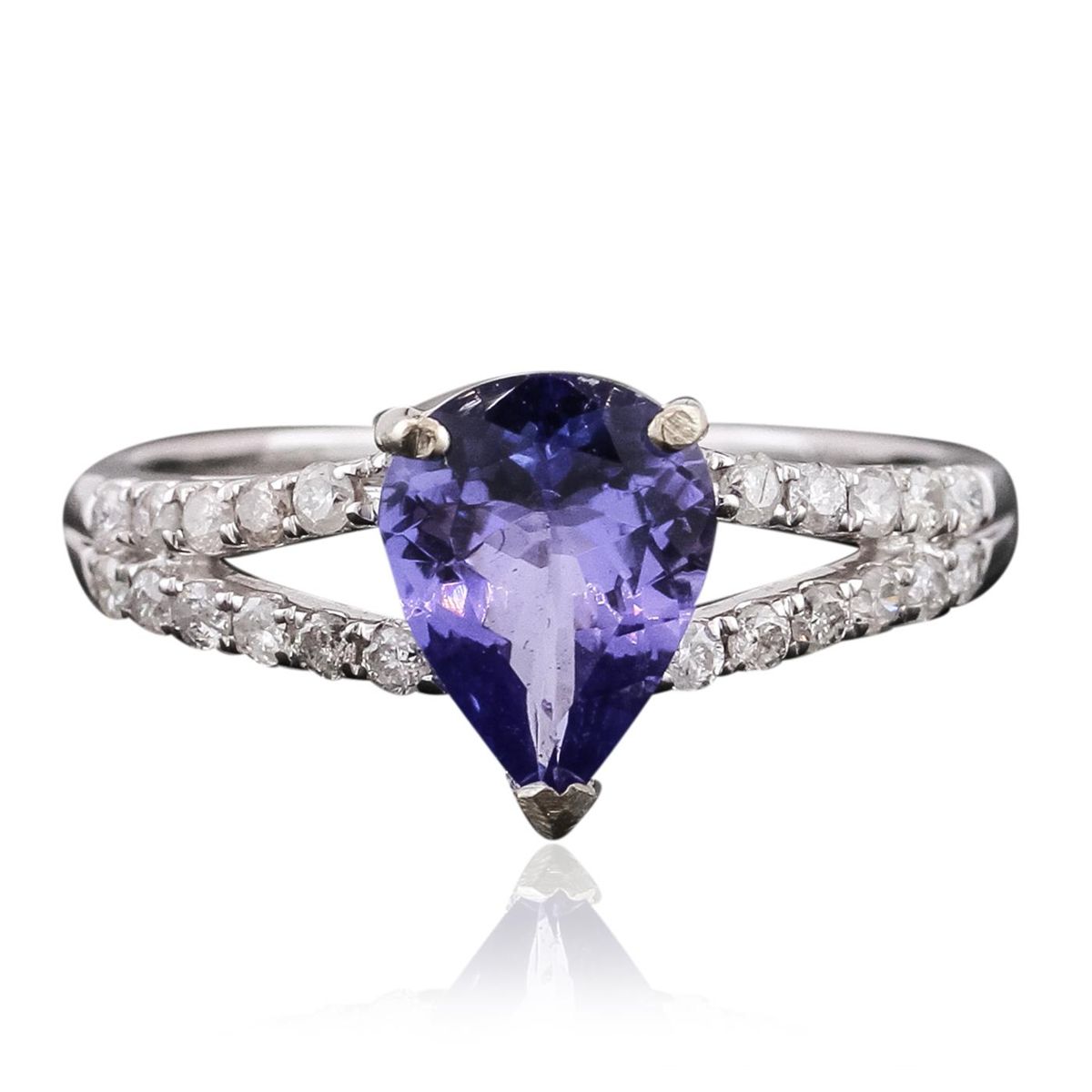 One electronically tested 14KT white gold ladies cast tanzanite and diamond ring with a bright polish finish. The featured tanzanite is supported by diamond set split shoulders, completed by a one millimeter wide band. Trademark is Orianne. Identified with markings of "14K". Condition is new, good workmanship. Containing: One prong set pear brilliant cut natural tanzanite, measuring 9.00 x 6.80 x 3.75mm, 6% bulge factor, approximate weight of 1.63ct., clarity is eye clean, type I, medium dark, very slightly grayish, bluish violet color, (GIA bV 6/3), cut is good. Transmitting light with no distortion, transparent. Graded in the setting. Tanzanite is a very rare gemstone that is only found in the country of Tanzania. Originally discovered in 1967. Tiffany & Company, named the stone Tanzanite. It is found in the Usumburu Mountains that border the Umba Valley of northern Tanzania. Tanzanite occurs in gray, brown, violet, blue, reddish-purple, & green. The gem is interesting because of its exceptional pleochroism. Rotated in different directions a tanzanite will exhibit multiple changes of color. Tanzanite has a low tolerance to ultrasonic cleaning, and should not be cleaned using this method. Twenty-Two prong set round brilliant cut diamonds, measuring 1.50 - 1.40 x 0.87mm (depth est.) approximate total weight of 22 Stones = 0.34ct. Graded in the setting. Clarity: I-1 to I-3. Color: G - I. Total Weight of Colored Stones 1.63ct. Total Weight of Diamonds 0.34ct. Total Weight of Ring 2.06 grams. AIG Appraised at $4,240.00.