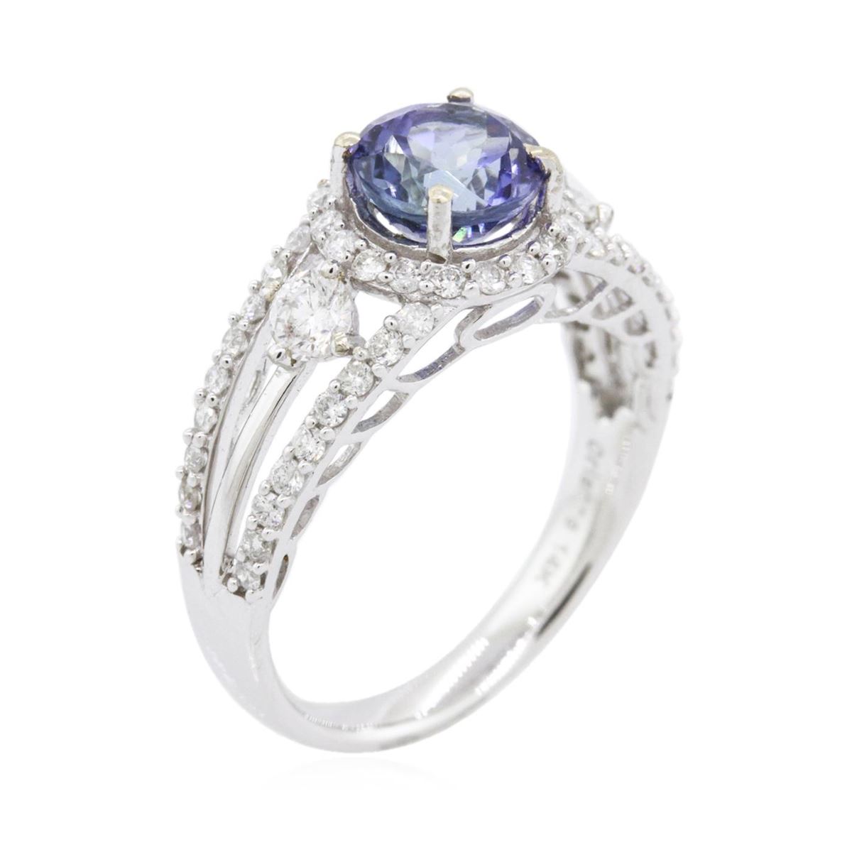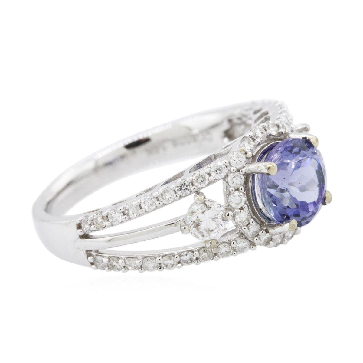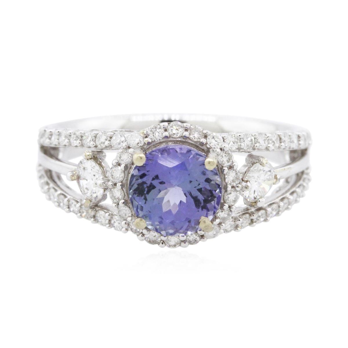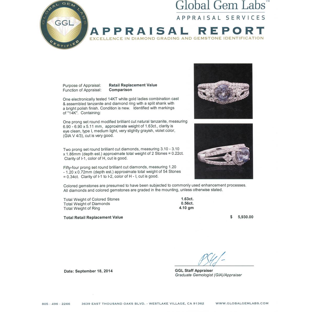 One electronically tested 14KT white gold ladies combination cast & assembled tanzanite and diamond ring with a split shank with a bright polish finish. Identified with markings of "14K". Condition is new. Containing: One prong set round modified brilliant cut natural tanzanite, measuring 6.90 - 6.90 x 5.11 mm, approximate weight of 1.63ct., clarity is eye clean, type I, medium light, very slightly grayish, violet color, (GIA V 4/3), cut is very good. Two prong set round brilliant cut diamonds, measuring 3.10 - 3.10 x 1.86mm (depth est.) approximate total weight of 2 Stones = 0.22ct. Clarity: I-1. Color: H, Cut is Good. Fifty-Four prong set round brilliant cut diamonds, measuring 1.20 - 1.20 x 0.72mm (depth est.) approximate total weight of 54 Stones = 0.34ct. Clarity: I-1 to I-2. Color: H - I, Cut is Good. Colored gemstones are presumed to have been subjected to commonly used enhancement processes. All diamonds and colored gemstones are graded in the mounting, unless otherwise stated. Total Weight of Colored Stones 1.63ct. Total Weight of Diamonds 0.56ct. Total Weight of Ring 4.10 grams. GGL Appraised at $5,930.00.