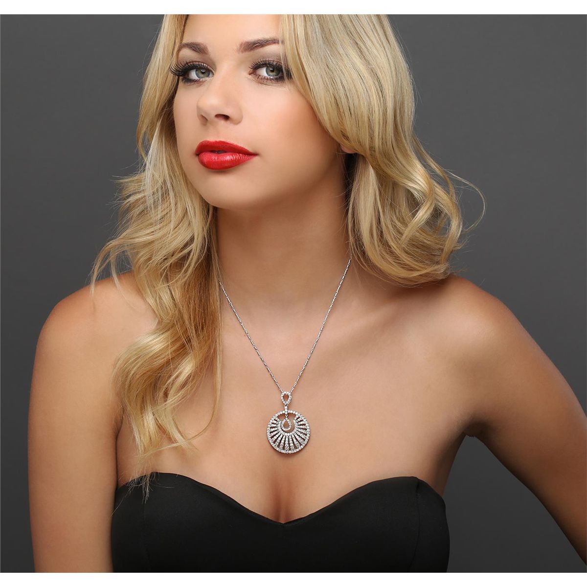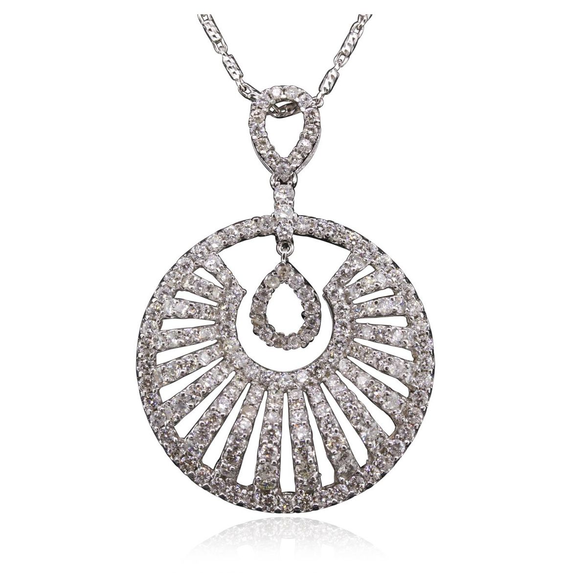 One electronically tested 14KT white gold Ladies combination cast & assembled pendant & chain 17.0" long, medium fancy link with a lobster claw clasp with a bright polish finish. Condition is new. Identified with markings of "14K". Containing: Ninety-One prong set round brilliant cut diamonds, measuring 1.90 - 1.50 x 1.02mm (depth est.) approximate. Total Weight of 91 Stones = 1.63ct. Clarity: I-1 to I-2. Color: I - J, Cut is Good. All grading of diamonds and colored gemstones in this piece of jewelry are graded in the mounting, unless otherwise stated. Total Weight of Diamonds 1.63ct. Total Weight of Pendant & Chain 21.60 grams. GGL Appraised at $10,100.00.