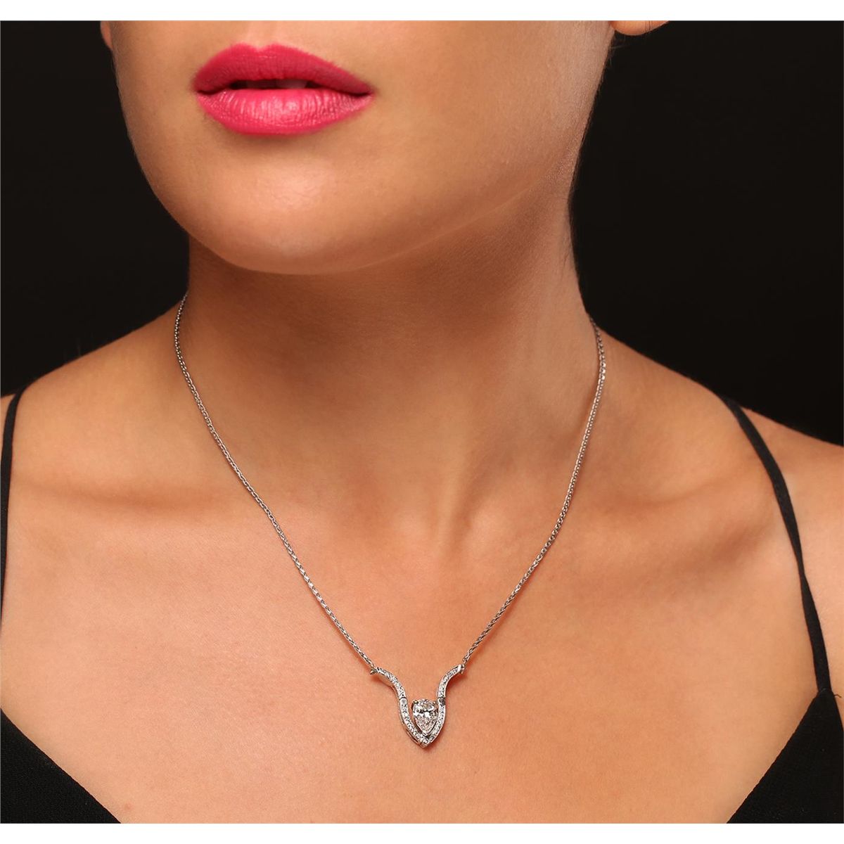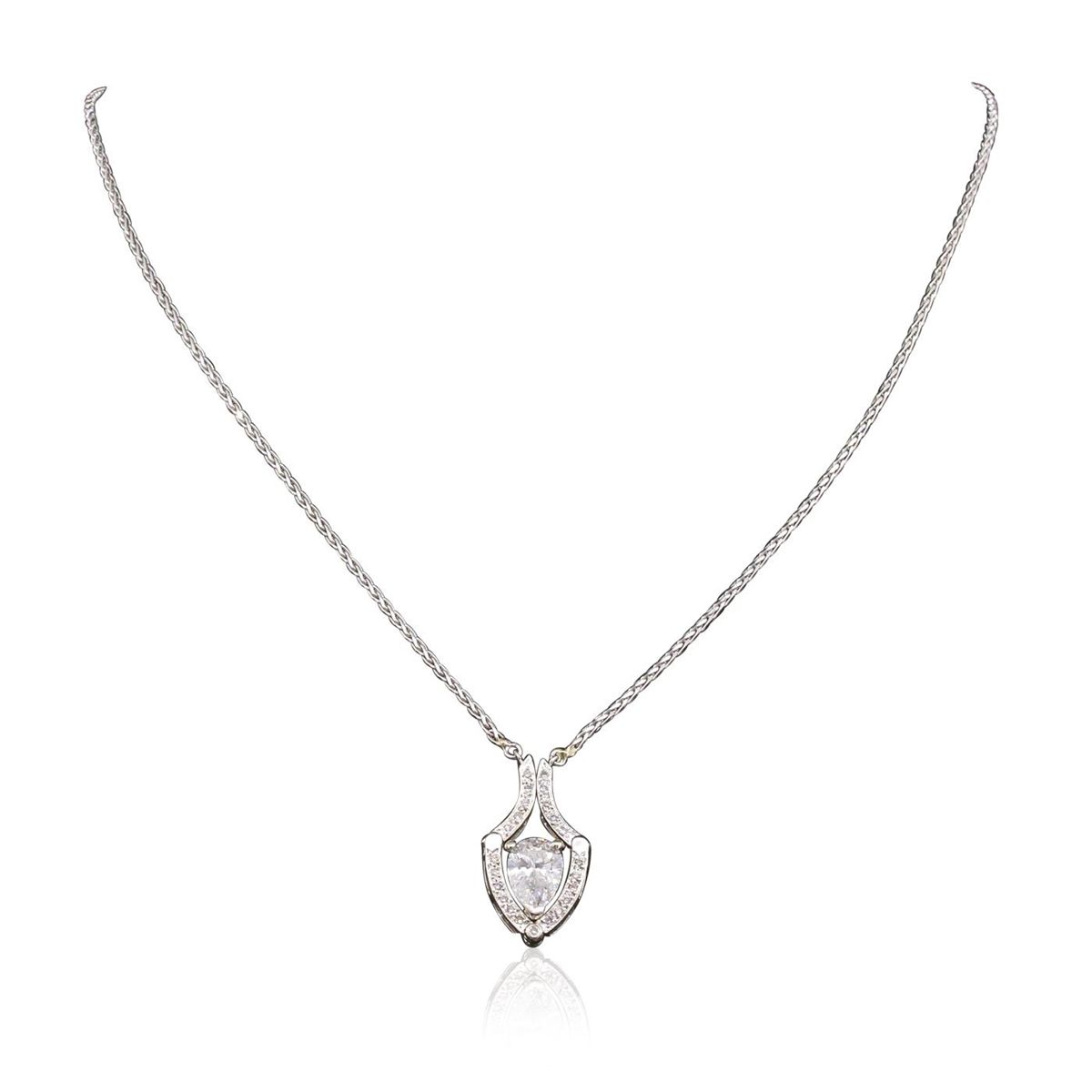 One electronically tested 14KT white gold ladies cast & assembled diamond pendant with chain. Condition is good. The pendant features the ability to be worn in two different ways. The first design features a pear shaped diamond set within a stylized diamond frame. While the second design features a ridged diamond set chevron design with a pear shaped diamond dangle. The pendant is supported by an attached sixteen inch length 14KT white gold designer style wheat chain, terminating in a spring ring clasp. Bright polish finish with milgrain detailing. Identified with markings of "14K". Containing: One prong set pear shaped cut diamond, measuring 9.30 x 6.35 x 3.78mm (depth est.) approximate weight of 1.43ct, laser drilled with a medium blue fluorescence. Graded in the setting. Clarity: I-1. Color: G Depth 59.5%. Table 58.3%. Twenty-Three bead & bezel set round brilliant cut diamonds, measuring 1.20 - 1.10 x 0.69mm (depth est.) approximate. Total Weight of 23 Stones = 0.20ct. Graded in the setting. Clarity: VS-1 to VS-2. Color: G - I. Total Weight of Diamonds 1.63ct. Total Weight of Pendant With Chain 7.38 grams. AIG Appraised at $15,625.00.