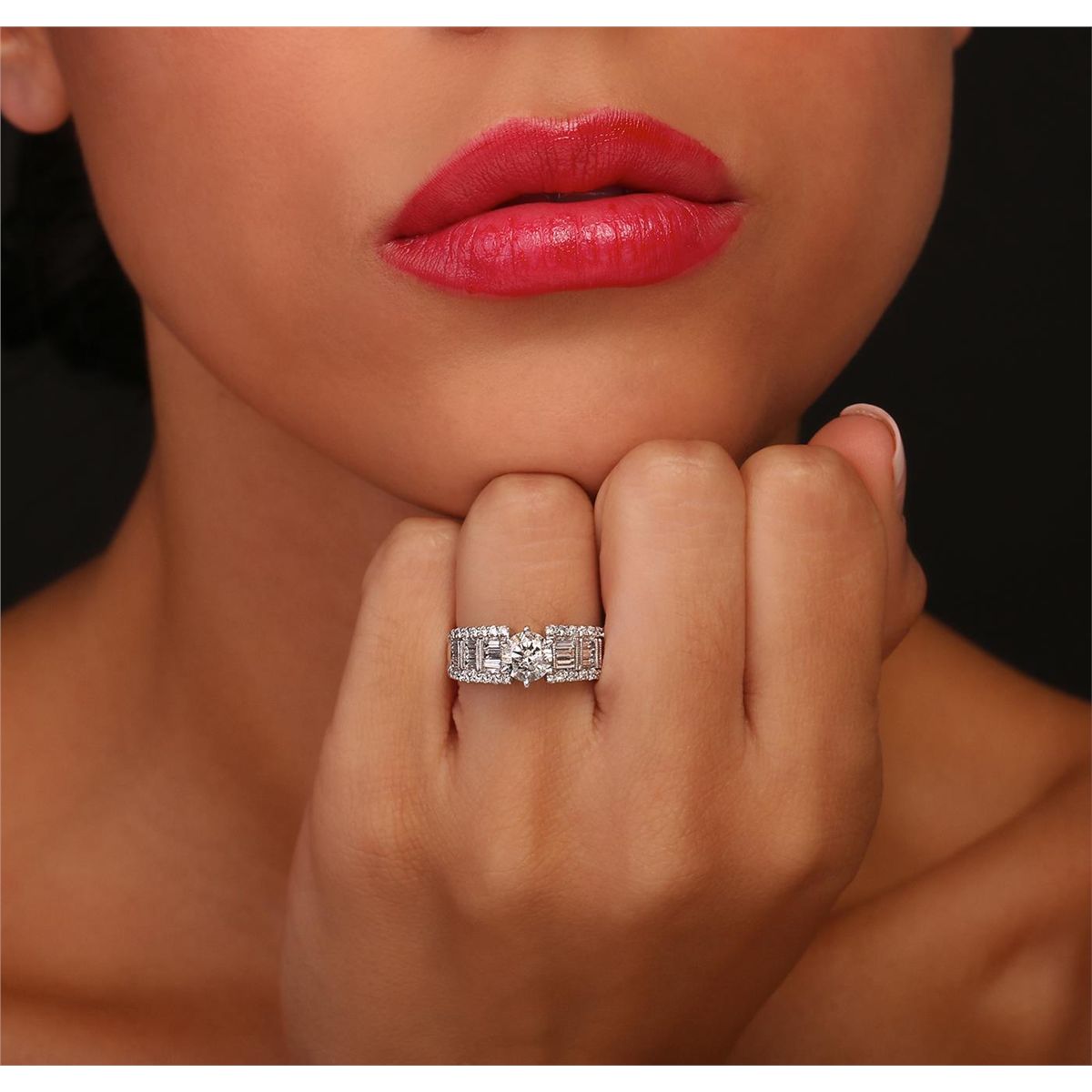 One electronically tested 14KT white gold Ladies combination cast & assembled engagement ring with a bright polish finish. Condition is new. Identified with markings of "14K". Containing: One prong set round brilliant cut diamond, measuring 6.40 - 6.40 x 4.30mm (depth est.) approximate weight of 1.07ct. Clarity: I-1. Color: I, Cut is Good. Twenty-Eight prong set round brilliant cut diamonds, measuring 1.30 - 1.30 x 0.78mm (depth est.) approximate. Total Weight of 28 Stones = 0.22ct. Clarity: SI-2 to I-1. Color: I - J, Cut is Good. Eighteen channel set baguette cut diamonds, measuring 2.40 x 1.00 x 0.85mm (depth est.) approximate. Total Weight of 18 Stones = 0.34ct. Clarity: VS-2. Color: I - J, Cut is Good. Total Weight of Diamonds 1.63ct. Total Weight of Engagement Ring 6.70 grams. GGL Appraised at $19,290.00.