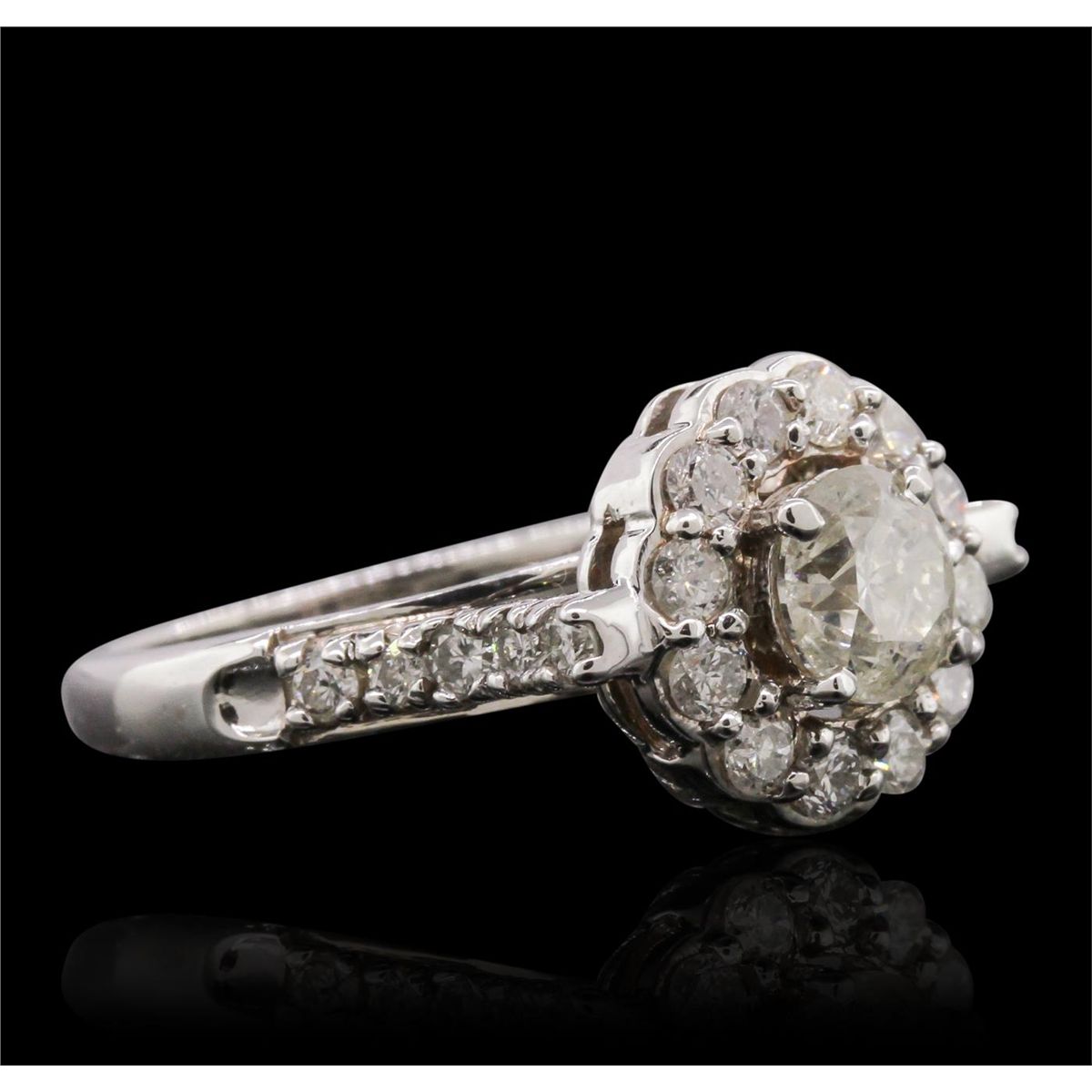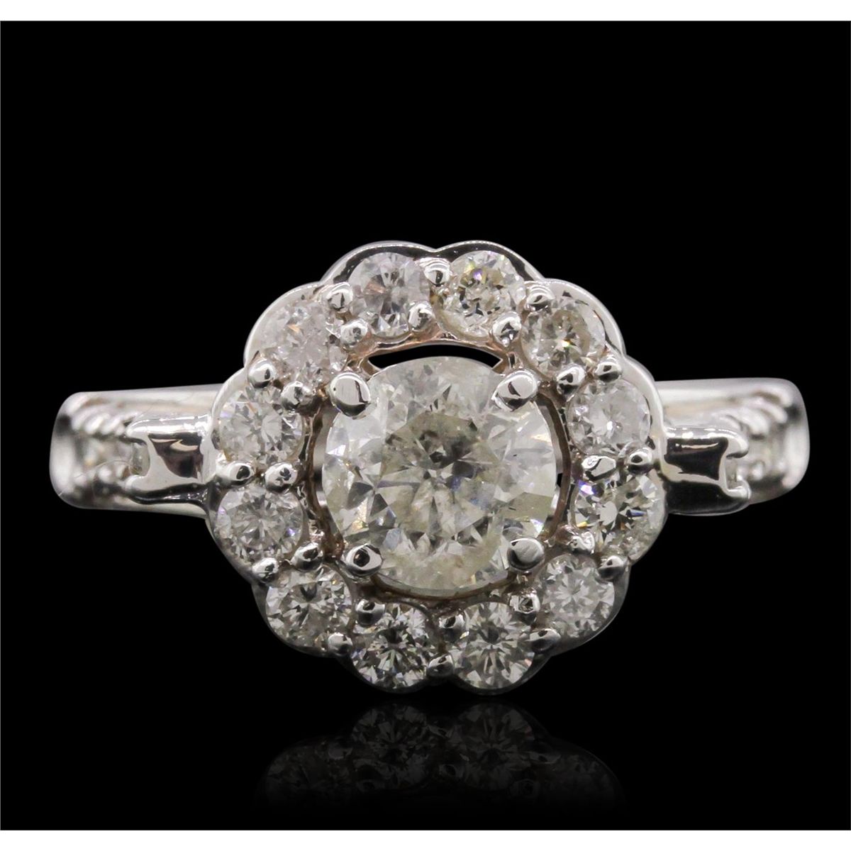 One electronically tested 14KT white gold ladies cast diamond unity ring with a bright polish finish. Condition is new, good workmanship. The featured diamond is set within a diamond bezel supported by diamond set shoulders, completed by a two millimeter wide band. Identified with markings of "585". Containing: One prong set round brilliant cut diamond, measuring 5.75 - 5.70 x 4.00mm (depth est.) approximate weight of 0.84ct with a medium blue fluorescence. Graded in the setting. Clarity: I-2. Color: 69.8%. Table 55.9%. Twenty-Two prong set round brilliant cut diamonds, measuring 2.30 - 2.00 x 1.29mm (depth est.) approximate. Total Weight of 22 Stones = 0.79ct. Graded in the setting. Clarity: SI-1 to I-1. Color: G - I. Total Weight of Diamonds 1.63ct. Total Weight of Ring 4.62 grams. AIG Appraised at $7,300.00.
