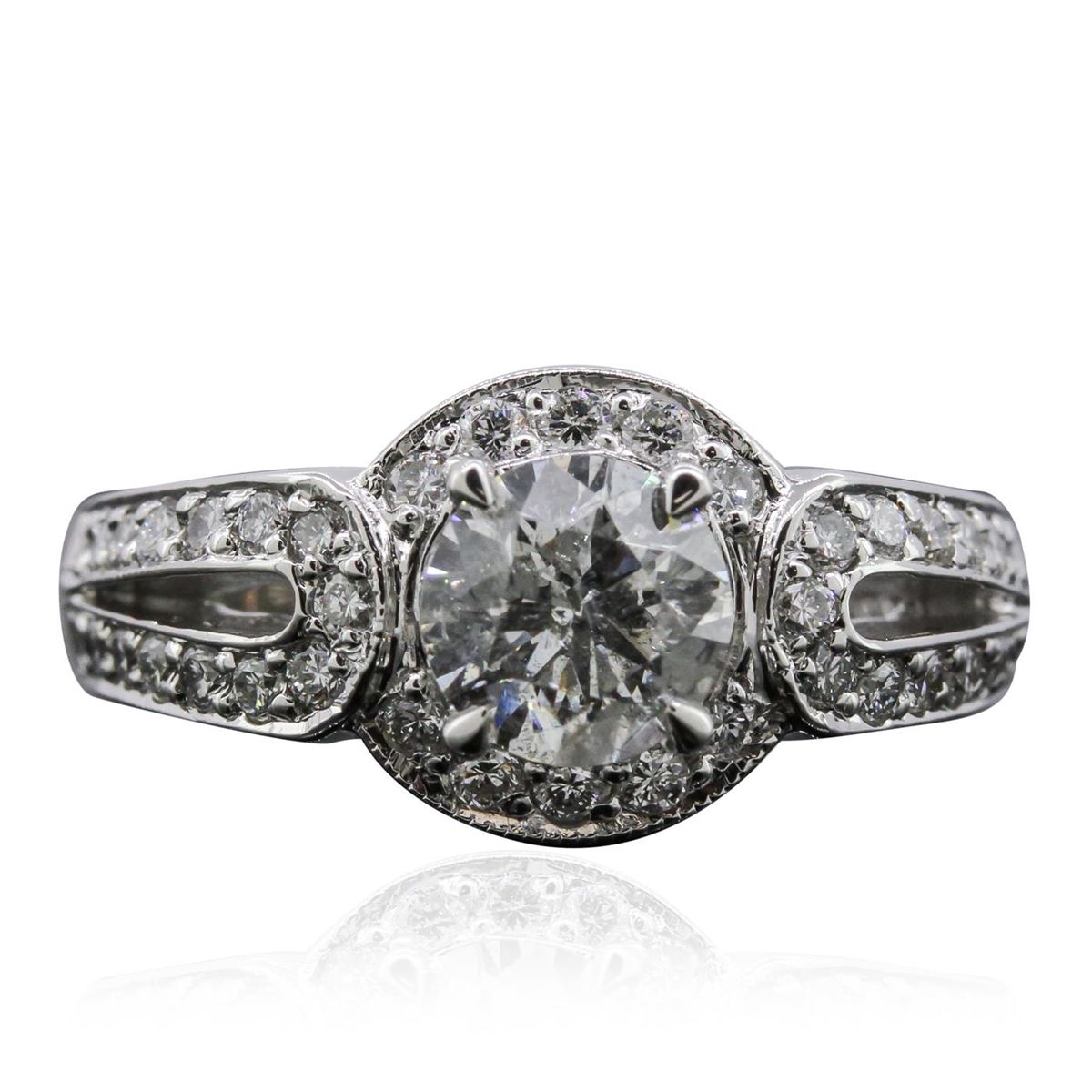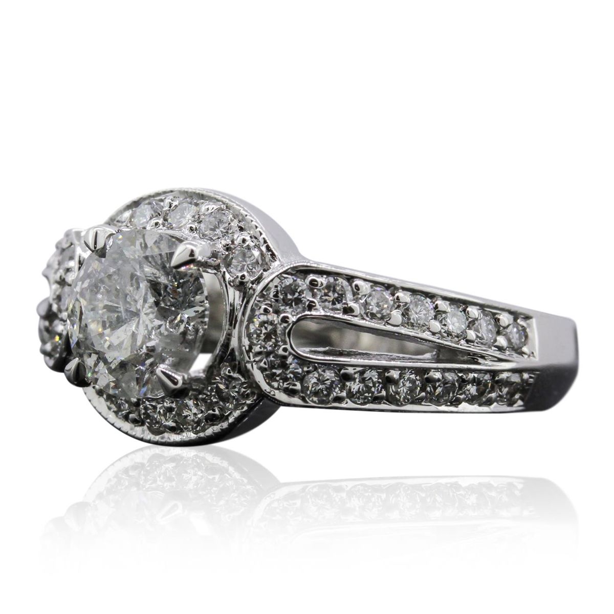 One electronically tested 14KT white gold ladies cast diamond ring. Condition is new, good workmanship. The featured diamond is set within a diamond bezel supported by diamond set split shoulders, completed by a three millimeter wide band. Bright polish finish with milgrain detailing. Identified with markings of "14K". Containing: One prong set round brilliant cut diamond, measuring 6.40 - 6.35 x 4.03mm (depth est.) approximate weight of 1.09ct. Graded in the setting. Clarity: I-2. Color: J Depth 63.2%. Table 56.4%. Forty bead set round brilliant cut diamonds, measuring 1.50 - 1.40 x 0.87mm (depth est.) approximate. Total Weight of 40 Stones = 0.54ct. Graded in the setting. Clarity: VS-2 to SI-1. Color: G - I. Total Weight of Diamonds 1.63ct. Total Weight of Ring 7.30 grams. AIG Appraised at $11,905.00.