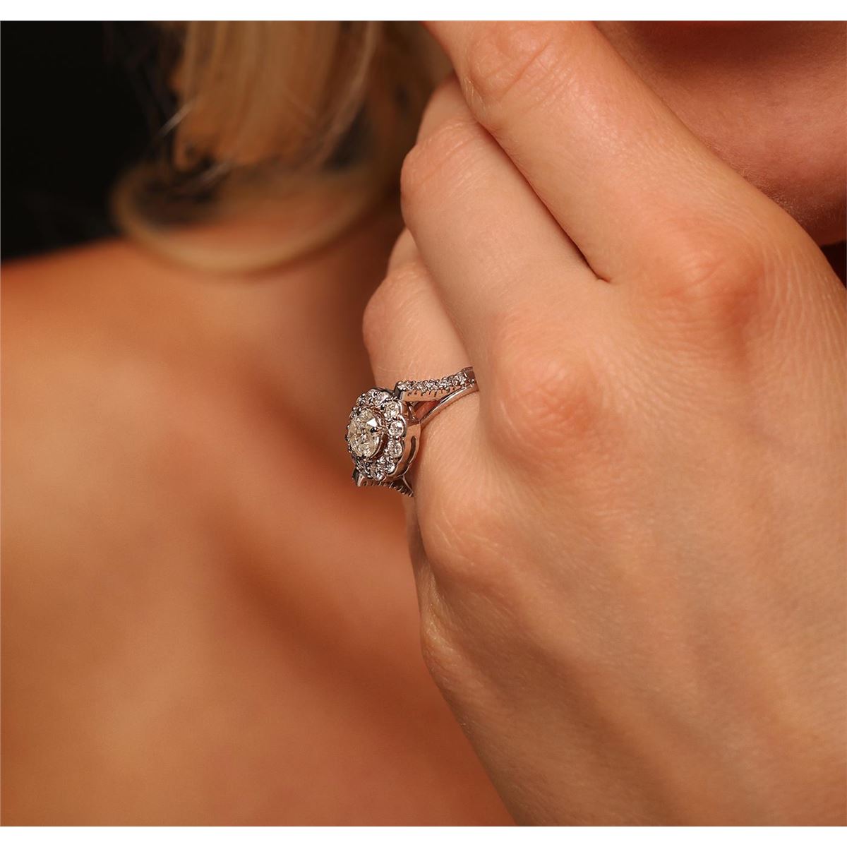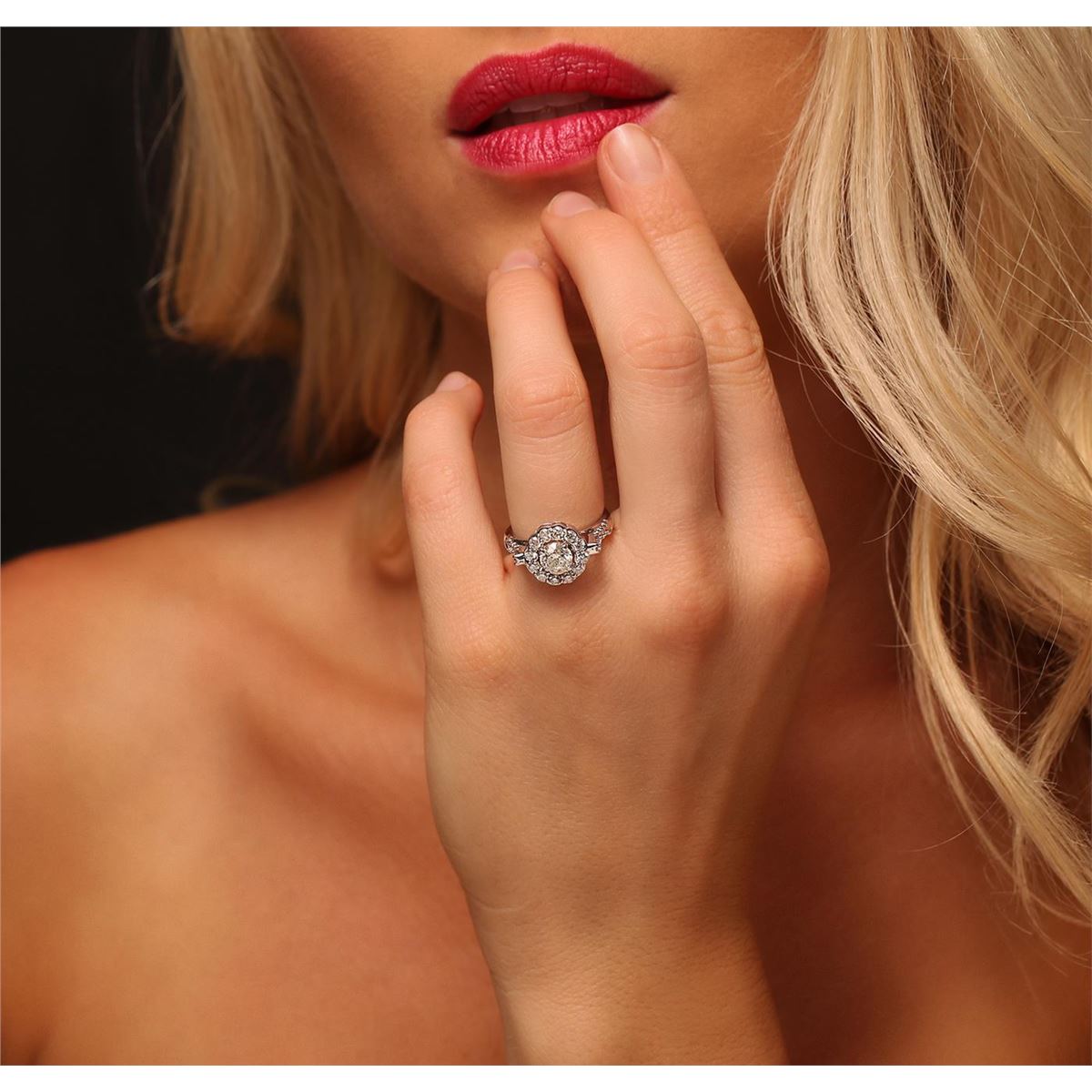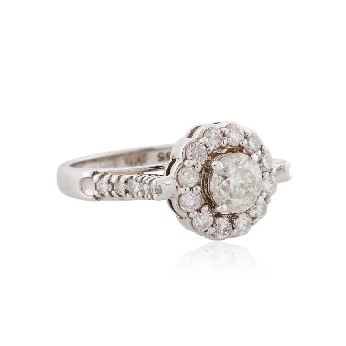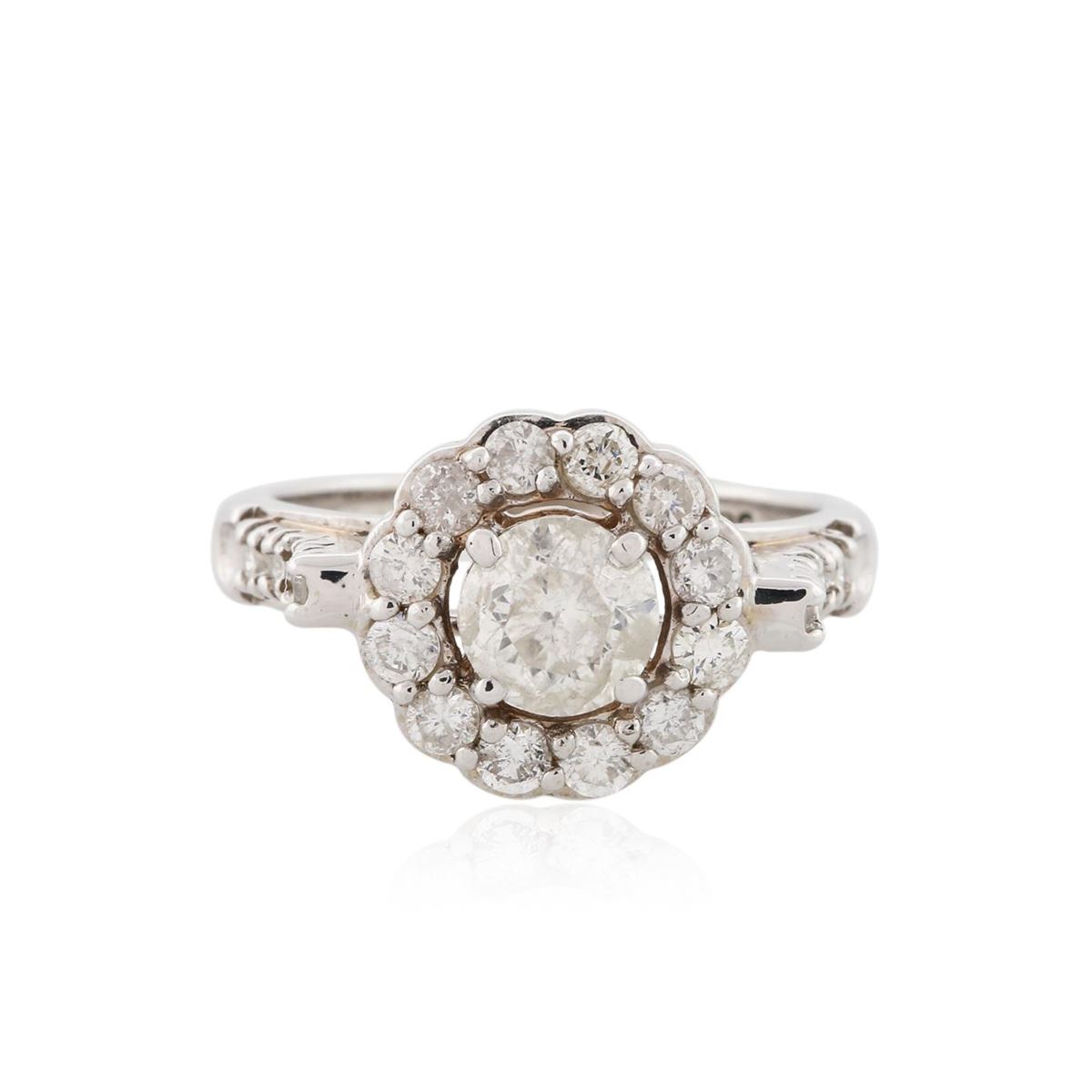 One electronically tested 14KT white gold ladies cast diamond unity ring with a bright polish finish. Condition is new, good workmanship. The featured diamond is set within a diamond bezel supported by diamond set shoulders, completed by a two millimeter wide band. Identified with markings of "585". Containing: One prong set round brilliant cut diamond, measuring 5.75 - 5.70 x 4.00mm (depth est.) approximate weight of 0.84ct with a medium blue fluorescence. Graded in the setting. Clarity: I-2. Color: 69.8%. Table 55.9%. Twenty-Two prong set round brilliant cut diamonds, measuring 2.30 - 2.00 x 1.29mm (depth est.) approximate. Total Weight of 22 Stones = 0.79ct. Graded in the setting. Clarity: SI-1 to I-1. Color: G - I. Total Weight of Diamonds 1.63ct. Total Weight of Ring 4.62 grams. AIG Appraised at $7,300.00.