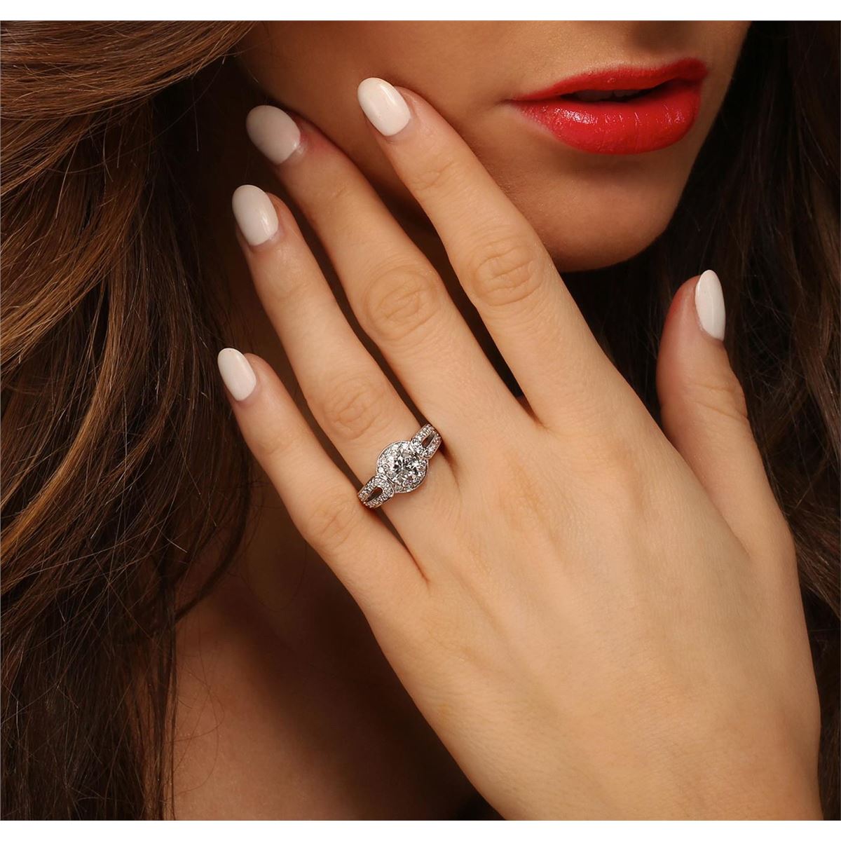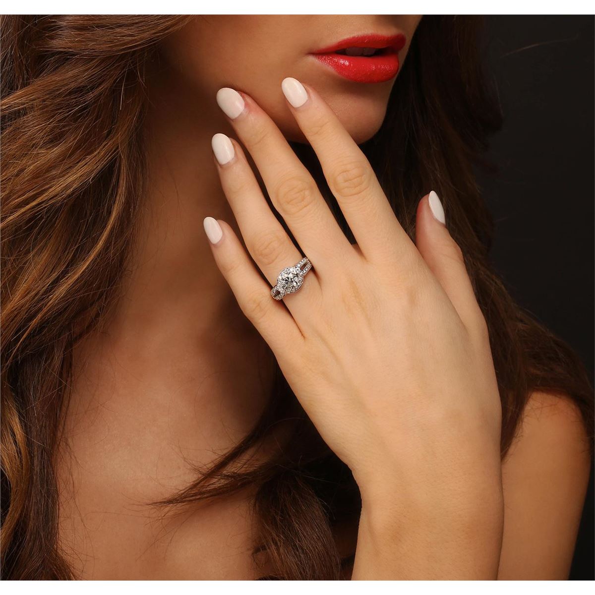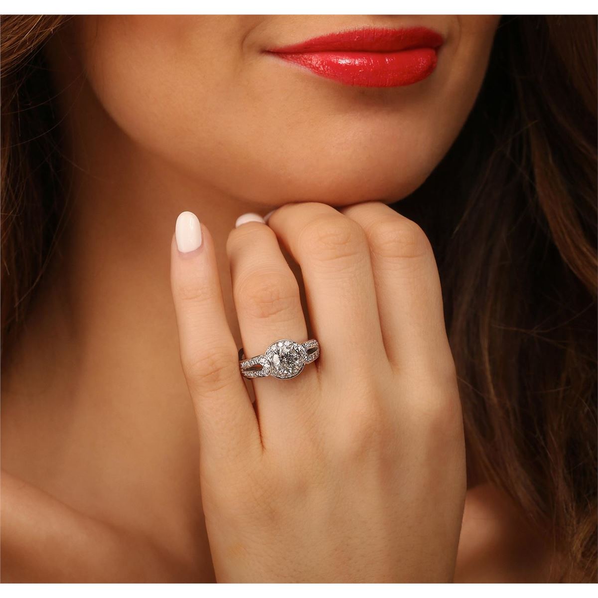 One electronically tested 14KT white gold ladies cast diamond ring. Condition is new, good workmanship. The featured diamond is set within a diamond bezel supported by diamond set split shoulders, completed by a three millimeter wide band. Bright polish finish with milgrain detailing. Identified with markings of "14K". Containing: One prong set round brilliant cut diamond, measuring 6.40 - 6.35 x 4.03mm (depth est.) approximate weight of 1.09ct. Graded in the setting. Clarity: I-2. Color: J Depth 63.2%. Table 56.4%. Forty bead set round brilliant cut diamonds, measuring 1.50 - 1.40 x 0.87mm (depth est.) approximate. Total Weight of 40 Stones = 0.54ct. Graded in the setting. Clarity: VS-2 to SI-1. Color: G - I. Total Weight of Diamonds 1.63ct. Total Weight of Ring 7.30 grams. AIG Appraised at $11,905.00.