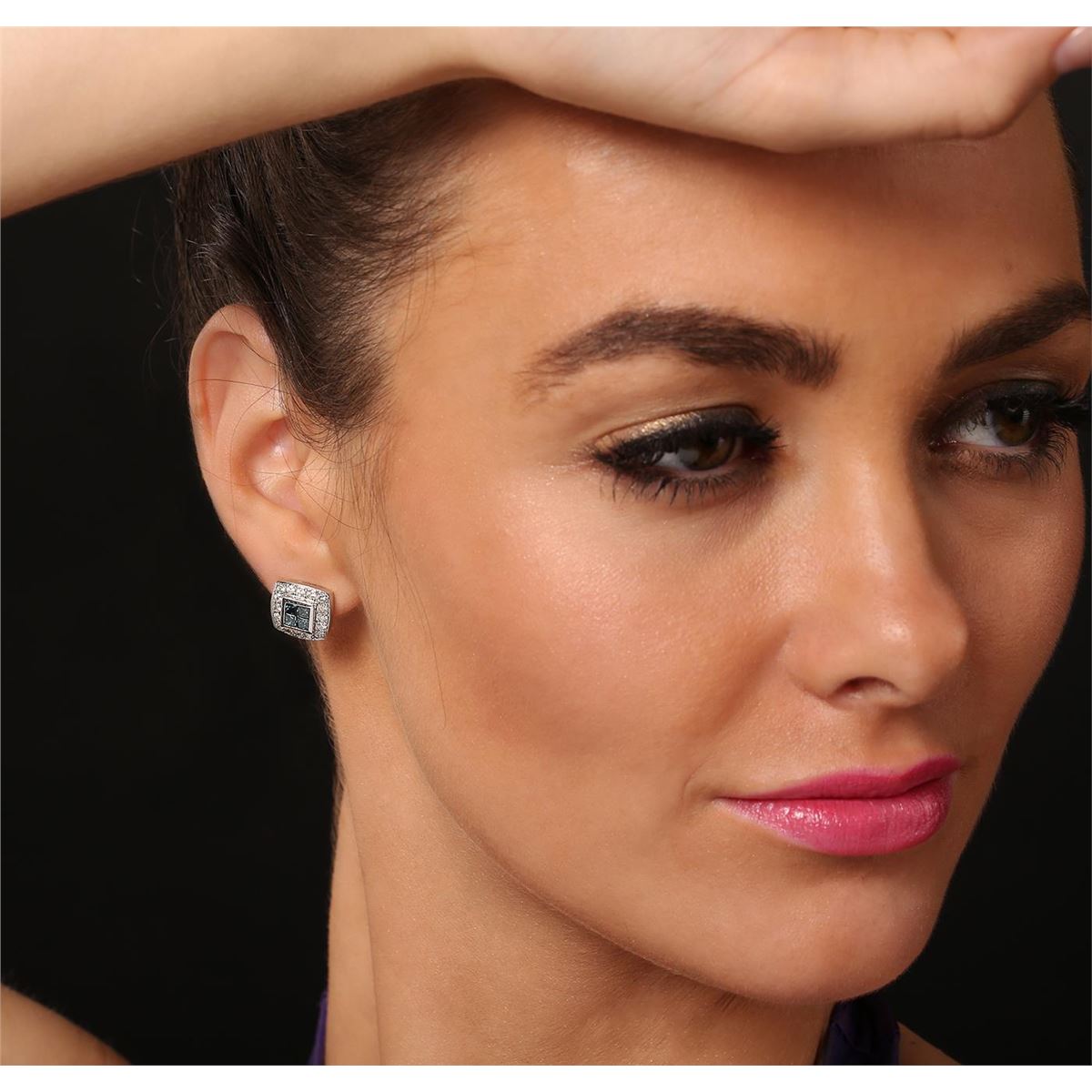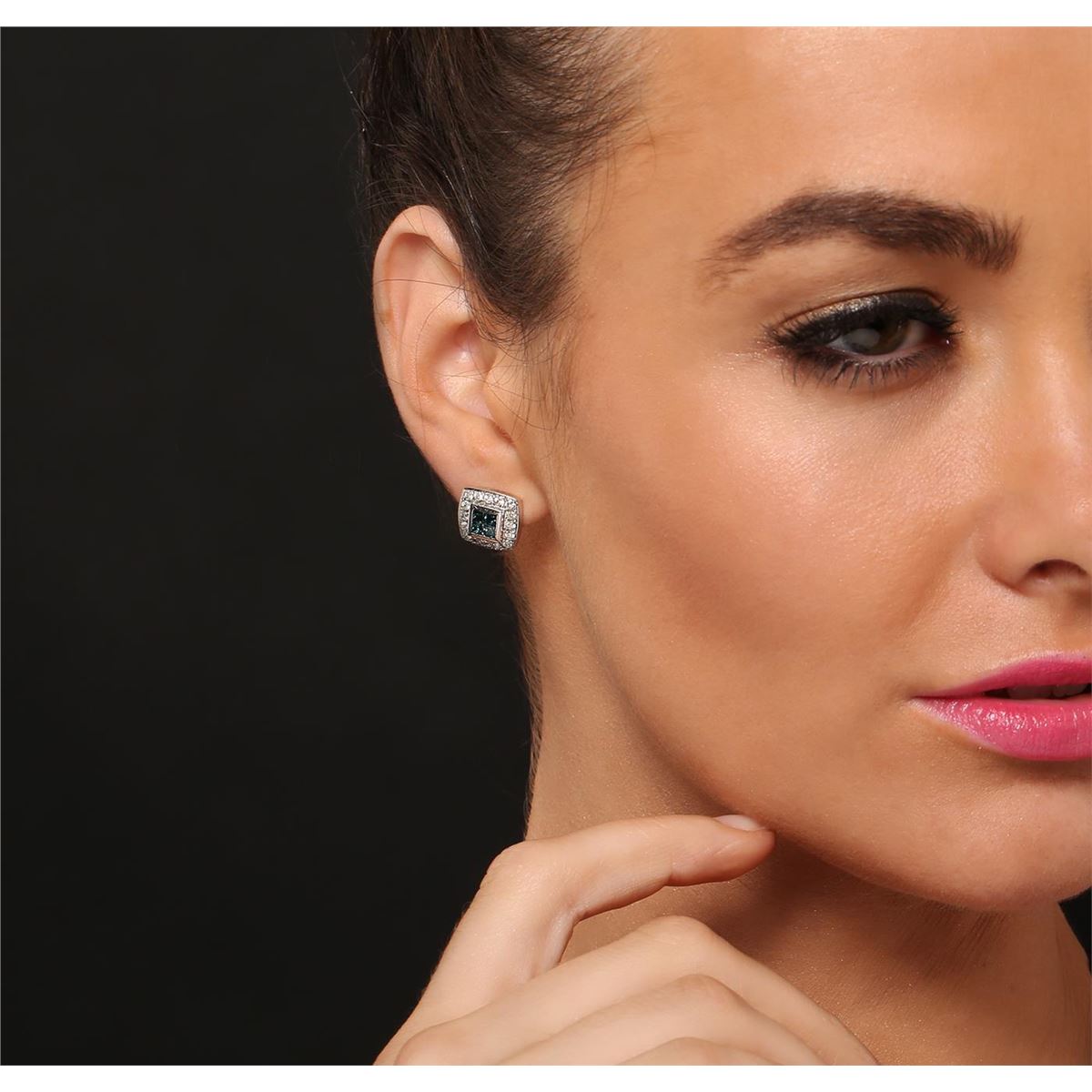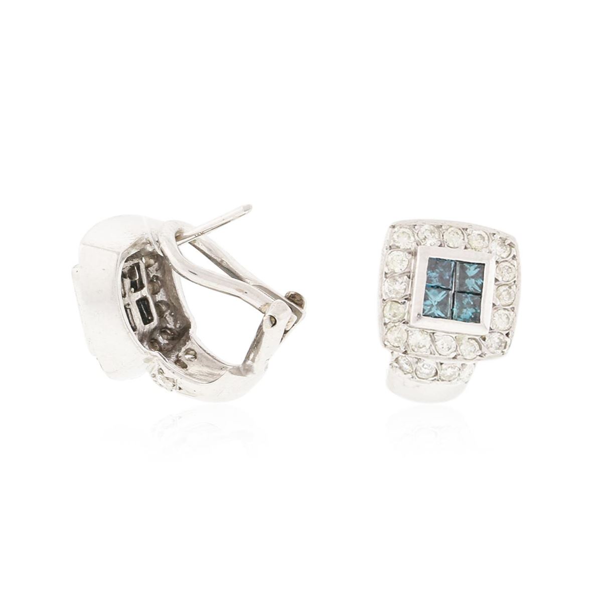 One pair electronically tested 14KT white gold ladies cast & assembled diamond earrings with omega backs. Condition is good. Bright polish finish. Identified with markings of "14K". Containing: Eight invisible set princess cut diamonds, measuring 2.50 x 2.50 x 1.88mm (depth est.) approximate total weight of 8 Stones = 0.81 ct. Indications of laboratory irradiated enhanced color. Measurements & the color grade are an average for the group. Graded in the setting. Clarity SI-1 to SI-2. Color Fancy Very Slightly Greenish Blue. Forty bead set round brilliant cut diamonds, measuring 1.80 - 1.70 x 1.05mm (depth est.) approximate total weight of 40 Stones = 0.83ct. Graded in the setting. Clarity I- 1 to 1-2. Color H - J. Total Weight of Diamonds 1.64ct. Total Weight of Earrings 7.90gm. AIG Appraised at $4,815.00.