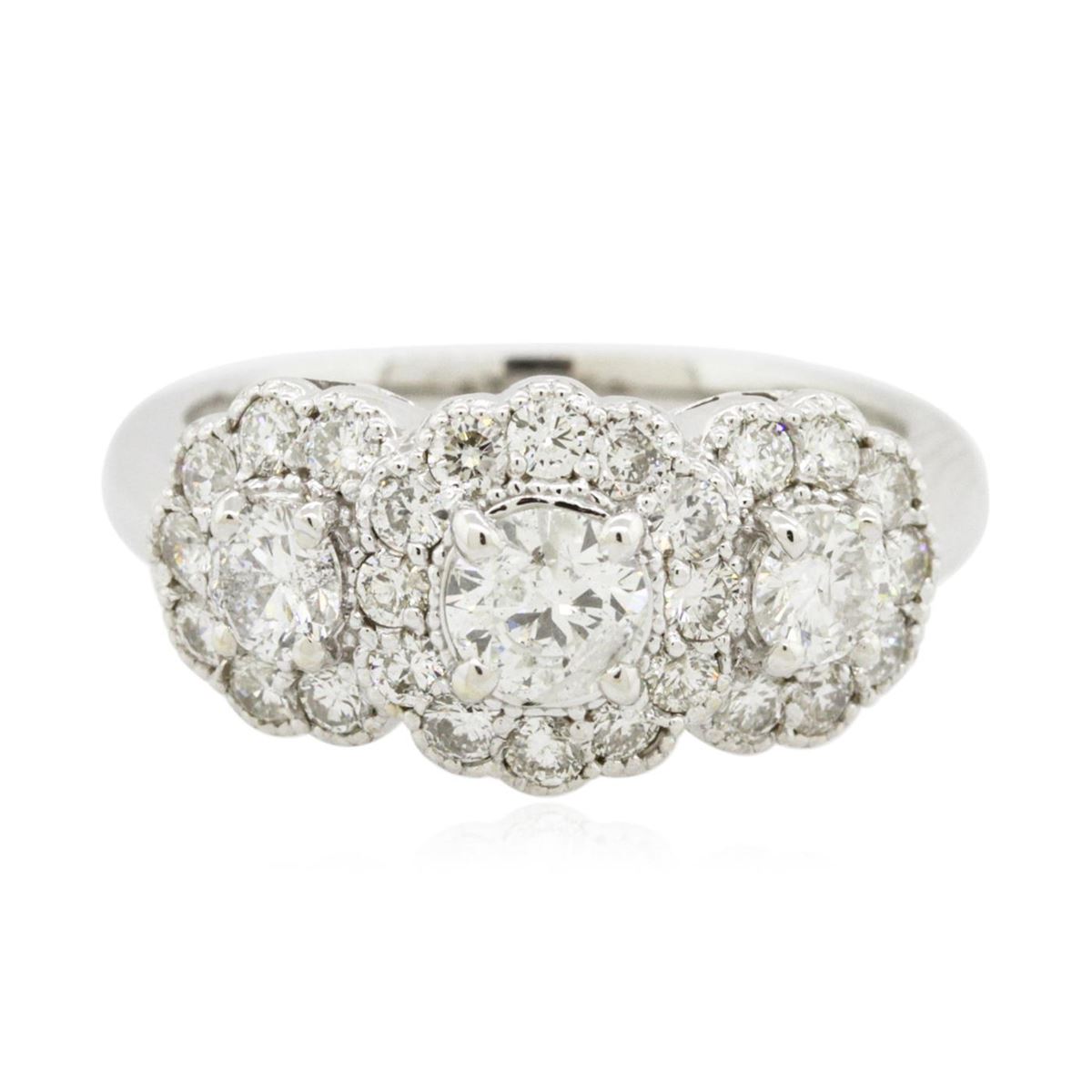 One electronically tested 14KT white gold ladies cast diamond ring. Condition is new, good workmanship. The ring features a trio of diamonds set within diamond set floral bezel, completed by a two and one-half millimeter wide band. Bright polish finish with milgrain detailing. Identified with markings of "K14". Containing: One prong set round brilliant cut diamond, measuring 4.80 - 4.75 x 2.80mm (depth est.) approximate weight of 0.48ct. Graded in the setting. Clarity: I-1. Color: J Two prong set round brilliant cut diamonds, measuring 3.70 - 3.65 x 2.21mm (depth est.) approximate. Total Weight of 2 Stones = 0.46ct. Color & clarity grade are an average for the pair. Graded in the setting. Clarity: I-1. Color: H Twenty-Six bezel set round brilliant cut diamonds, measuring 1.90 - 1.80 x 1.11mm (depth est.) approximate. Total Weight of 26 Stones = 0.70ct. Graded in the setting. Clarity: SI-1 to I-1. Color: G - I. Total Weight of Diamonds 1.64ct. Total Weight of Ring 4.93gm. AIG Appraised at $6,415.00.