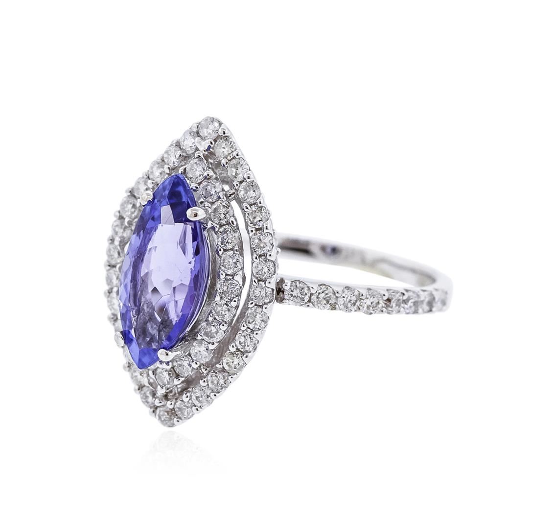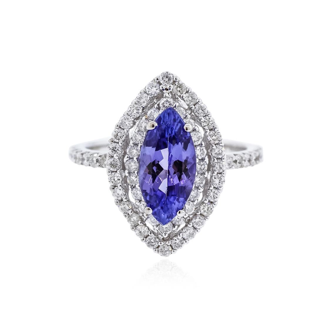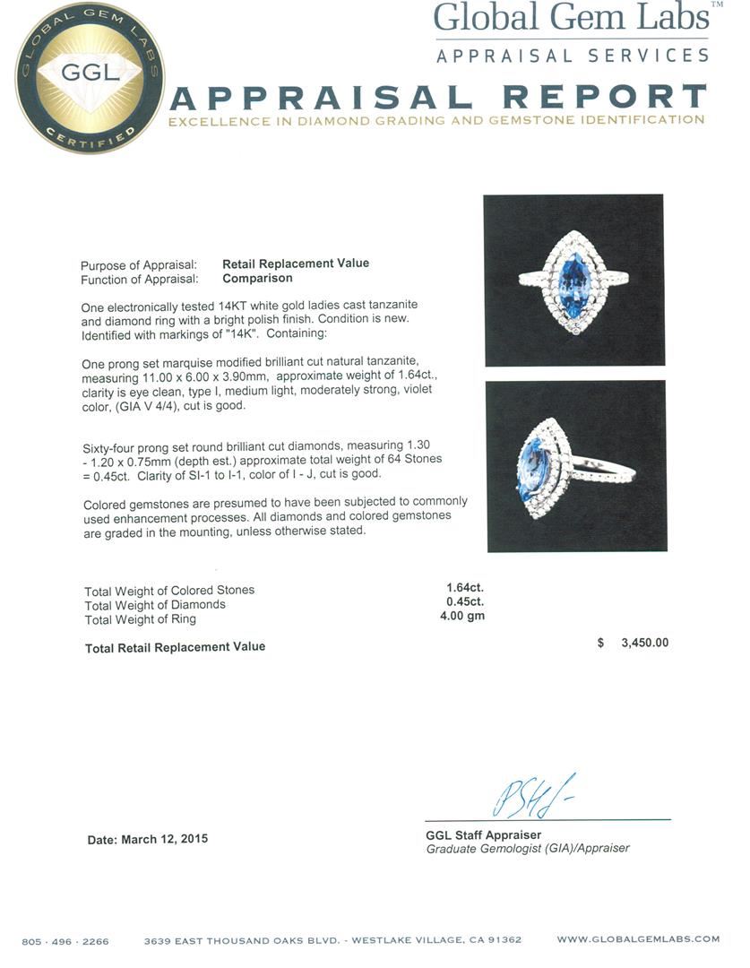One electronically tested 14KT white gold ladies cast tanzanite and diamond ring with a bright polish finish. Identified with markings of "14K". Condition is new. Containing: One prong set marquise modified brilliant cut natural tanzanite, measuring 11.00 x 6.00 x 3.90mm, approximate weight of 1.64ct., clarity is eye clean, type I, medium light, moderately strong, violet color, (GIA V 4/4), cut is good. Sixty-Four prong set round brilliant cut diamonds, measuring 1.30 - 1.20 x 0.75mm (depth est.) approximate total weight of 64 Stones = 0.45ct. Clarity: SI-1 to I-1. Color: I - J, Cut is Good. Colored gemstones are presumed to have been subjected to commonly used enhancement processes. All diamonds and colored gemstones are graded in the mounting, unless otherwise stated. Total Weight of Colored Stones 1.64ct. Total Weight of Diamonds 0.45ct. Total Weight of Ring 4.00 grams. GGL Appraised at $3,450.00.