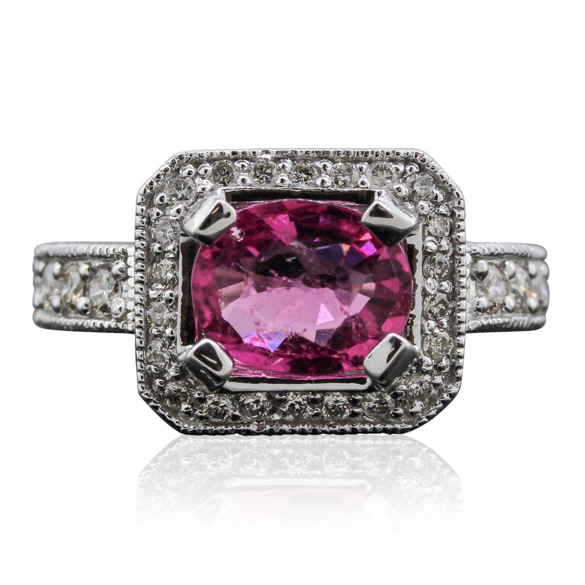 One electronically tested 14KT white gold ladies cast tourmaline and diamond ring. Condition is new, good workmanship. The featured tourmaline is set within a diamond bezel supported by diamond set shoulders, completed by a three millimeter wide band. Bright and patterned finish with milgrain detailing. Containing: One prong set oval mixed cut natural pink tourmaline, measuring 8.90 x 7.10 x 3.80mm, 10%. bulge factor, approximate weight of 1.64ct., clarity is moderately included, type II, medium, very slightly brownish, strongly purplish red color, (GIA stpR 5/3), cut is good. Transmitting light with a minimum of distortion, transparent, Naturally occurring internal & external characteristics are present, Refractive index testing results of 1.62 to 1.64. This is a conclusive result for tourmaline. Graded in the setting. Eight bead set round brilliant cut diamonds, measuring 2.20 - 2.10 x 1.29mm (depth est.) approximate. Total Weight of 8 Stones = 0.35ct. Graded in the setting. Clarity: SI-1 to I-1. Color: G - H Twenty-Two bead set round brilliant cut diamonds, measuring 1.60 - 1.50 x 0.93mm (depth est.) approximate. Total Weight of 22 Stones = 0.35ct. Graded in the setting. Clarity: SI-1 to I-1. Color: G - I. Total Weight of Colored Stones 1.64ct. Total Weight of Diamonds 0.70ct. Total Weight of Ring 7.47 grams. AIG Appraised at $4,365.00.
