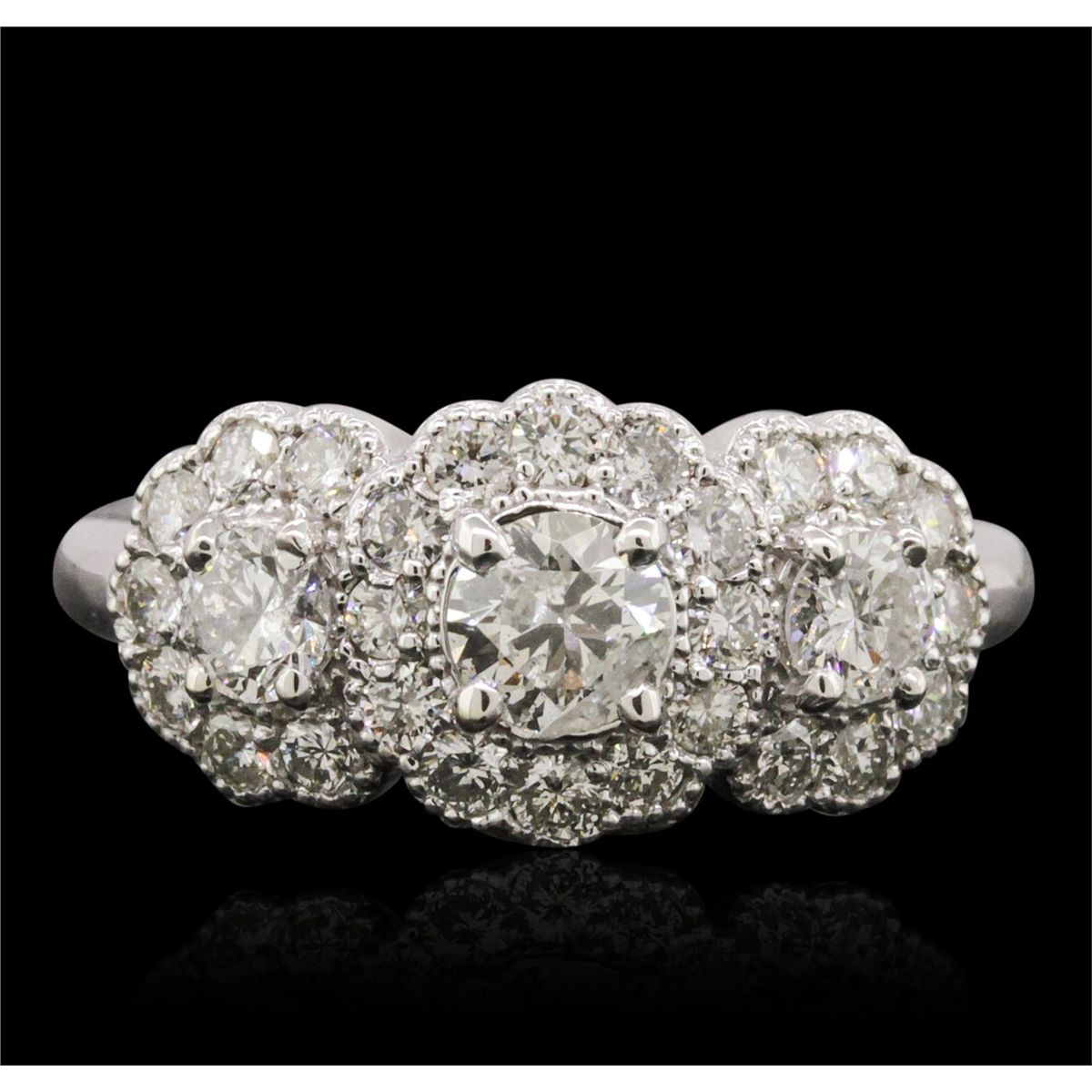 One electronically tested 14KT white gold ladies cast diamond ring. Condition is new, good workmanship. The ring features a trio of diamonds set within diamond set floral bezel, completed by a two and one-half millimeter wide band. Bright polish finish with milgrain detailing. Identified with markings of "K14". Containing: One prong set round brilliant cut diamond, measuring 4.80 - 4.75 x 2.80mm (depth est.) approximate weight of 0.48ct. Graded in the setting. Clarity: I-1. Color: J Two prong set round brilliant cut diamonds, measuring 3.70 - 3.65 x 2.21mm (depth est.) approximate. Total Weight of 2 Stones = 0.46ct. Color & clarity grade are an average for the pair. Graded in the setting. Clarity: I-1. Color: H Twenty-Six bezel set round brilliant cut diamonds, measuring 1.90 - 1.80 x 1.11mm (depth est.) approximate. Total Weight of 26 Stones = 0.70ct. Graded in the setting. Clarity: SI-1 to I-1. Color: G - I. Total Weight of Diamonds 1.64ct. Total Weight of Ring 4.93gm. AIG Appraised at $6,415.00.