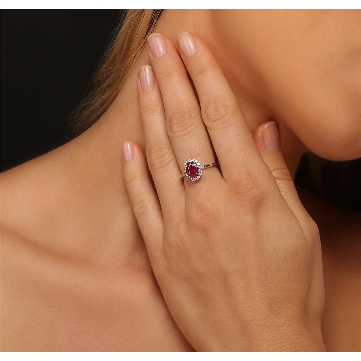 One electronically tested 14KT white gold ladies combination cast & assembled ring with a bright polish finish. Condition is new. Identified with markings of "14K". Containing: One prong set oval modified brilliant cut natural ruby, measuring 8.10 x 6.10 x 4.10mm, approximate weight of 1.65ct., clarity is heavily included, type II, medium, moderately strong, strongly purplish red color, (GIA stpR 5/4), cut is good. Sixteen prong set round brilliant cut diamonds, measuring 1.30 - 1.30 x 0.78mm (depth est.) approximate total weight of 16 Stones = 0.13ct. Clarity: SI-2 to I-1. Color: I - J, Cut is Good. Colored gemstones are presumed to have been subjected to commonly used enhancement processes. All diamonds and colored gemstones are graded in the mounting, unless otherwise stated. Total Weight of Colored Stones 1.65ct. Total Weight of Diamonds 0.13ct. Total Weight of Ring 2.40 grams. GGL Appraised at $2,735.00.