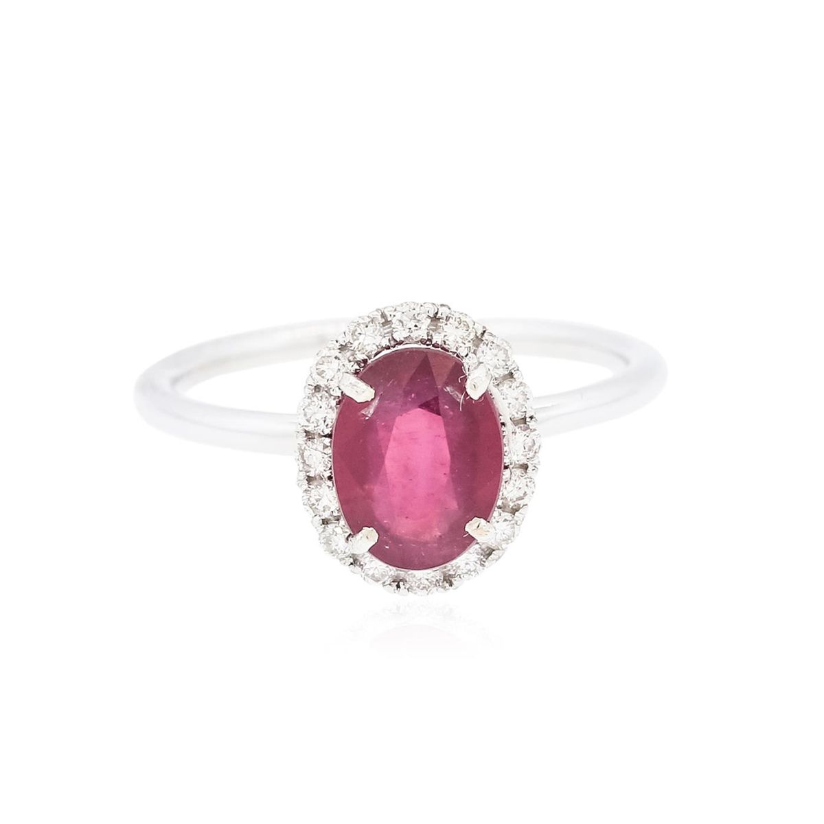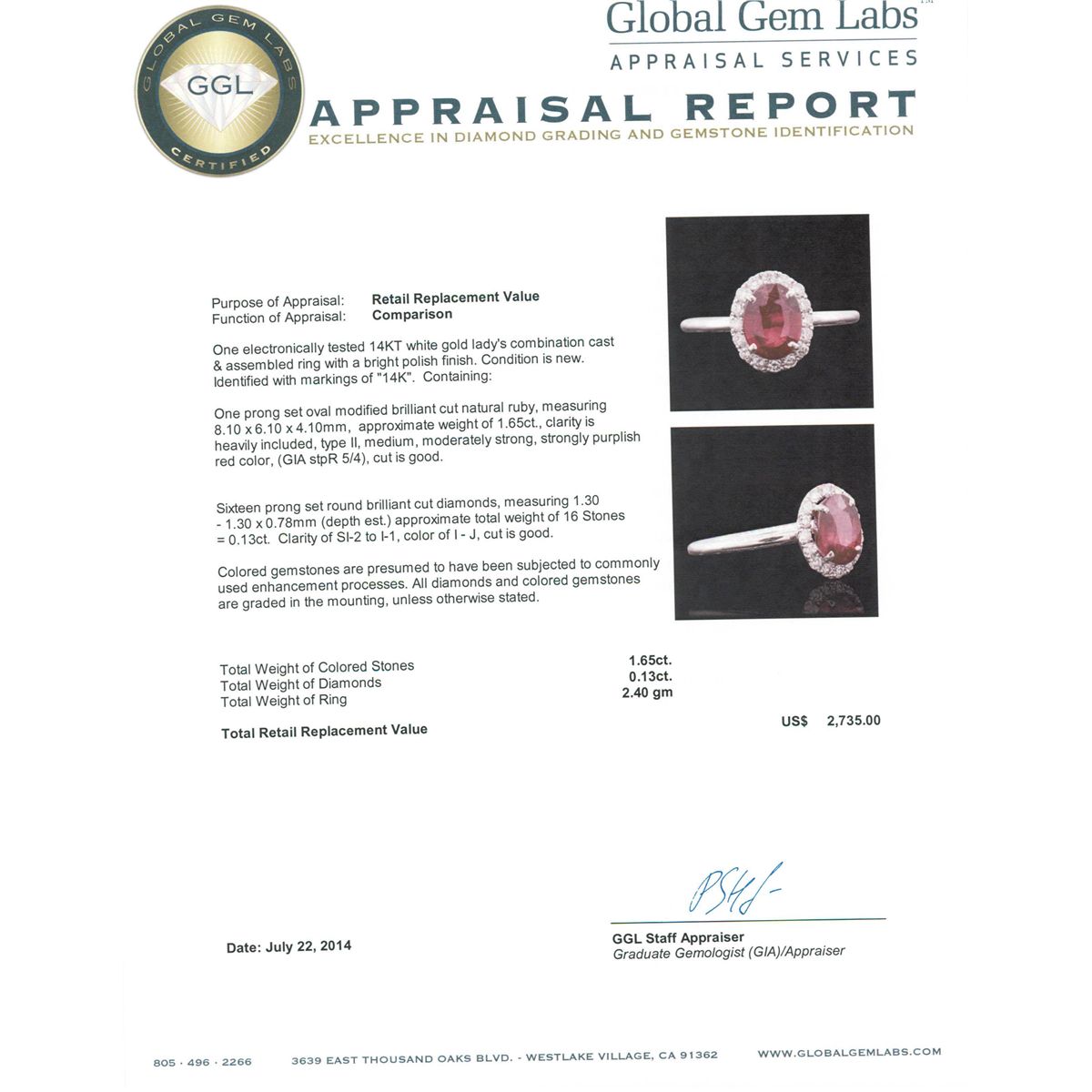 One electronically tested 14KT white gold ladies combination cast & assembled ring with a bright polish finish. Condition is new. Identified with markings of "14K". Containing: One prong set oval modified brilliant cut natural ruby, measuring 8.10 x 6.10 x 4.10mm, approximate weight of 1.65ct., clarity is heavily included, type II, medium, moderately strong, strongly purplish red color, (GIA stpR 5/4), cut is good. Sixteen prong set round brilliant cut diamonds, measuring 1.30 - 1.30 x 0.78mm (depth est.) approximate total weight of 16 Stones = 0.13ct. Clarity: SI-2 to I-1. Color: I - J, Cut is Good. Colored gemstones are presumed to have been subjected to commonly used enhancement processes. All diamonds and colored gemstones are graded in the mounting, unless otherwise stated. Total Weight of Colored Stones 1.65ct. Total Weight of Diamonds 0.13ct. Total Weight of Ring 2.40 grams. GGL Appraised at $2,735.00.