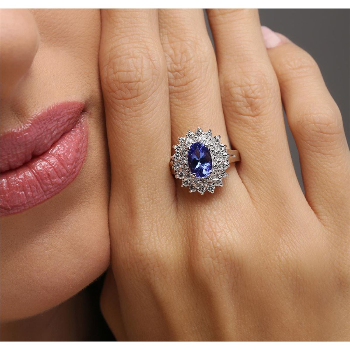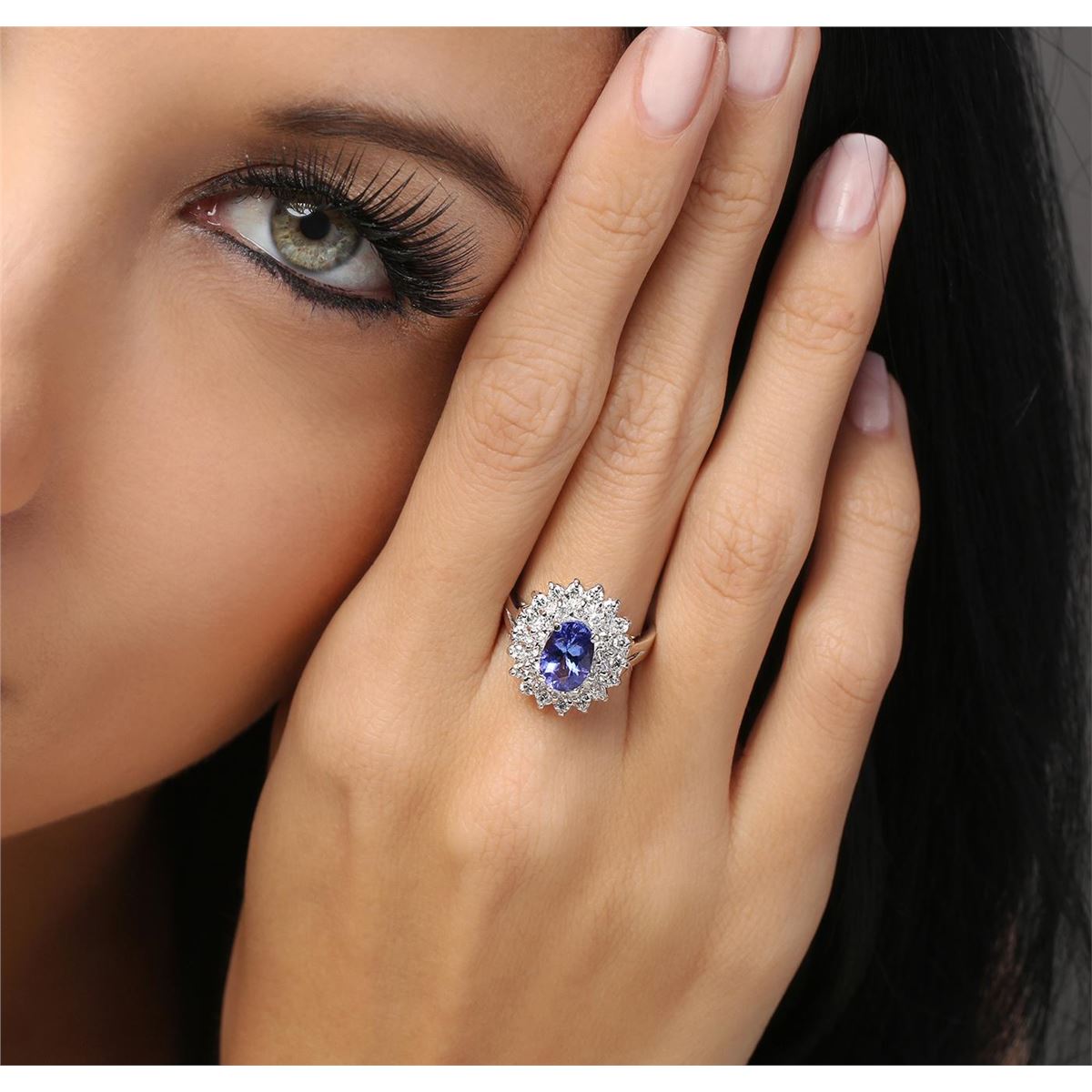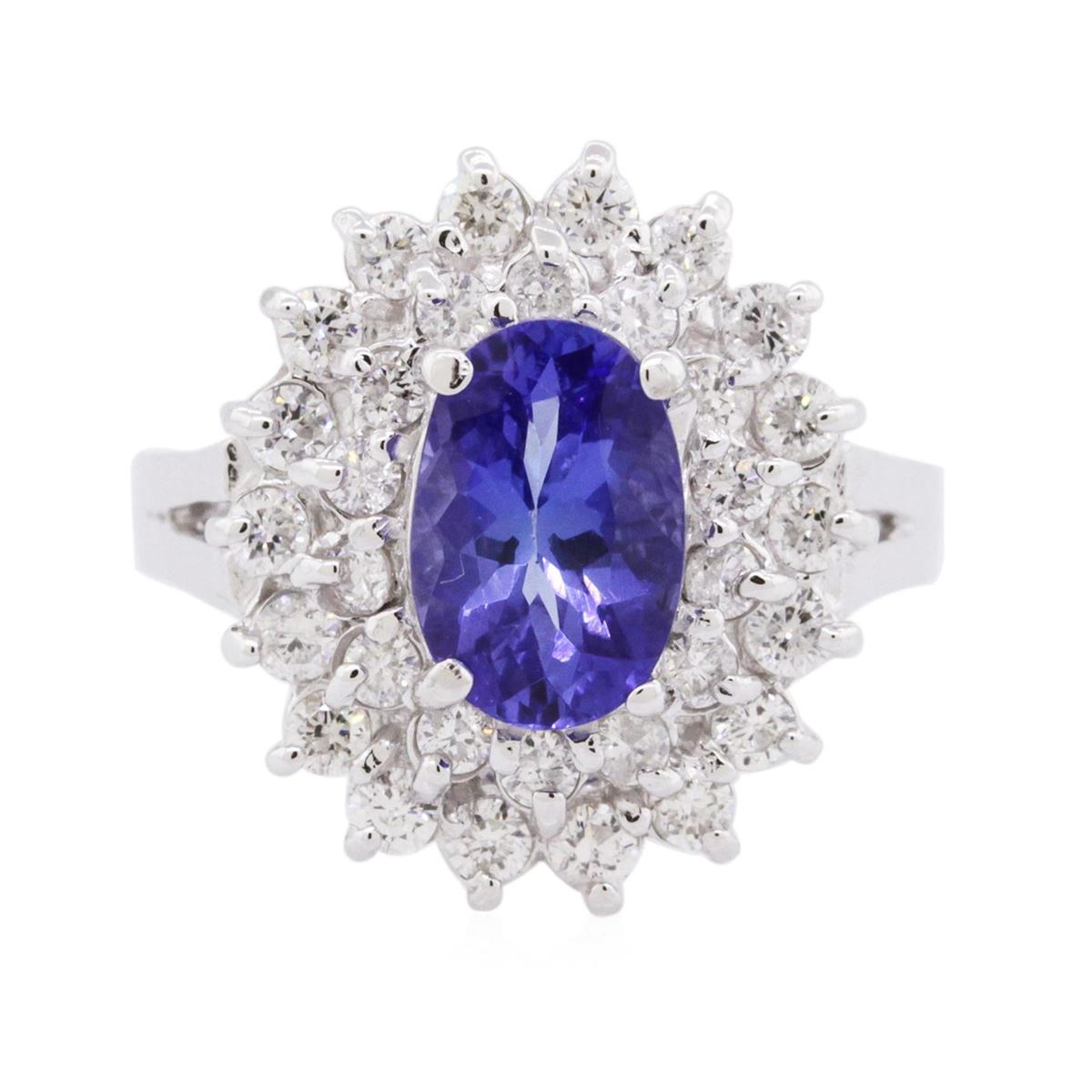 One electronically tested 14KT white gold ladies cast tanzanite & diamond ring with a bright finish. The featured tanzanite is set within a tiered diamond bezel, supported by a ribbed under gallery, completed by a three millimeter wide band. Identified with markings of "14K". Condition is new, good workmanship. Containing: One prong set oval brilliant cut natural tanzanite, measuring 9.00 x 6.00 x 4.38mm, approximate weight of 1.65ct., clarity is eye clean, type I, dark, slightly grayish, bluish violet color, (GIA bV 7/2), cut is good. Transmitting light with no distortion, transparent. Graded in the setting. Tanzanite is a very rare gemstone that is only found in the country of Tanzania. Originally discovered in 1967. Tiffany & Company, named the stone Tanzanite. It is found in the Usumburu Mountains that border the Umba Valley of northern Tanzania. Tanzanite occurs in gray, brown, violet, blue, reddish-purple, & green. The gem is interesting because of its exceptional pleochroism. Rotated in different directions a tanzanite will exhibit multiple changes of color. Tanzanite has a low tolerance to ultrasonic cleaning, and should not be cleaned using this method. Thirty-Two prong set round brilliant cut diamonds, measuring 2.00 - 1.70 x 1.11mm (depth est.) approximate total weight of 32 Stones = 0.76ct. Graded in the setting. Clarity: SI-2 to I-2. Color: H - I. Total Weight of Colored Stones 1.65ct. Total Weight of Diamonds 0.76ct. Total Weight of Ring 5.61 grams. AIG Appraised at $4,580.00.