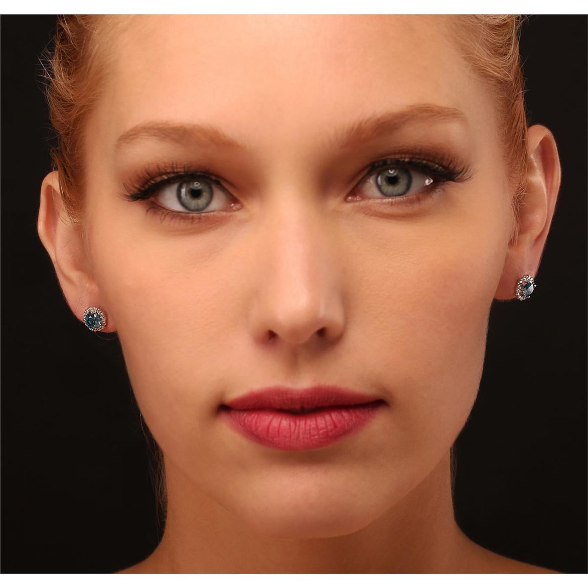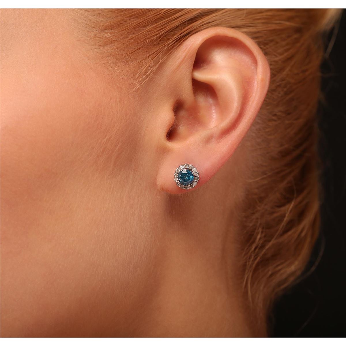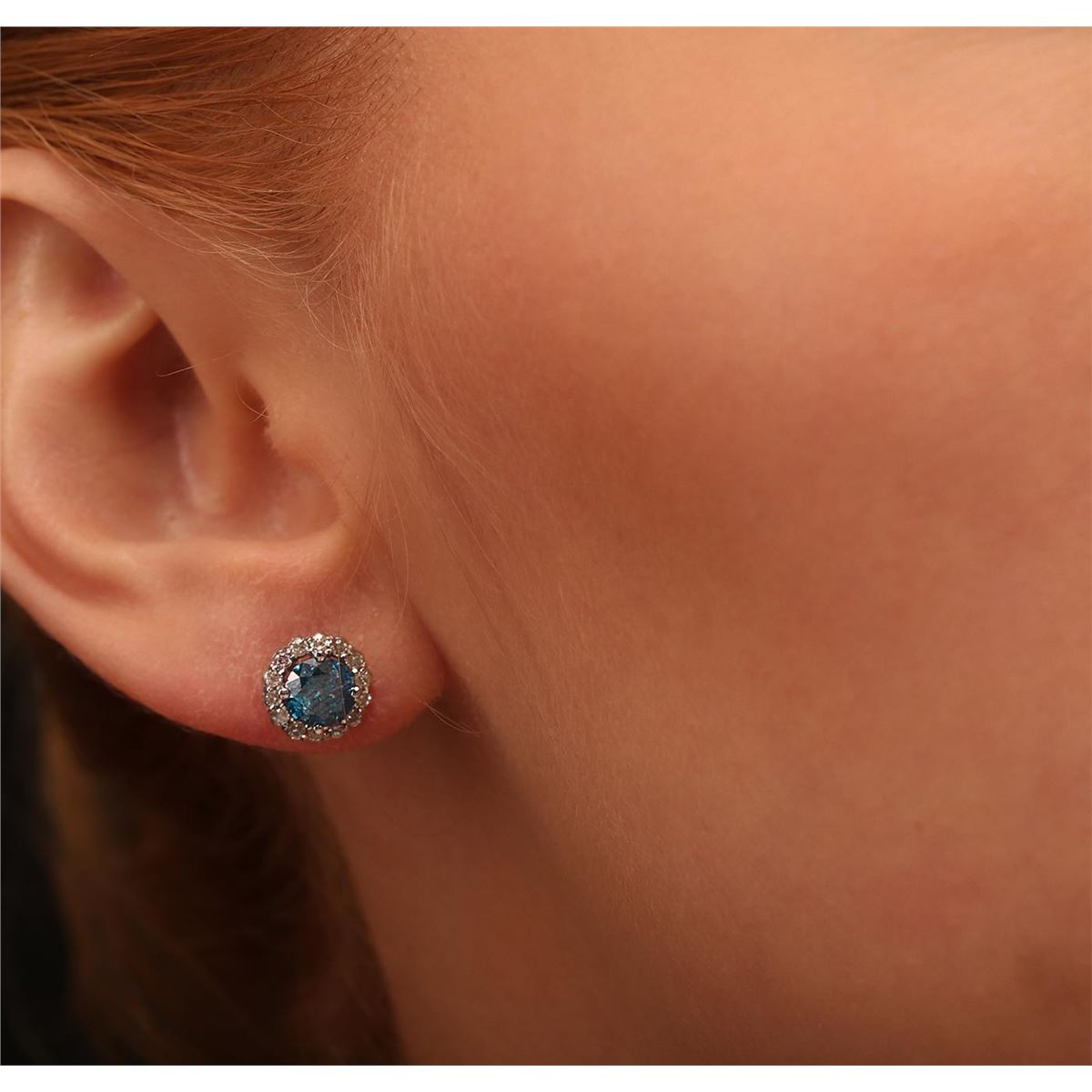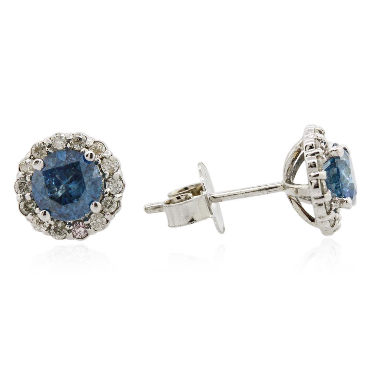 One pair electronically tested 14KT white gold cast diamond earrings with standard backs. Condition is new, good workmanship. Each earring features a diamond set within a diamond bezel. Bright polish finish. Containing: Two prong set round brilliant cut diamonds, measuring 5.60 - 5.50 x 3.33mm (depth est.) approximate. Total Weight of 2 Stones = 1.25ct. Color grade is an average for the pair. Indications of laboratory irradiated enhanced color. Graded in the setting. Clarity: I-1 to I-2 Twenty-Eight prong set round brilliant cut diamonds, measuring 1.50 - 1.40 x 0.87mm (depth est.) approximate. Total Weight of 28 Stones = 0.40ct. Graded in the setting. Clarity: I-1 to I-2. Color: H - J. Total Weight of Diamonds 1.65ct. Total Weight of Earrings 2.04 grams. AIG Appraised at $5,540.00.