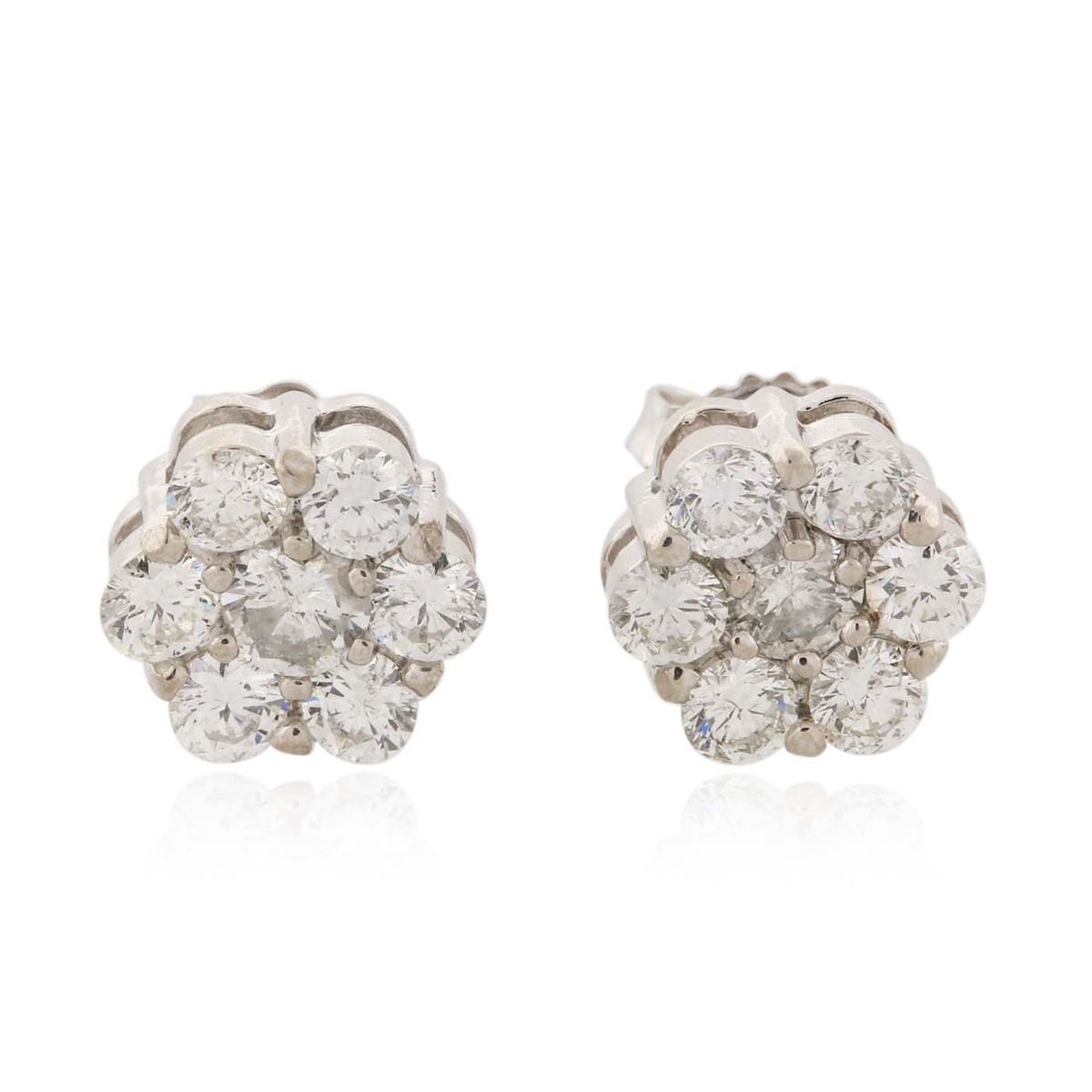 One pair electronically tested 14KT white gold ladies combination cast & assembled stud earrings with friction posts with a bright polish finish. Condition is new. Identified with markings of "14K". Containing: Two prong set round brilliant cut diamonds, measuring 4.00 - 4.00 x 2.40mm (depth est.) approximate. Total Weight of 2 Stones = 0.47ct. Clarity: SI-2. Color: J, Cut is Good. Twelve prong set round brilliant cut diamonds, measuring 3.00 - 3.00 x 1.80mm (depth est.) approximate. Total Weight of 12 Stones = 1.19ct. Clarity: SI-1 to SI-2. Color: I - J, Cut is Good. All diamonds are graded in the mounting, unless otherwise stated. Total Weight of Diamonds 1.65ct. Total Weight of Earrings 3.00 grams. GGL Appraised at $5,640.00.