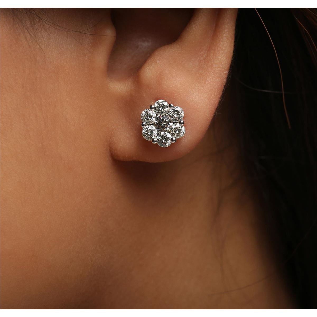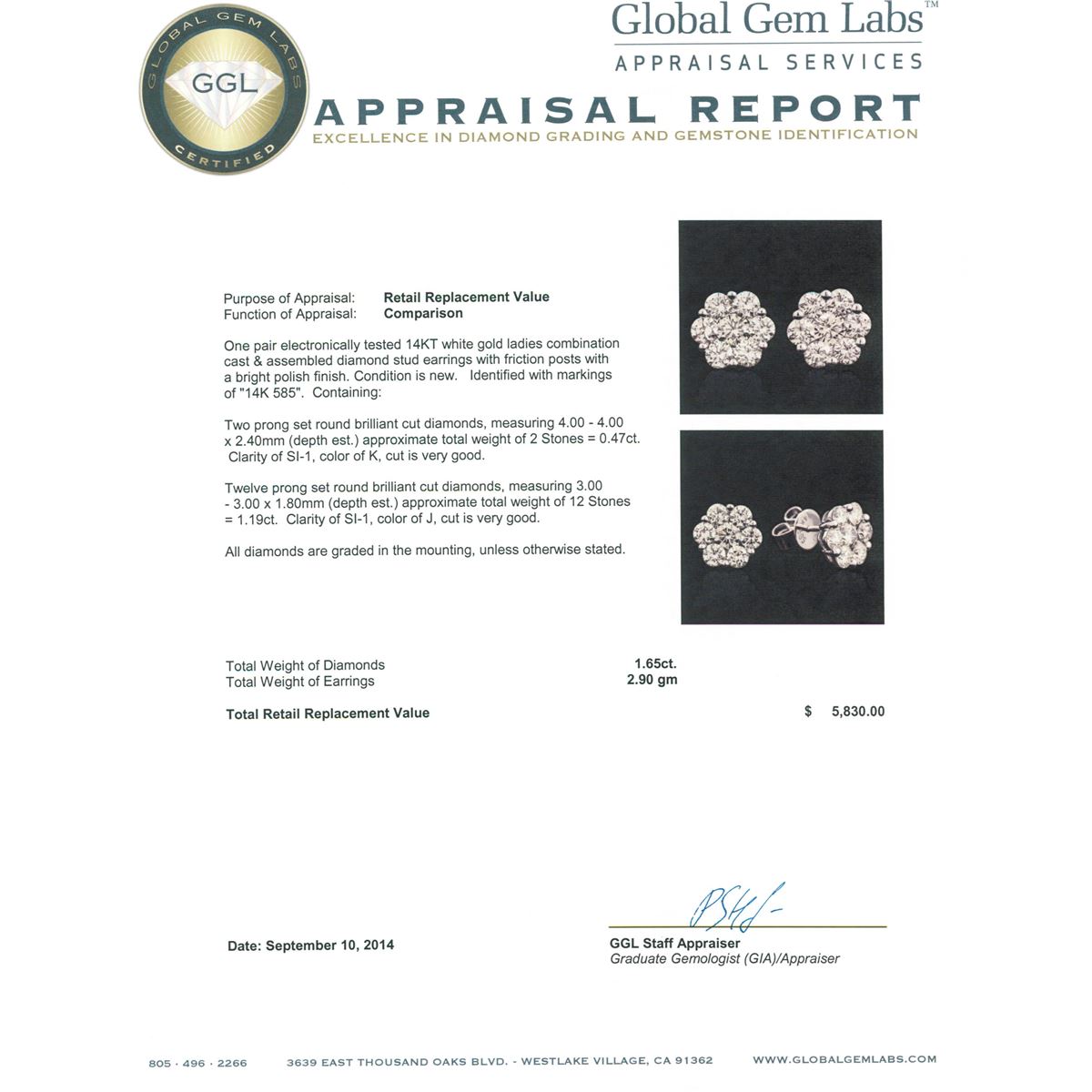 One pair electronically tested 14KT white gold ladies combination cast & assembled diamond stud earrings with friction posts with a bright polish finish. Identified with markings of "14K 585". Condition is new. Containing: Two prong set round brilliant cut diamonds, measuring 4.00 - 4.00 x 2.40mm (depth est.) approximate total weight of 2 Stones = 0.47ct. Clarity: SI-1. Color: K, Cut is Very Good. Twelve prong set round brilliant cut diamonds, measuring 3.00 - 3.00 x 1.80mm (depth est.) approximate total weight of 12 Stones = 1.19ct. Clarity: SI-1. Color: J, Cut is Very Good. All diamonds are graded in the mounting, unless otherwise stated. Total Weight of Diamonds 1.65ct. Total Weight of Earrings 2.90 grams. GGL Appraised at $5,830.00.